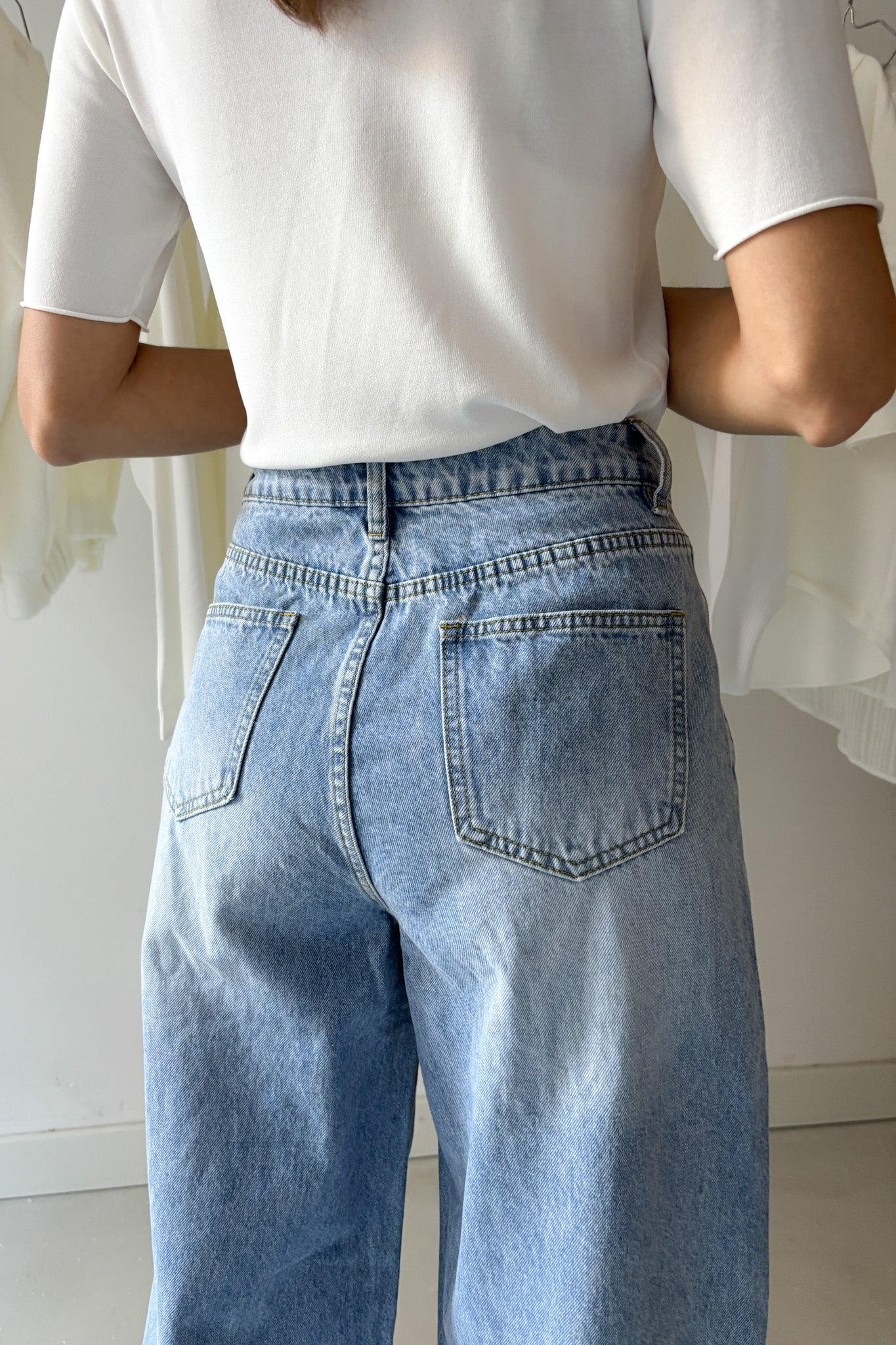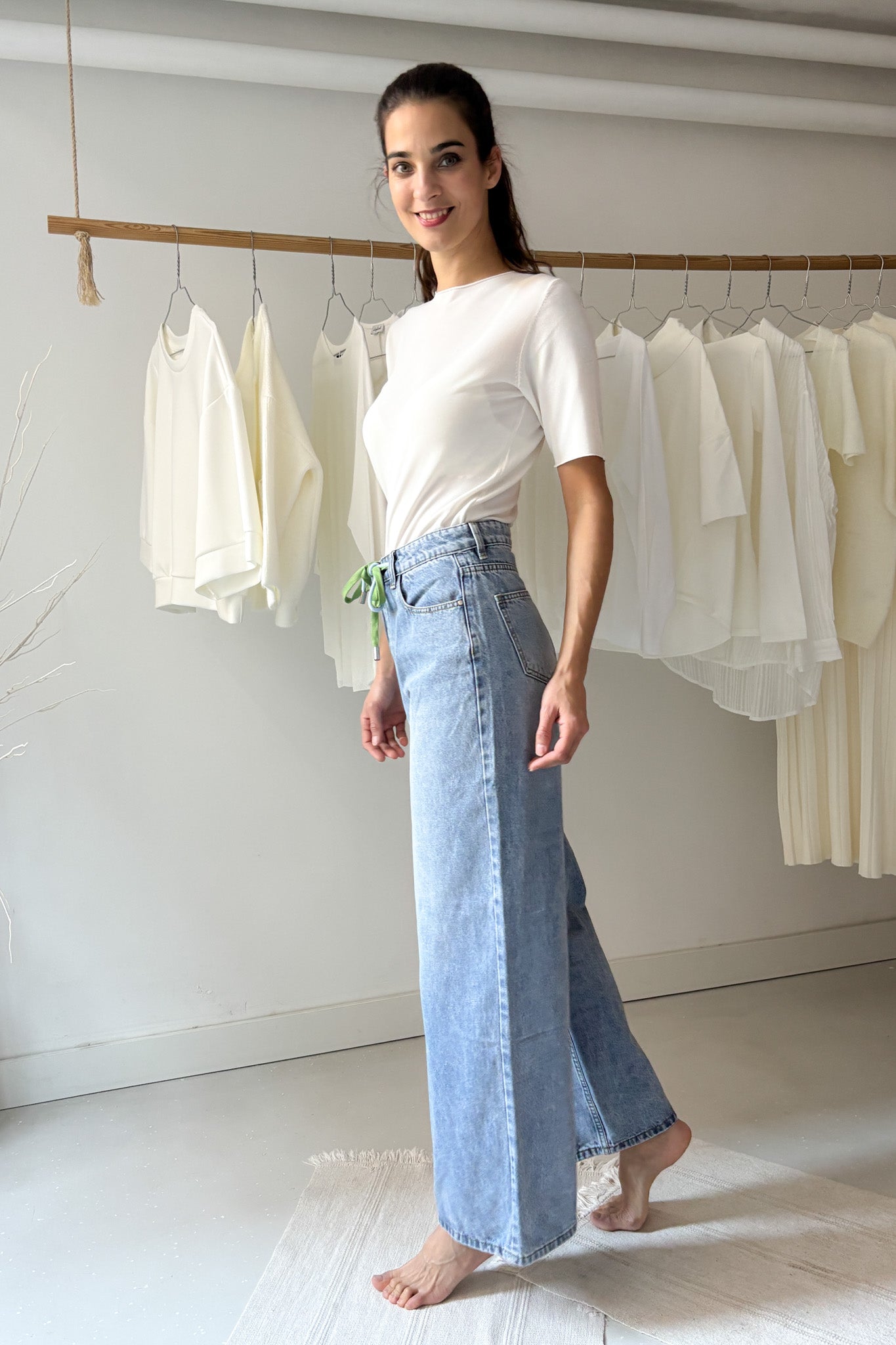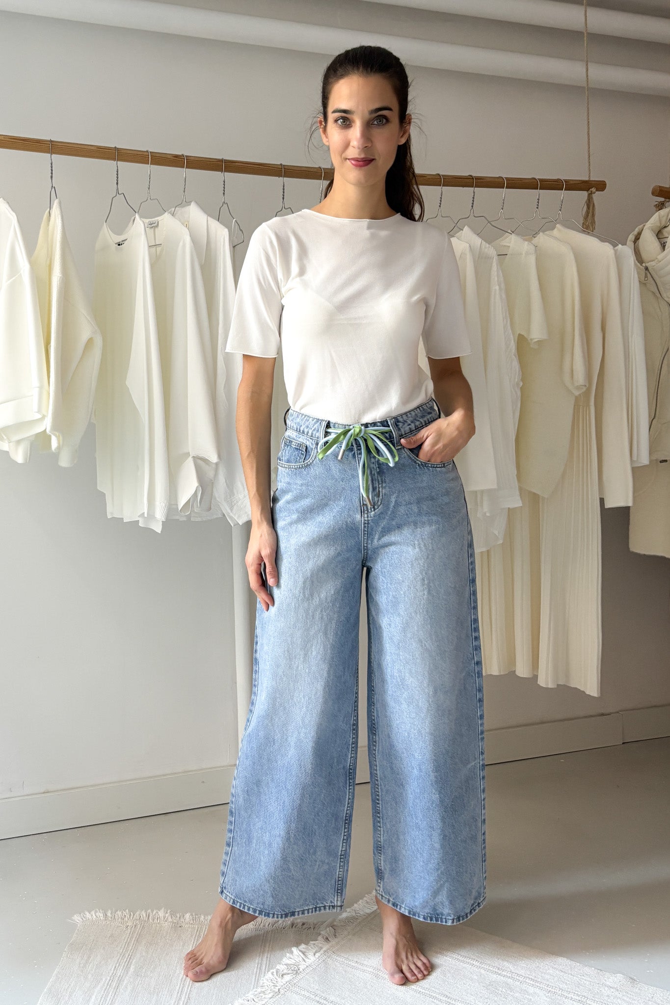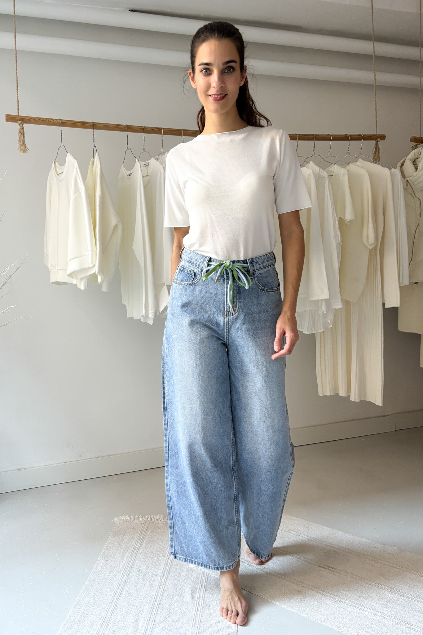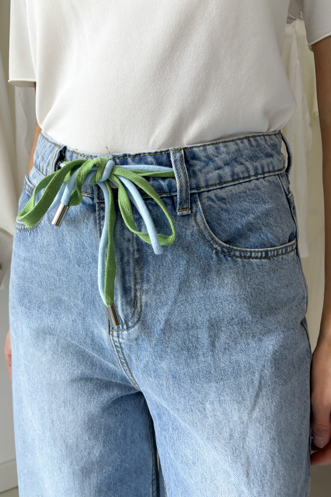 Egyenesszárú farmernadrág színes kötőkkel. Zsebes, bőszárú fazon.