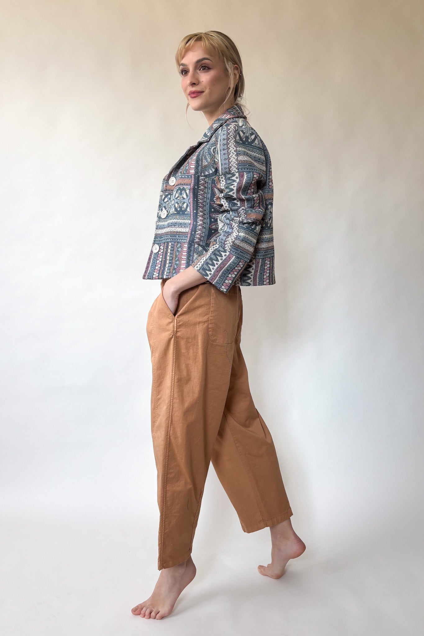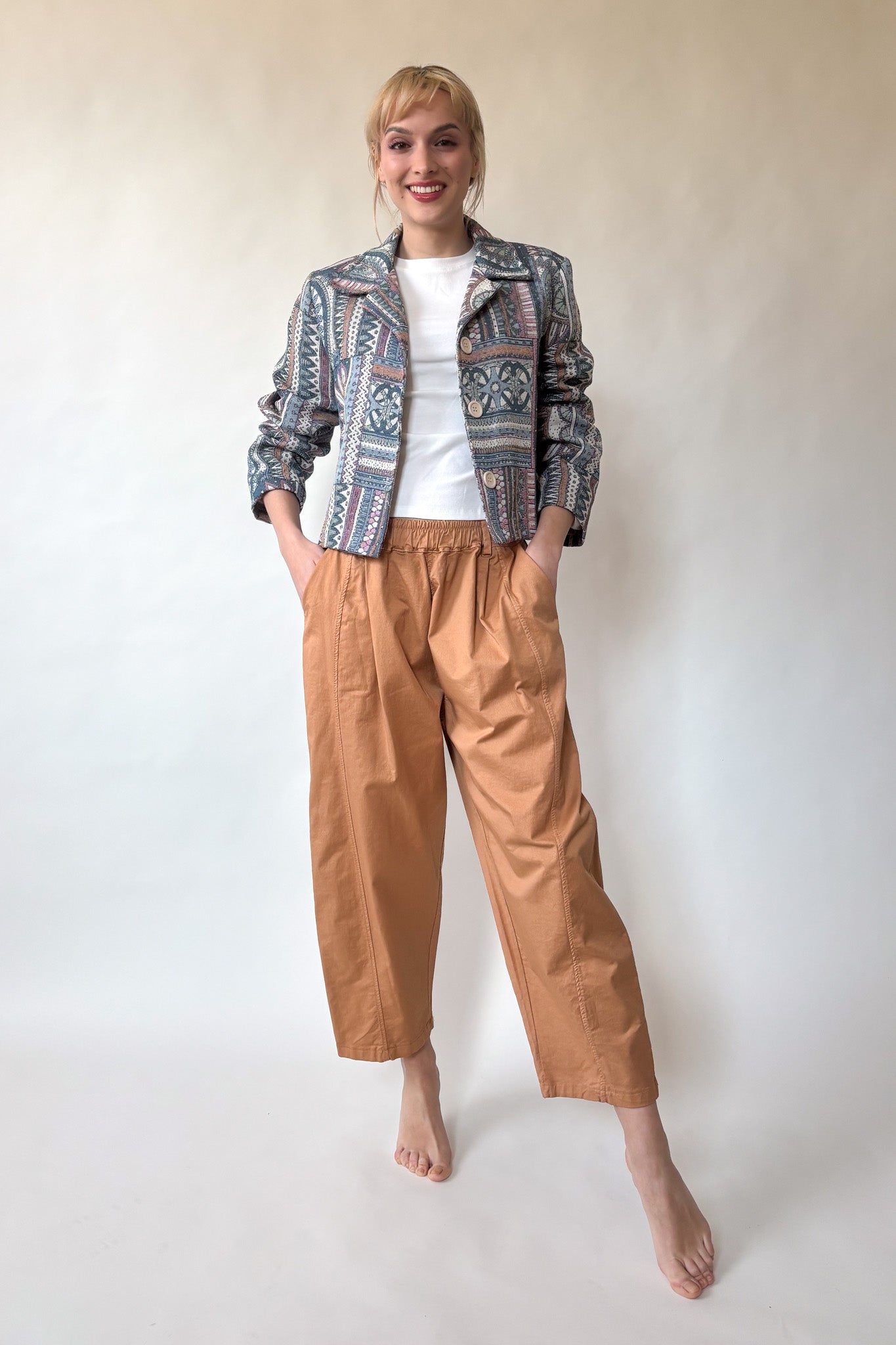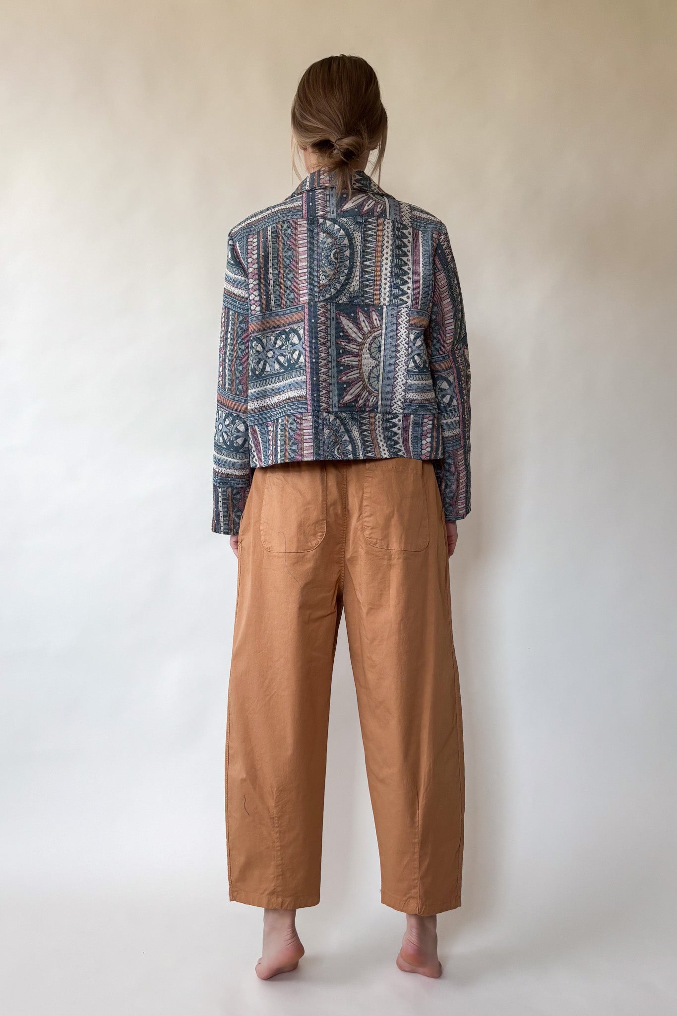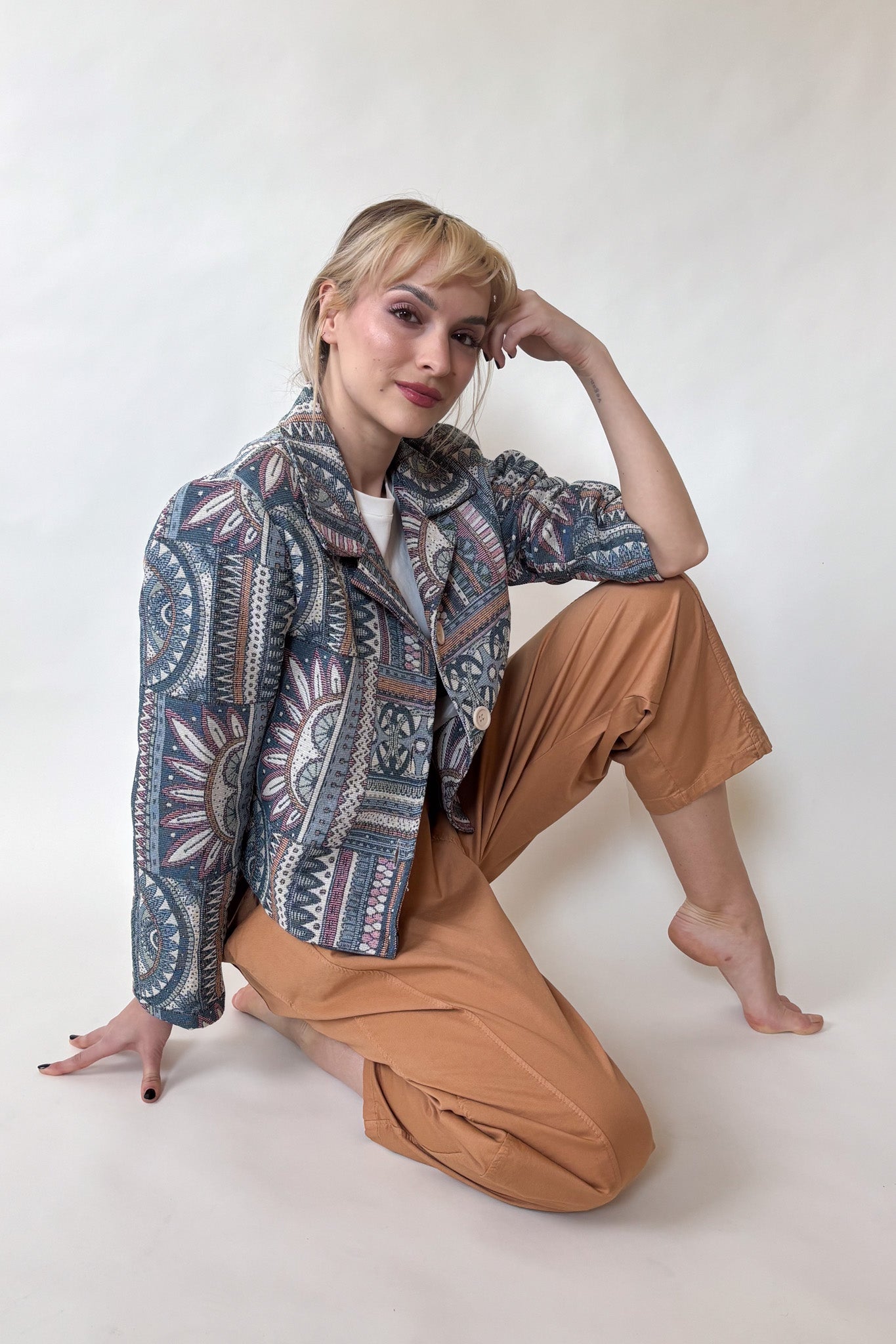 Színes, gallérral ellátott zakó. Rövidállású, középen összefogható.
