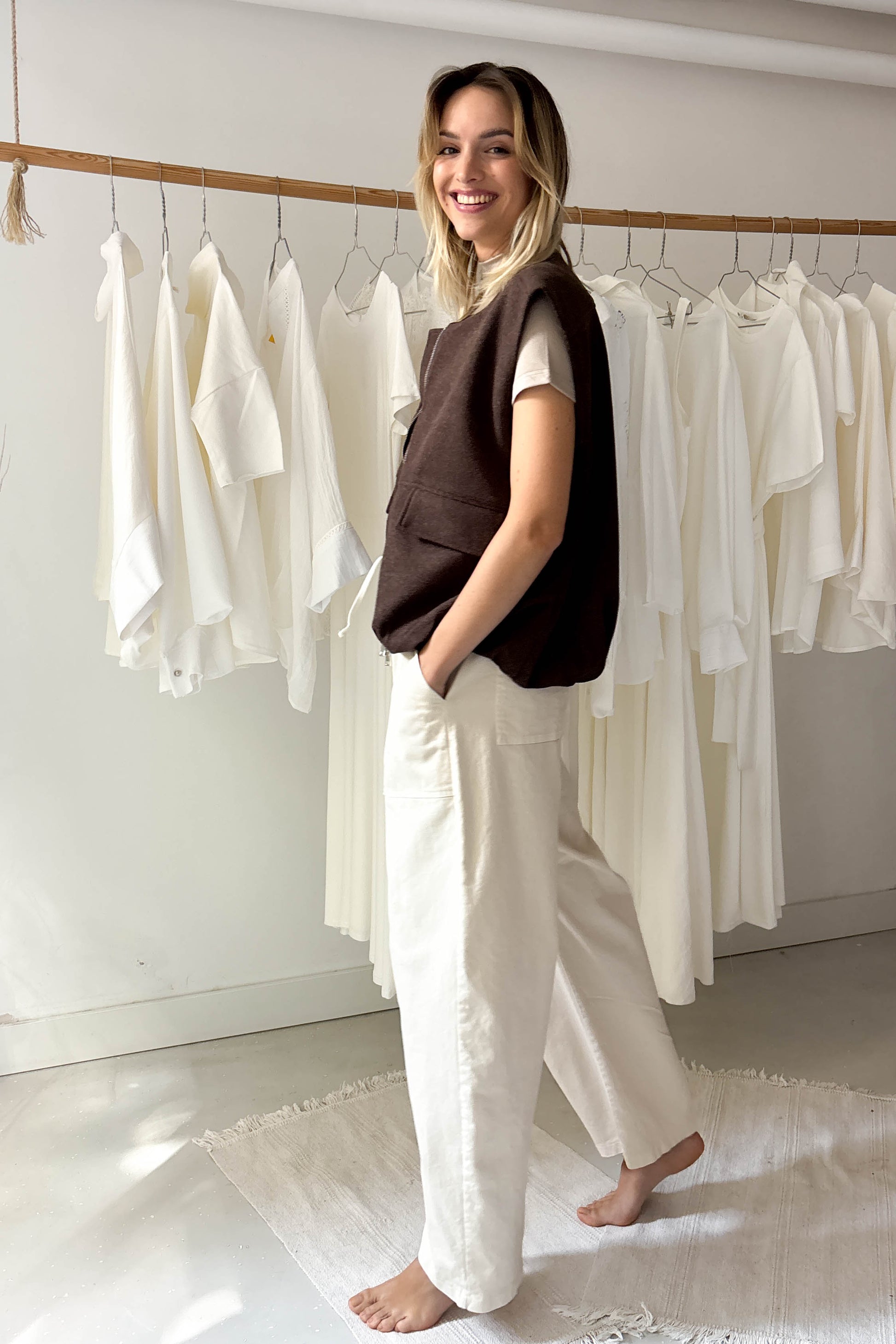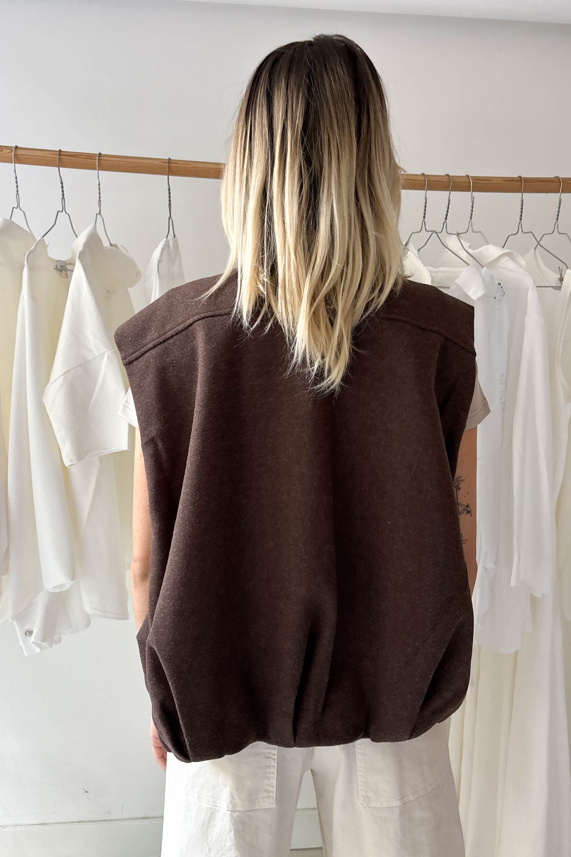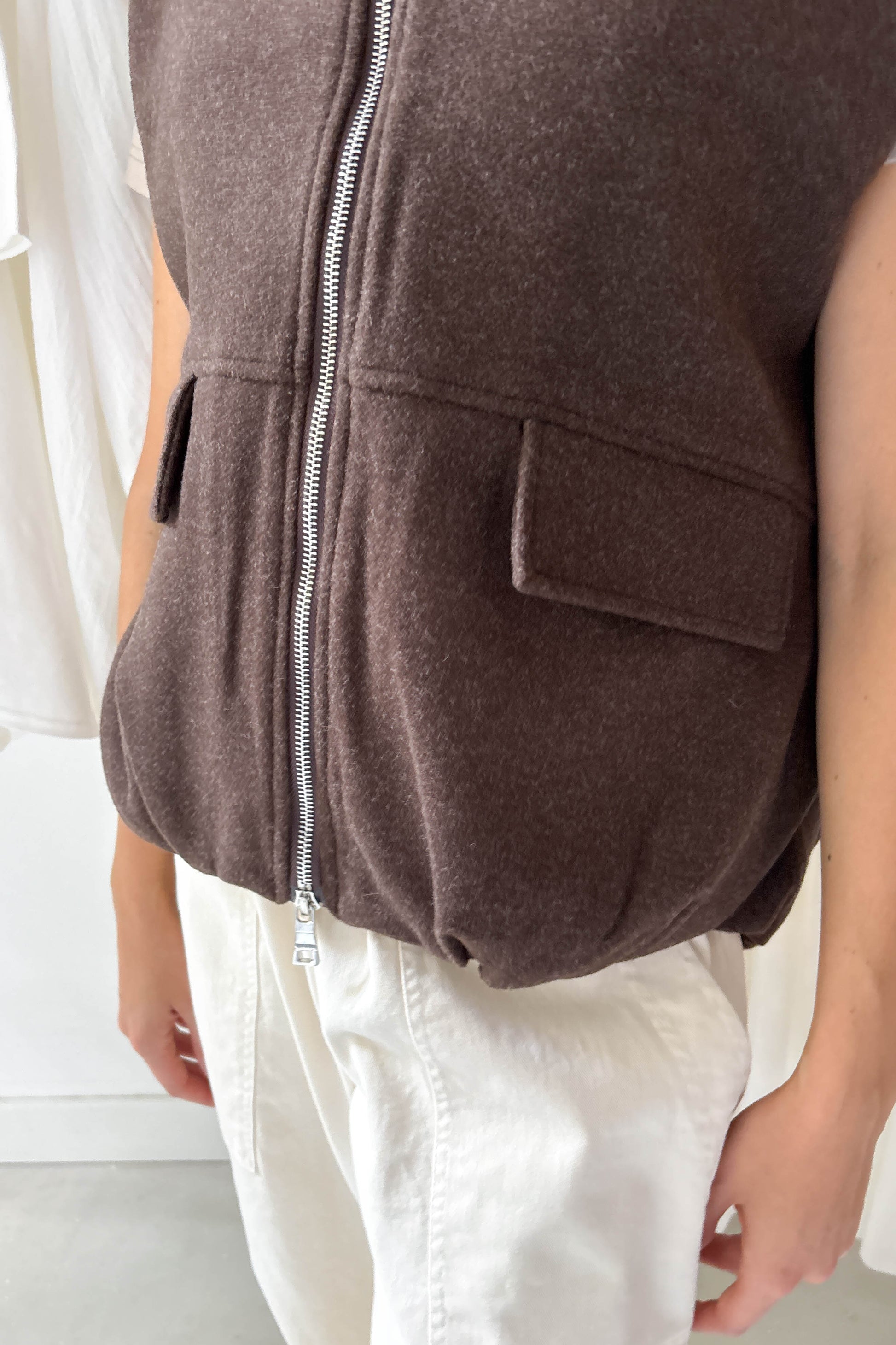 Cipzáros, alul hajtásos és buggyos, bélelt szövet mellény, wenge színben. Derékrészen elől két zsebbel van ellátva.