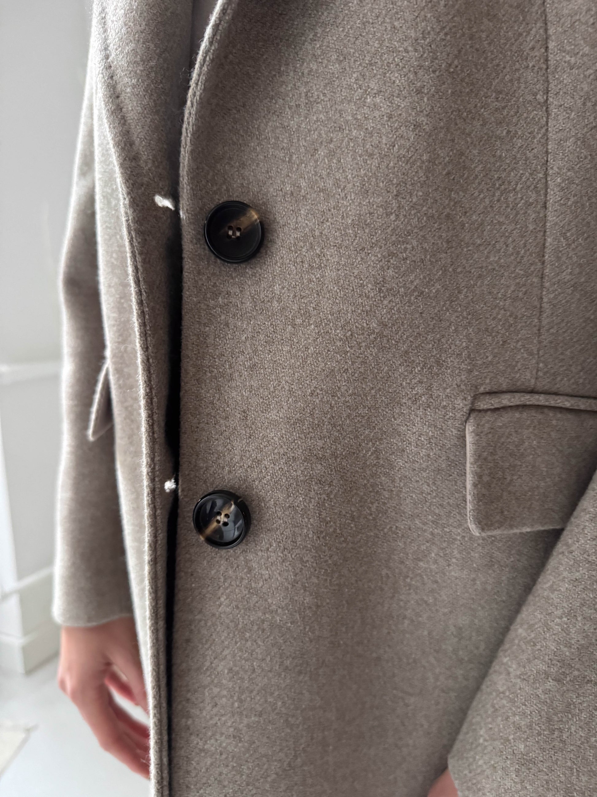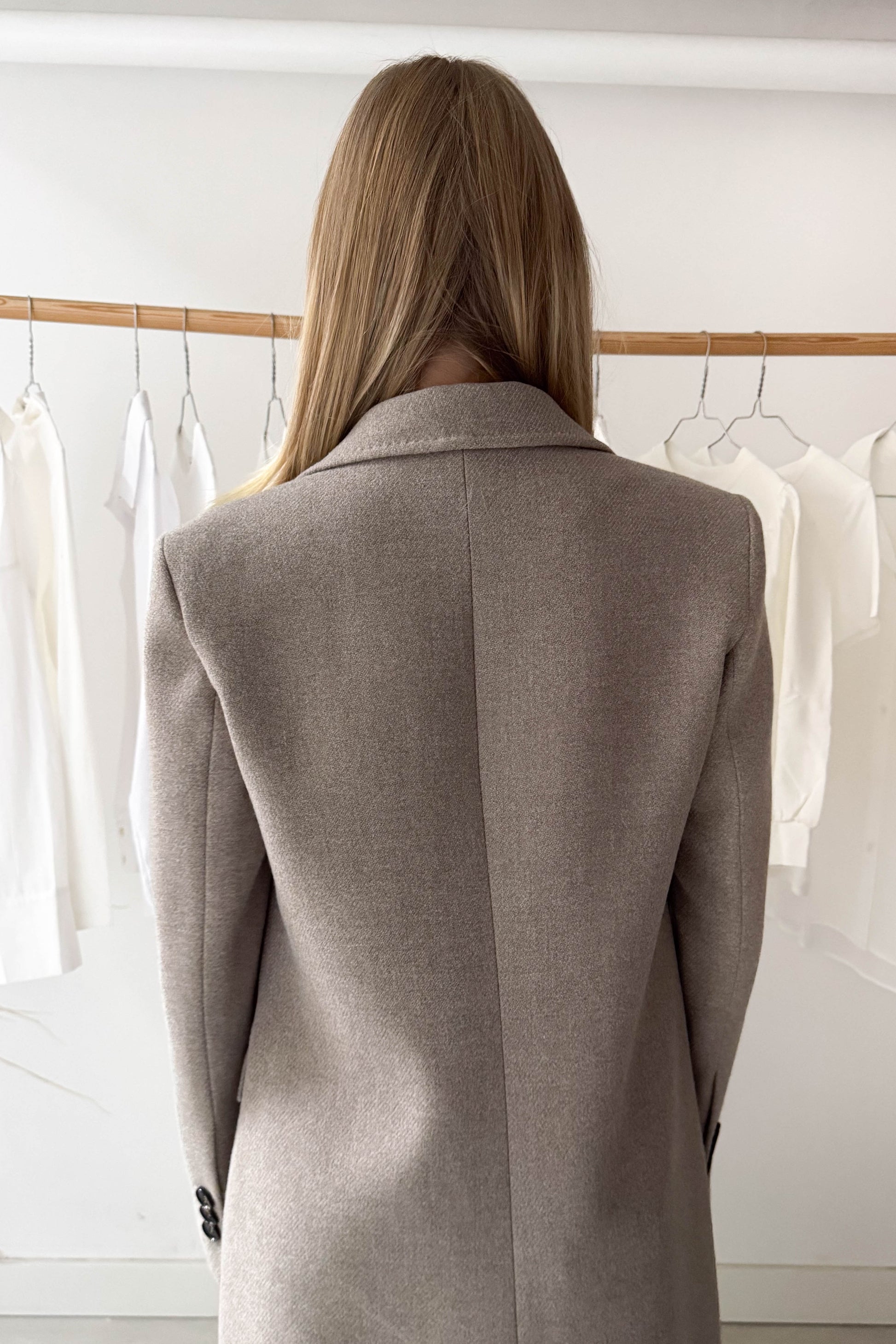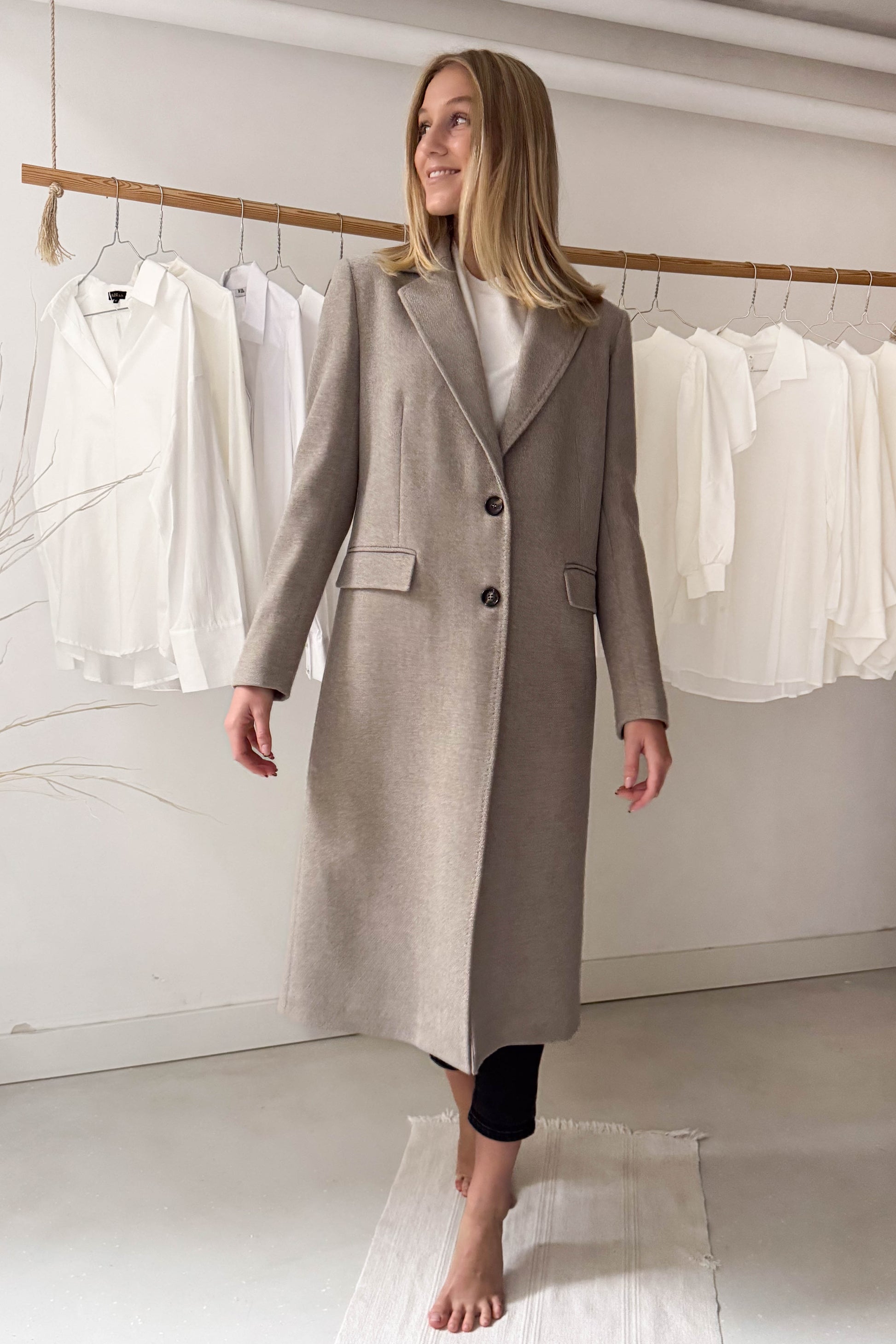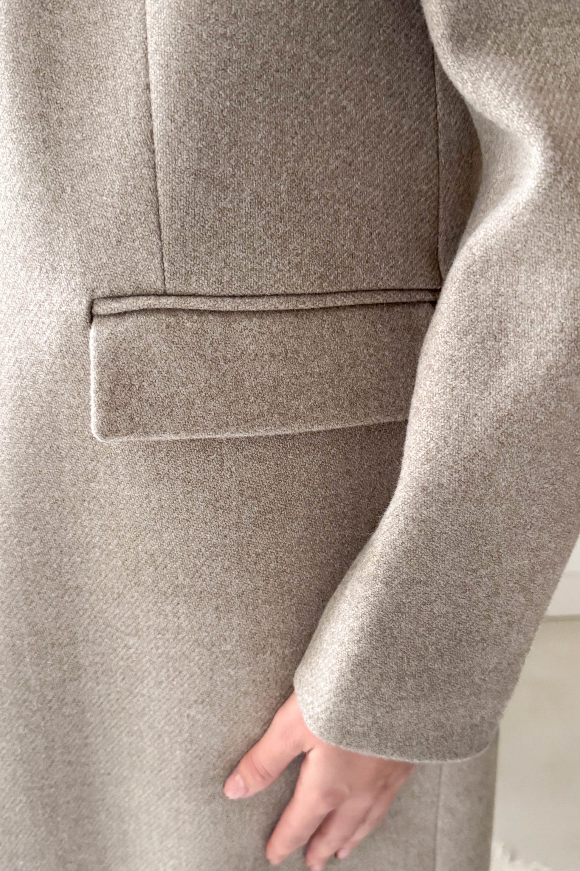 Hosszú szövetkabát bézs színben. Válltöméses, bélelt, szűkített fazon. Derékrészen álzsebekkel van ellátva. Középen két gombbal és rejtett gombbal záródik.