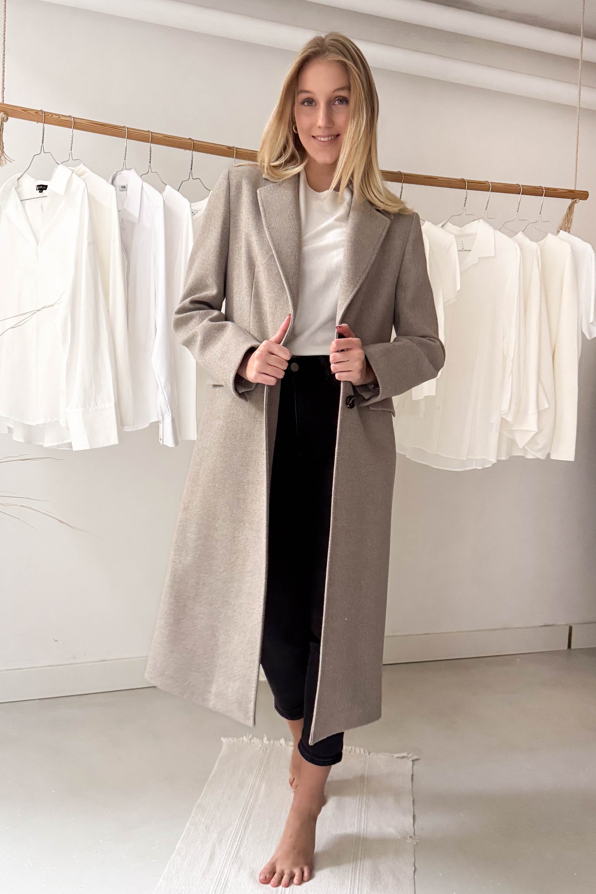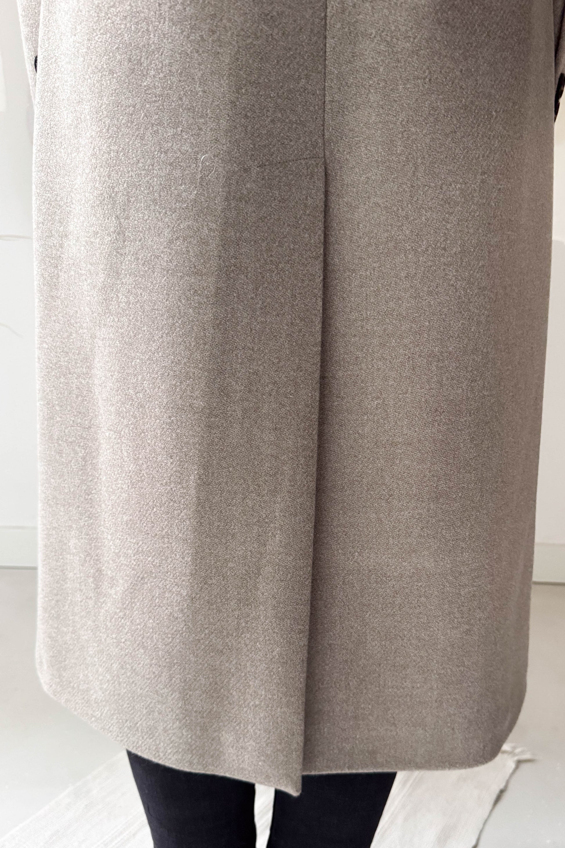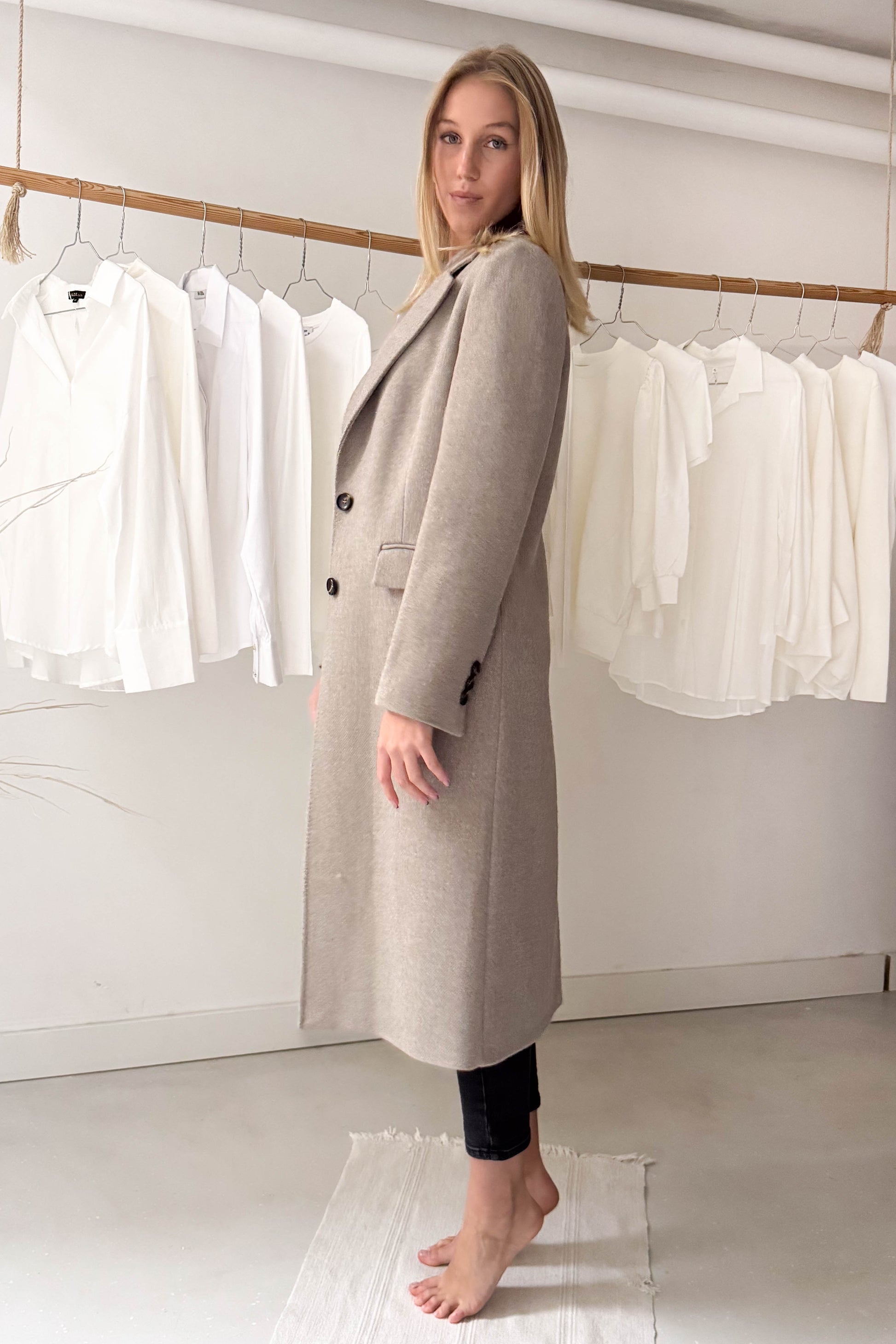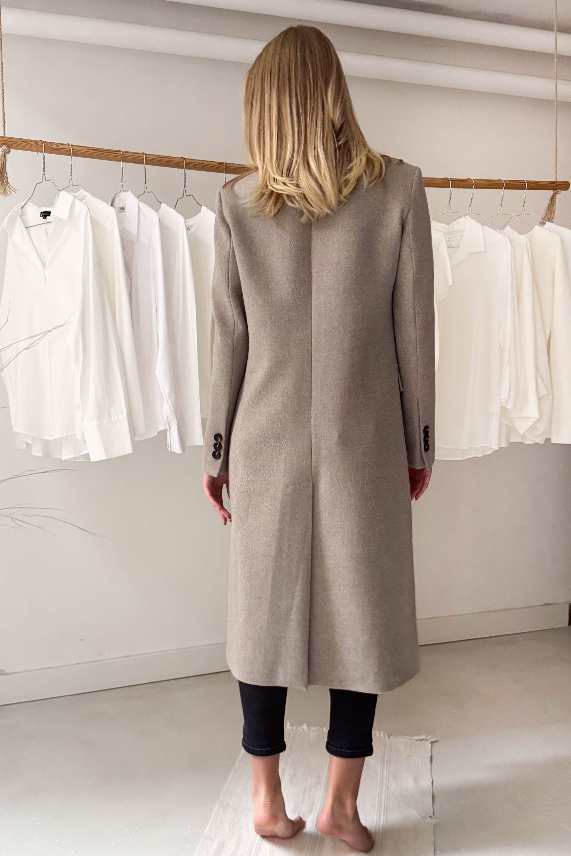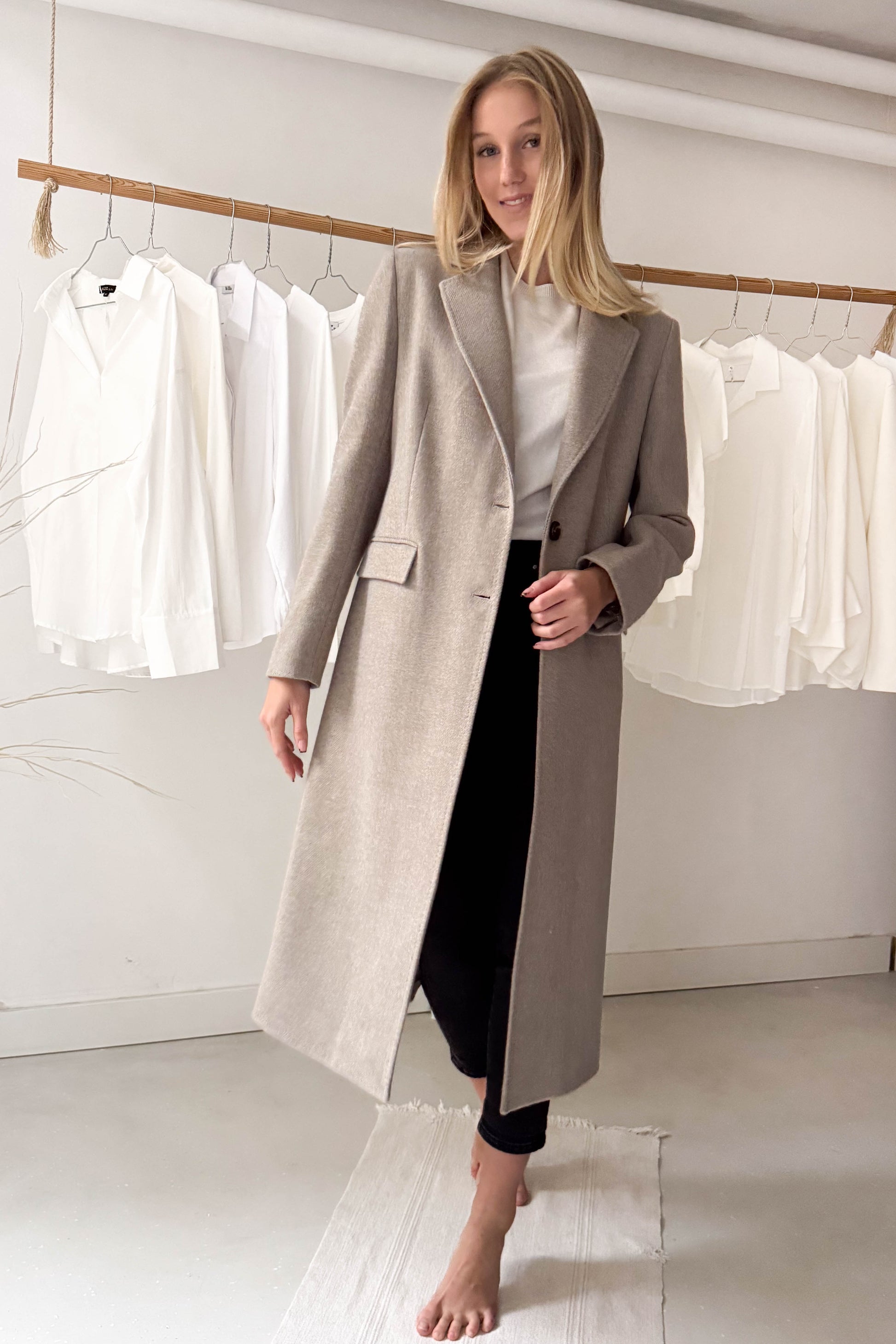 Hosszú szövetkabát bézs színben. Válltöméses, bélelt, szűkített fazon. Derékrészen álzsebekkel van ellátva. Középen két gombbal és rejtett gombbal záródik.