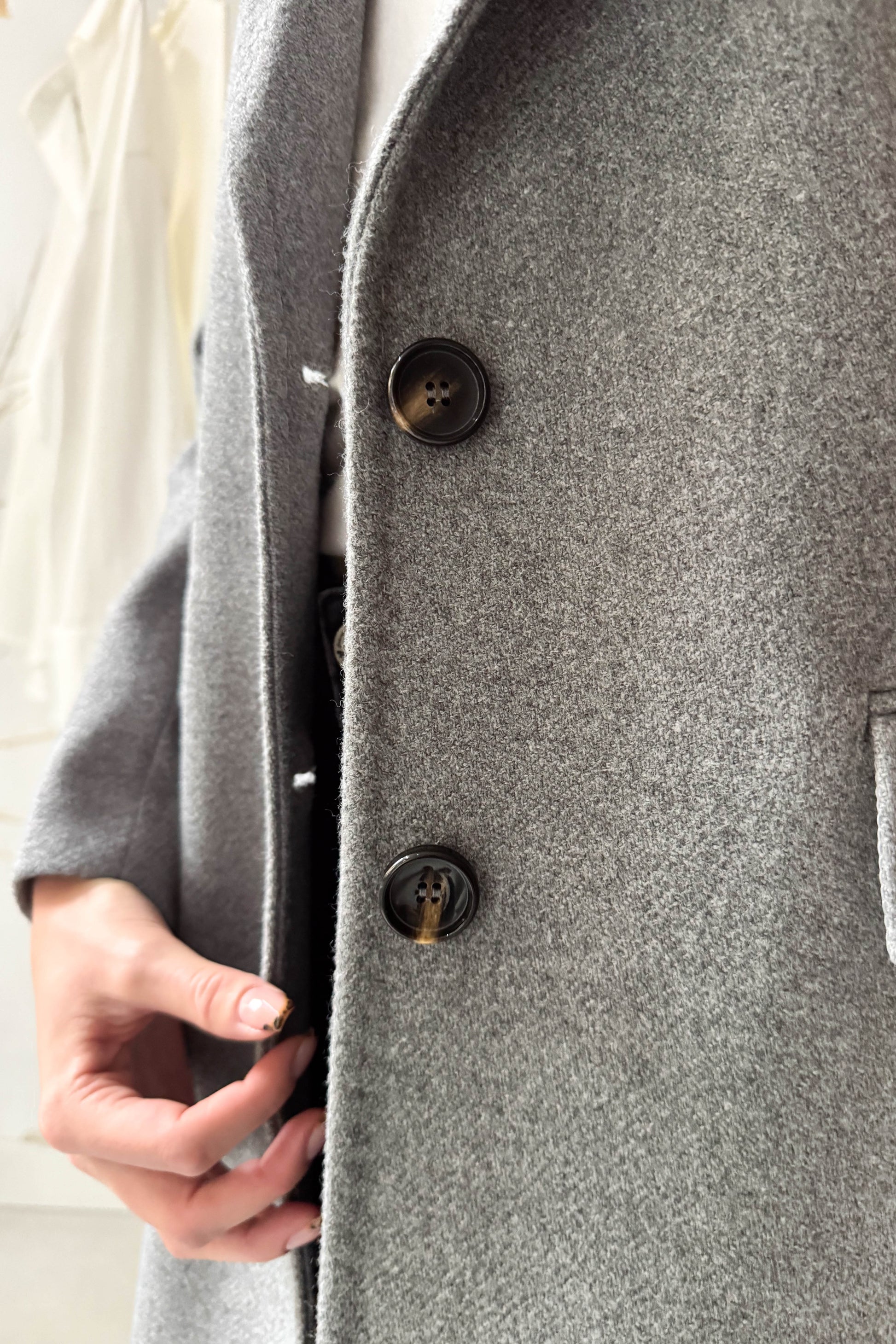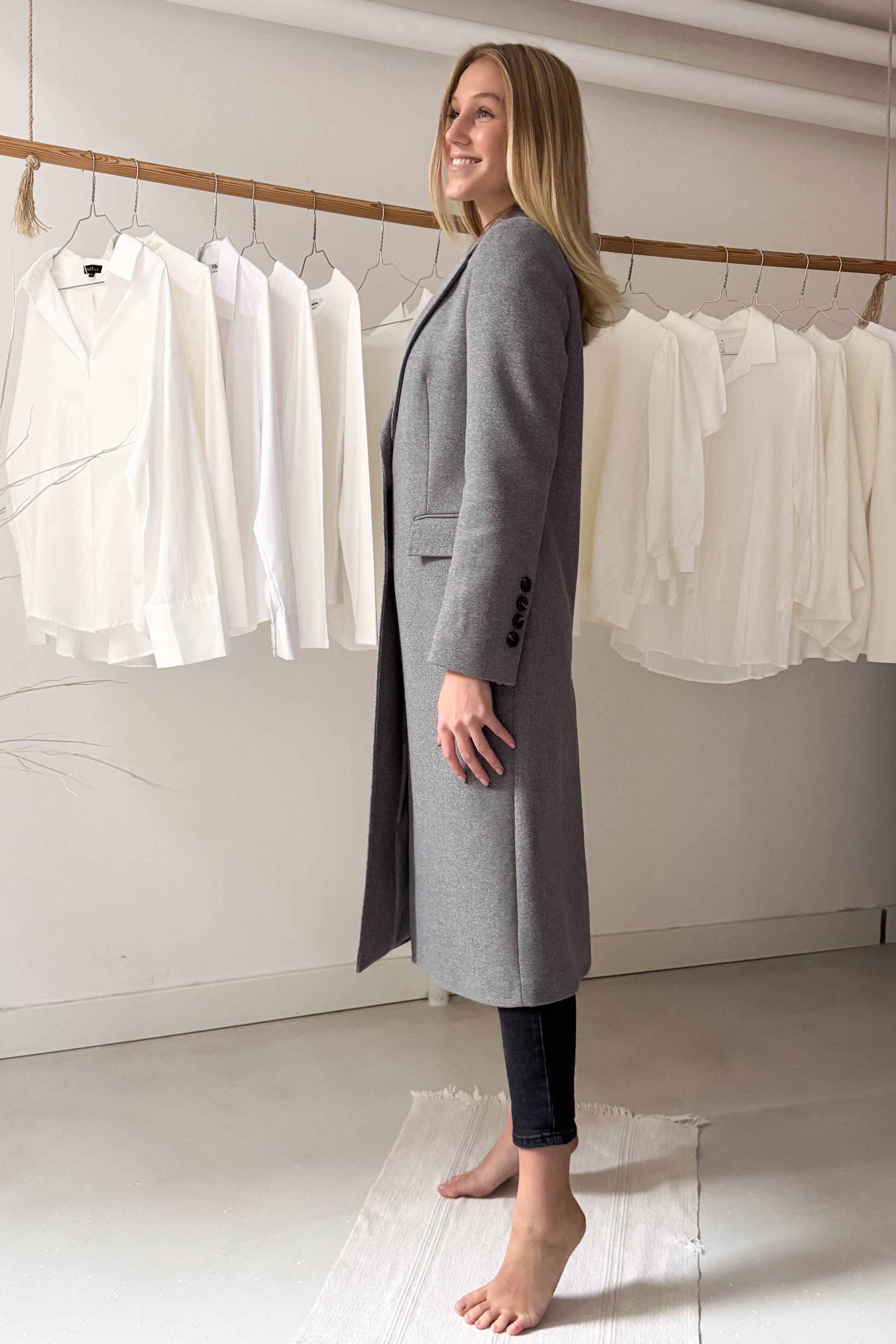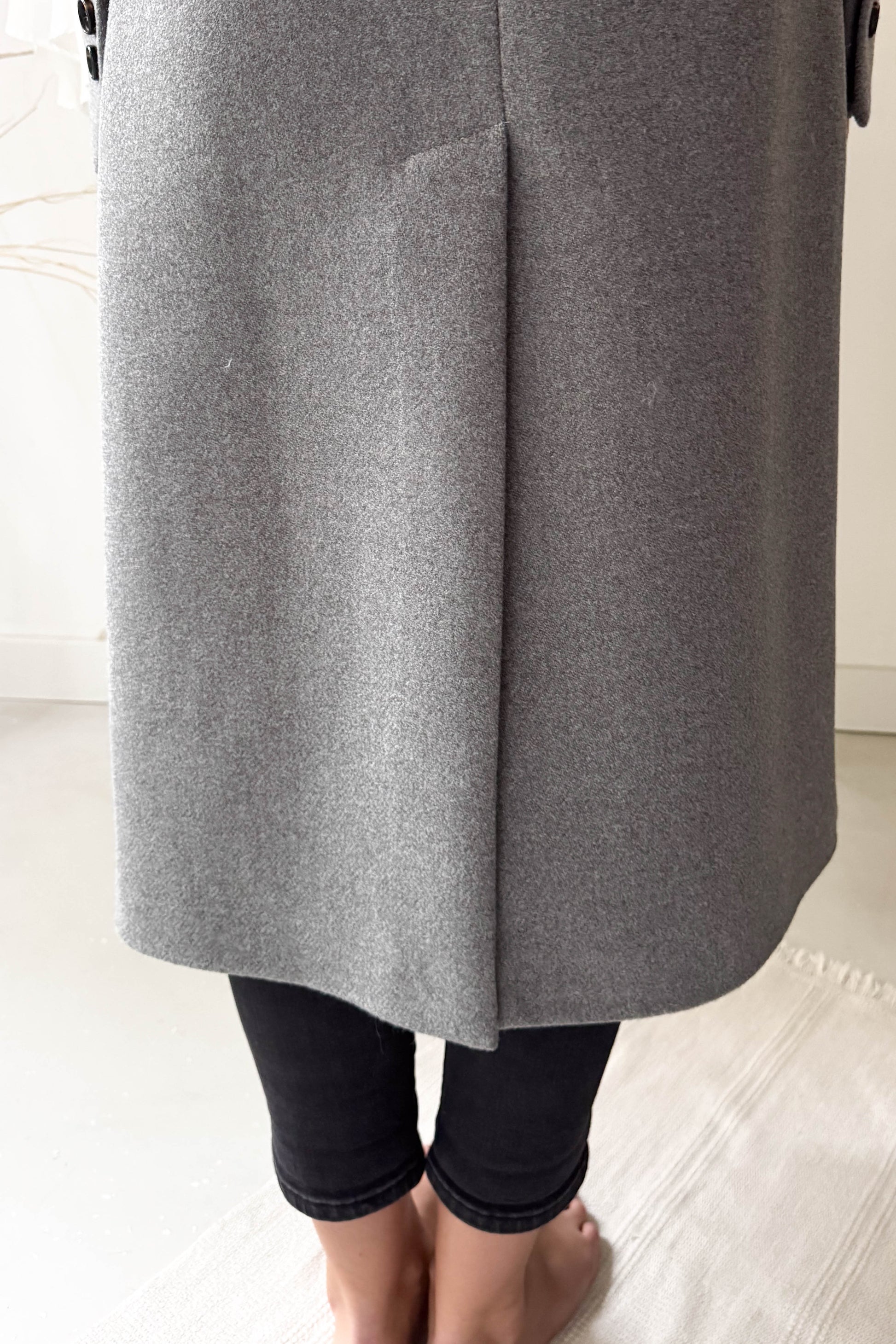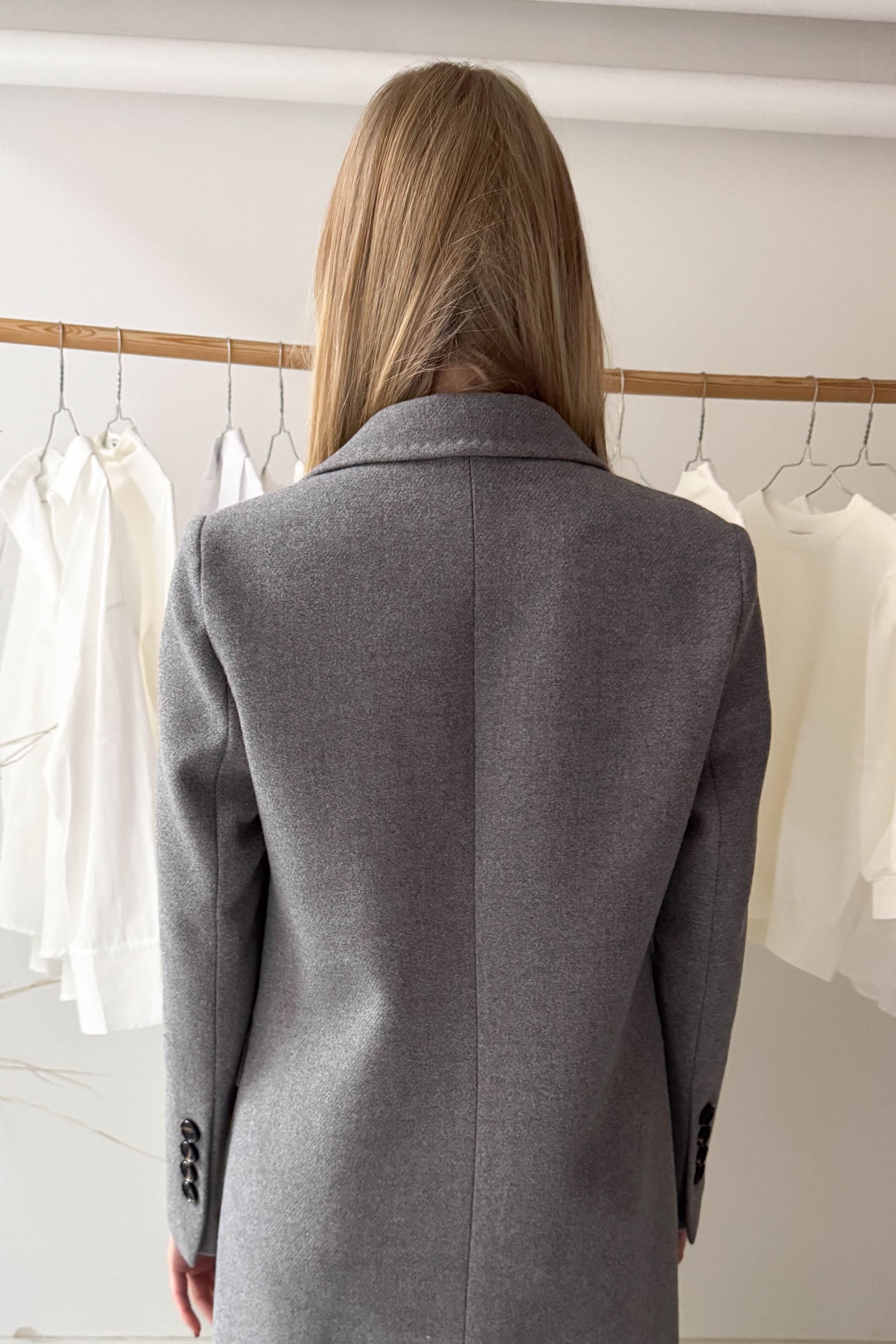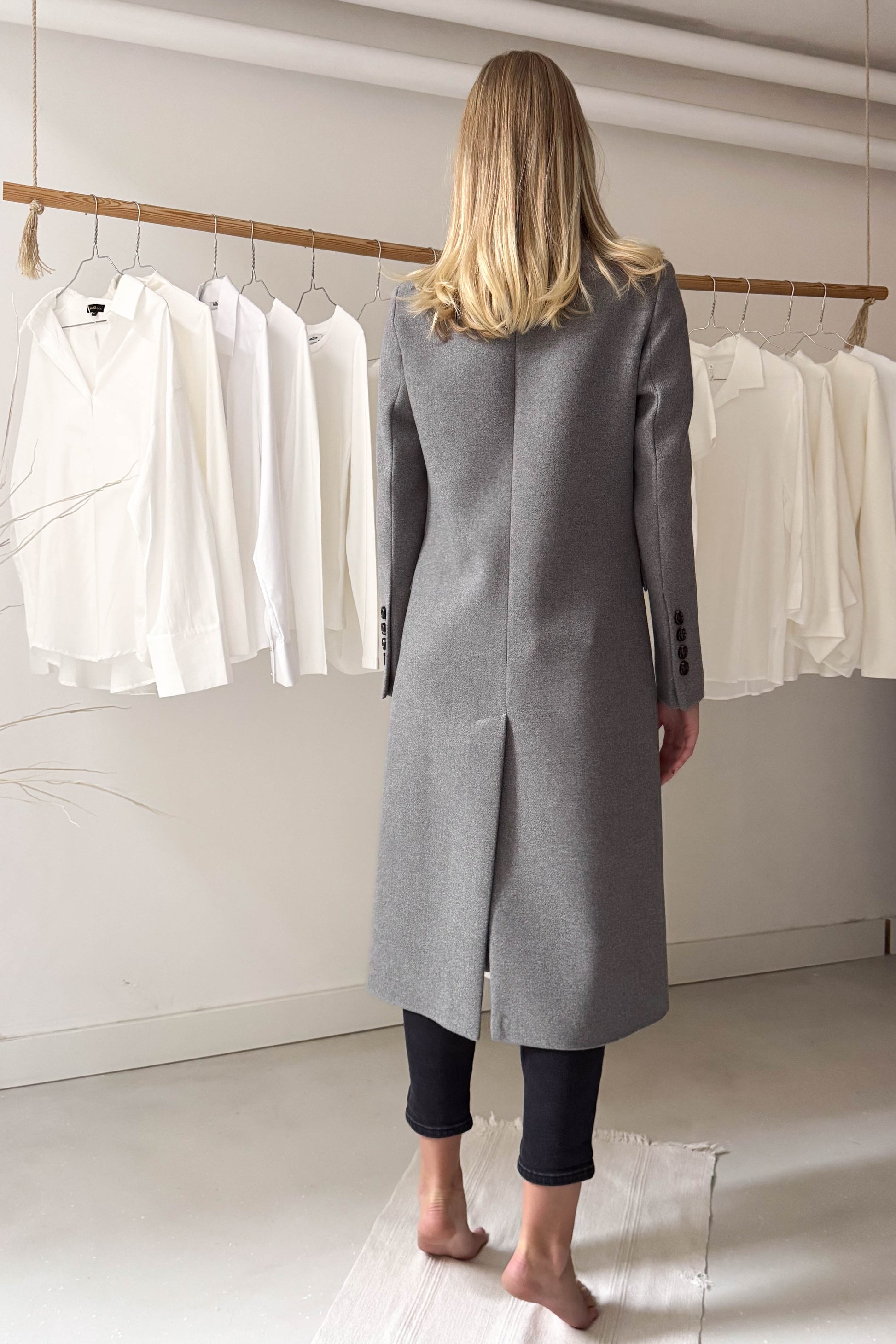 Hosszú szövetkabát szürke színben. Válltöméses, bélelt, szűkített fazon. Derékrészen álzsebekkel van ellátva. Középen két gombbal és rejtett gombbal záródik.