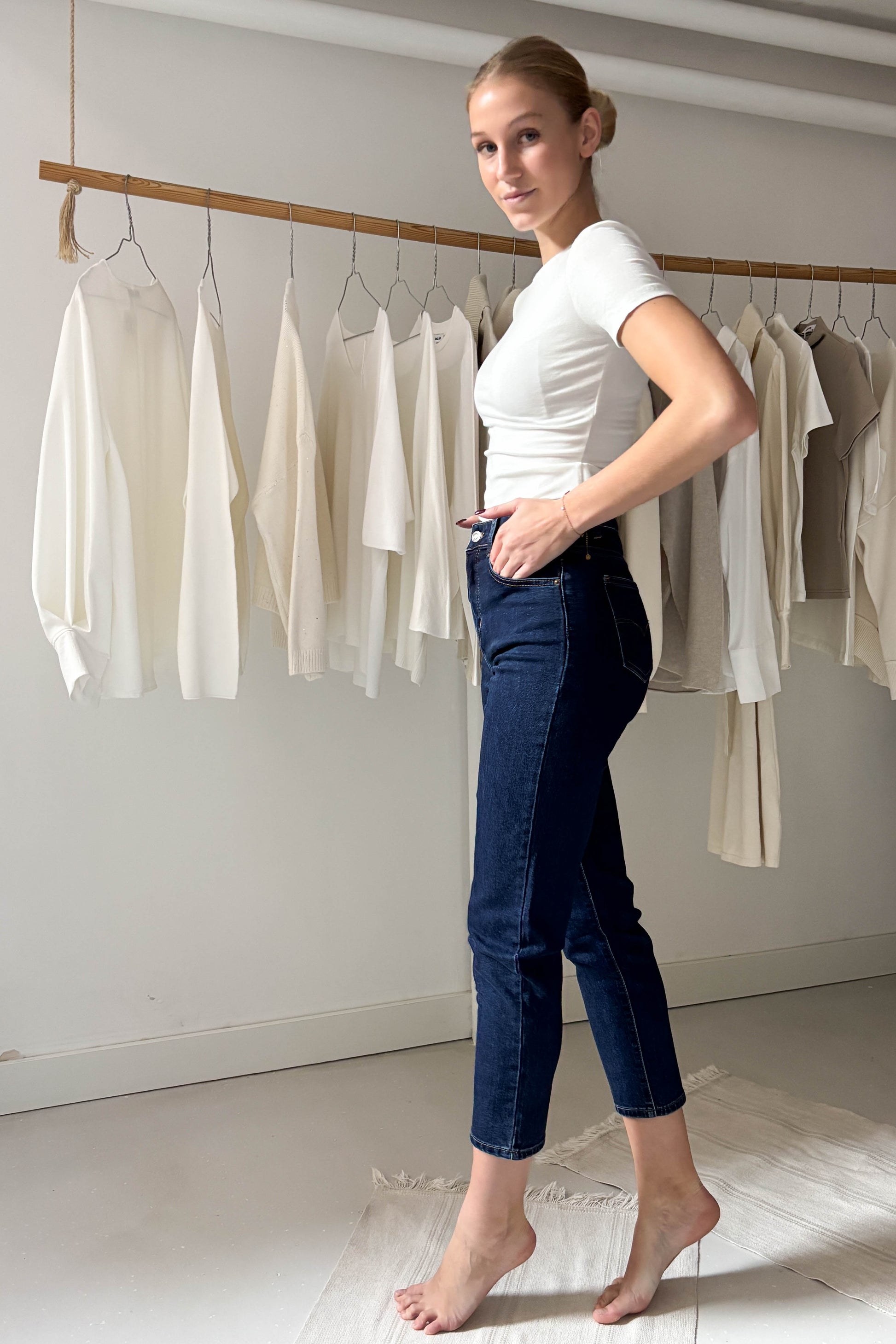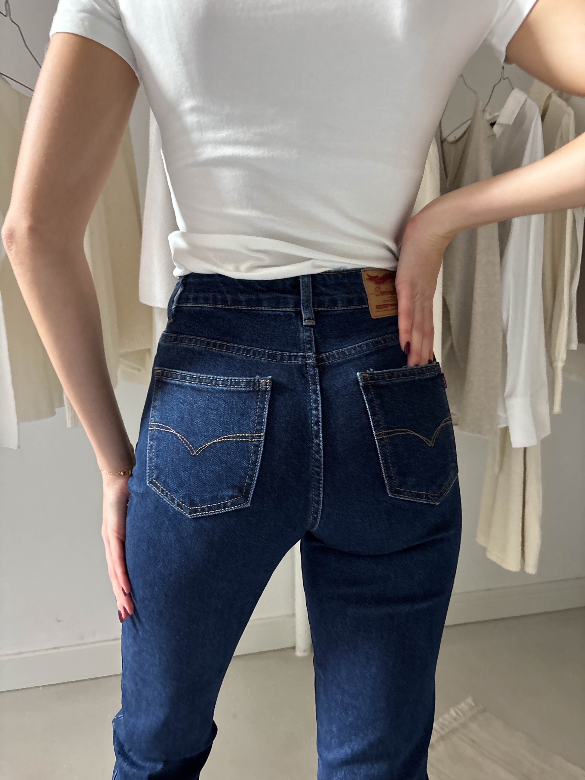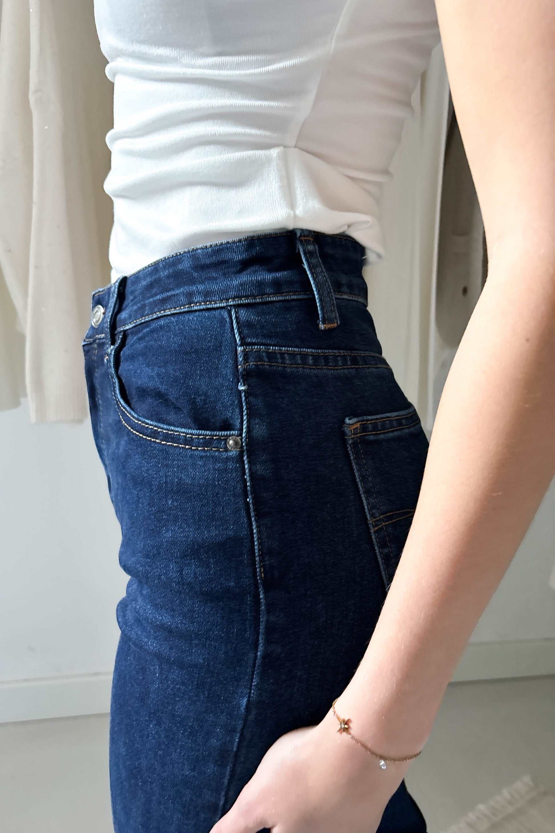 Normál derékmagasságú, szűk szűrú, enyhén elasztikus, sötétkék nadrág. Elöl egy gombbal és cipzárral záródó, zsebes fazon.