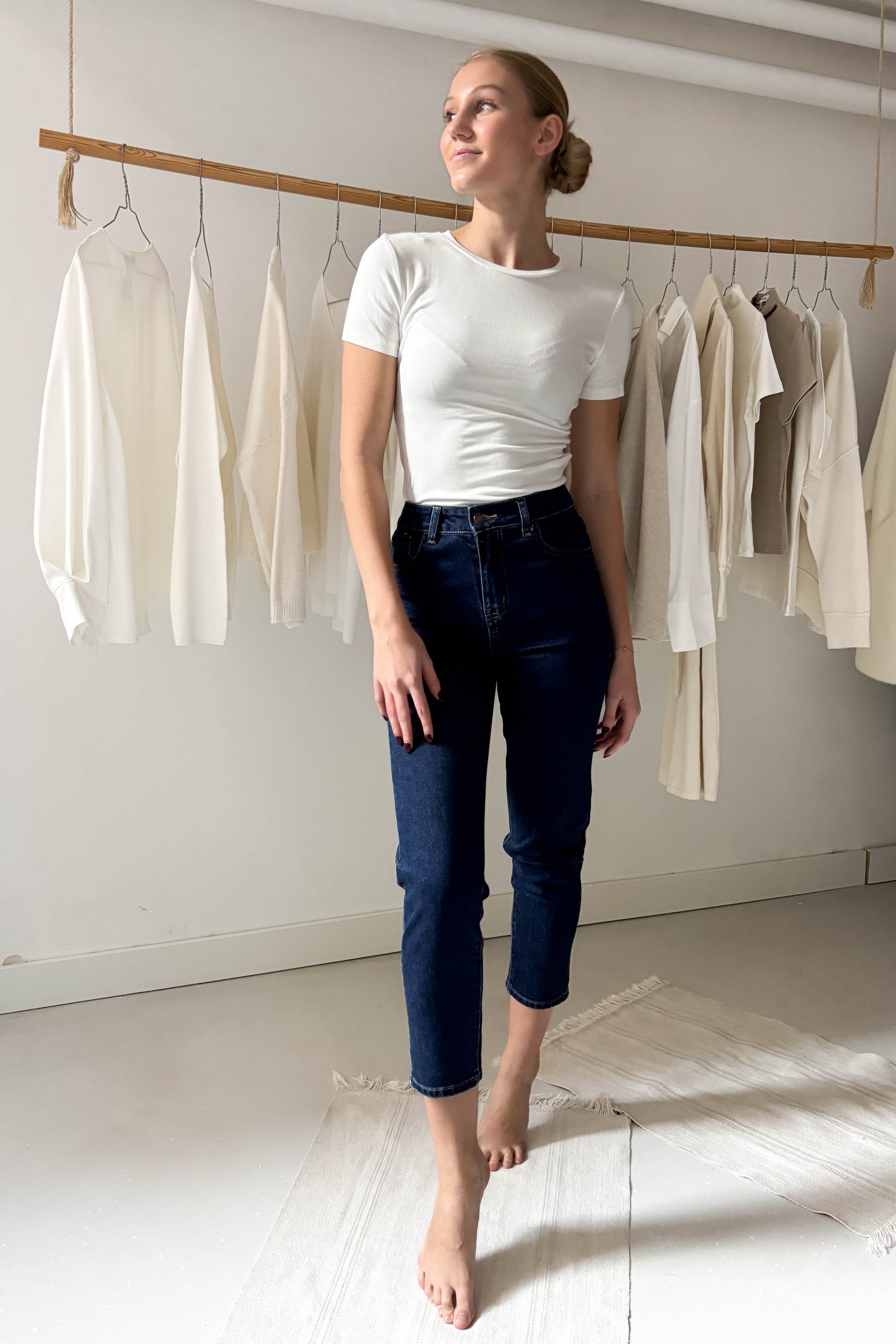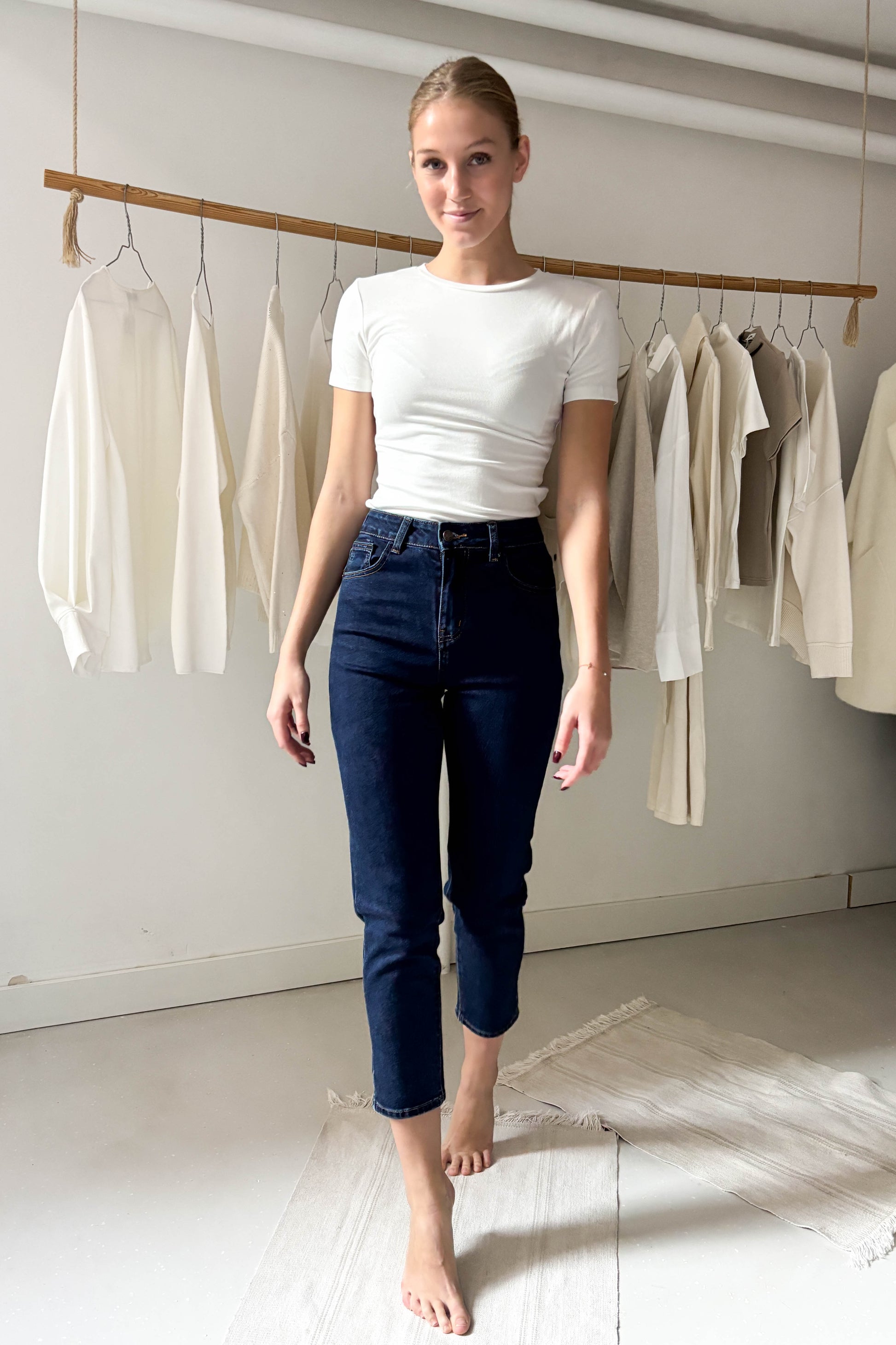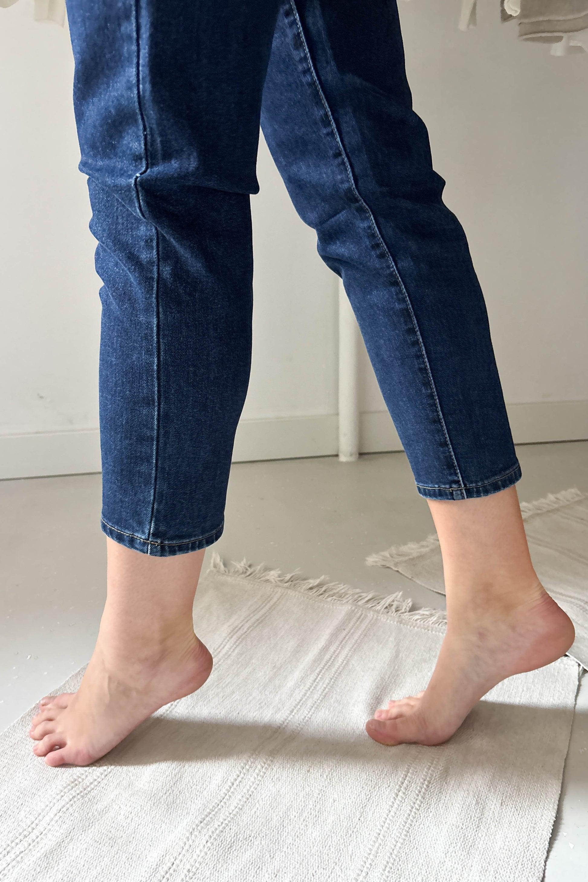 Normál derékmagasságú, szűk szűrú, enyhén elasztikus, sötétkék nadrág. Elöl egy gombbal és cipzárral záródó, zsebes fazon.