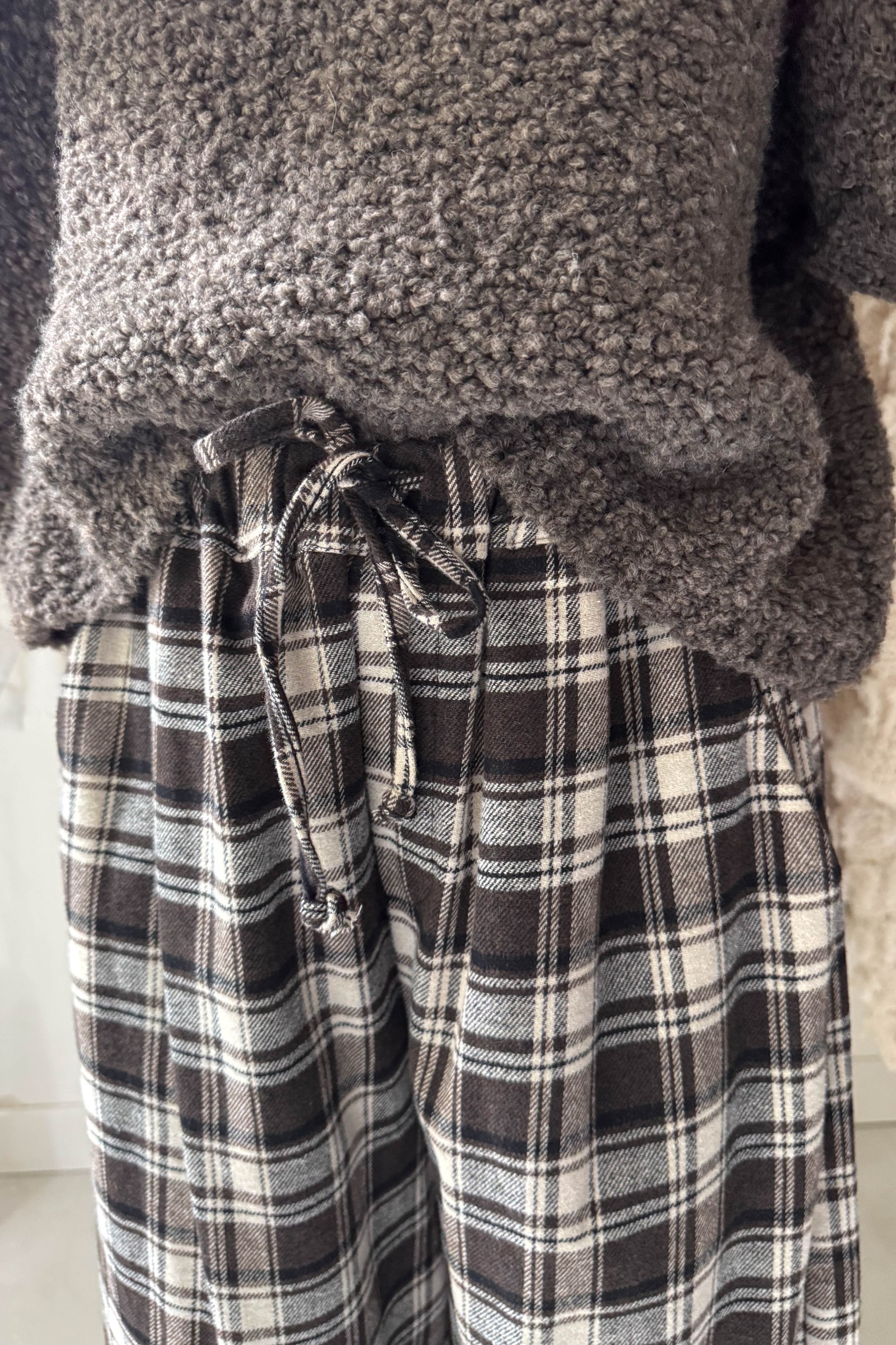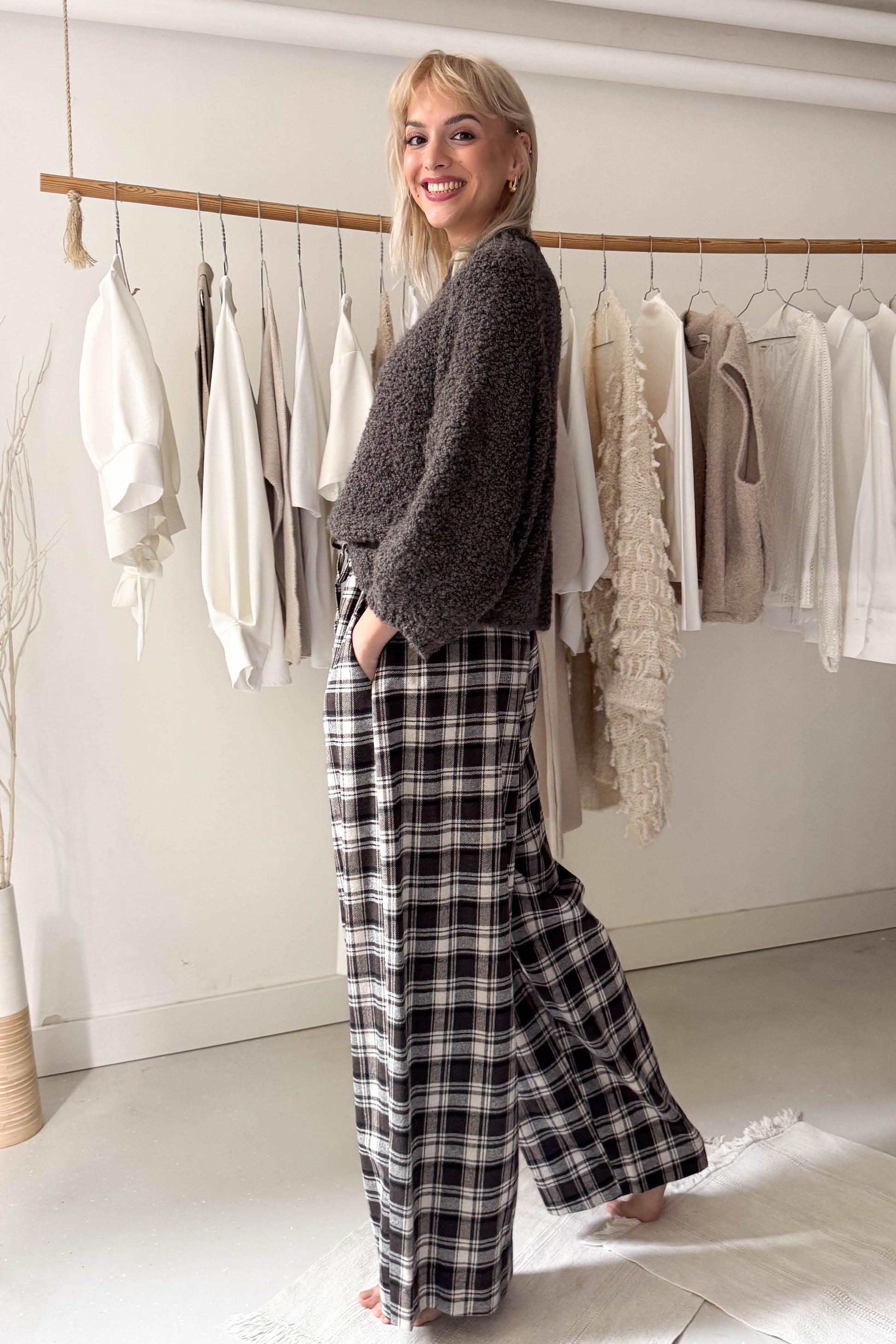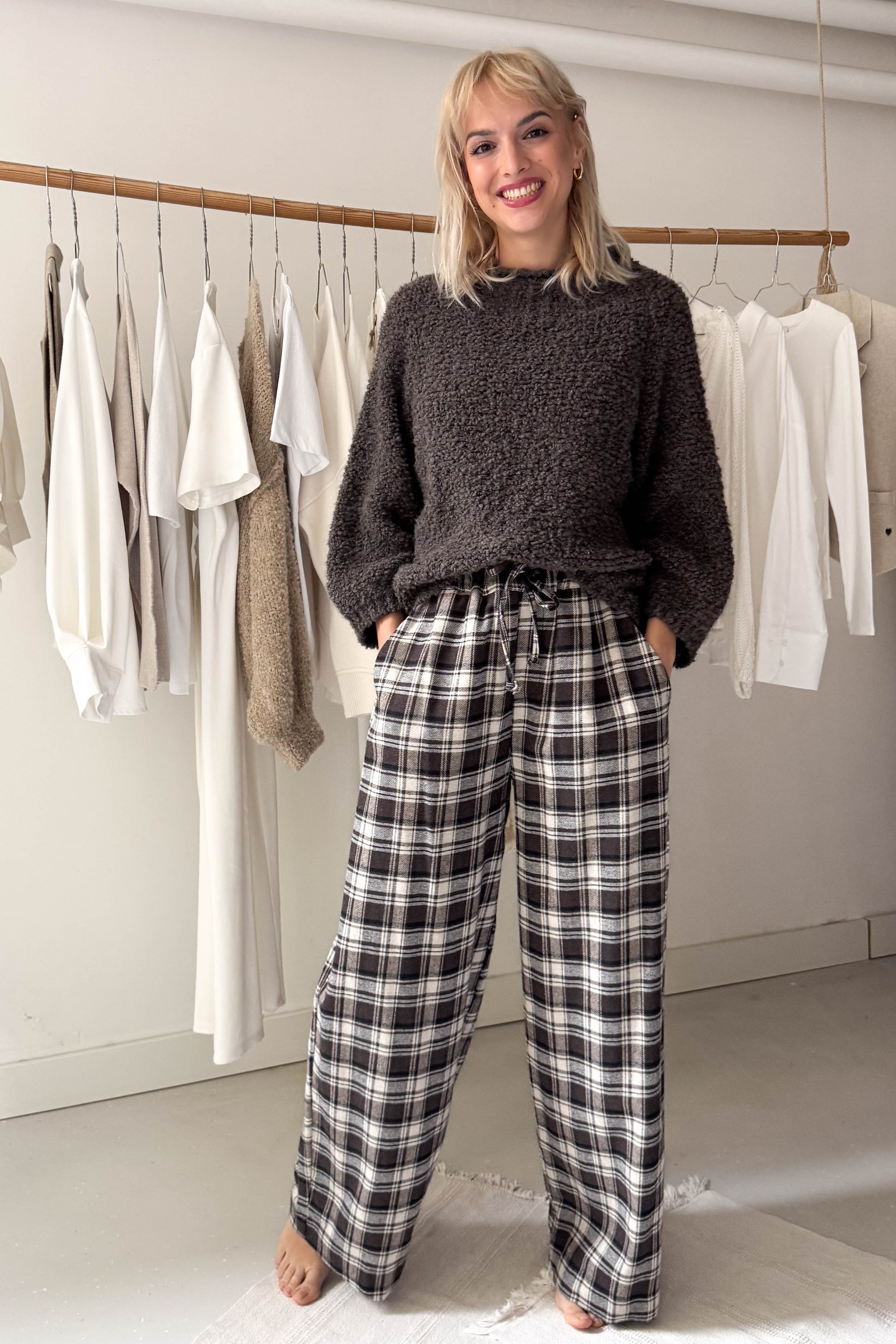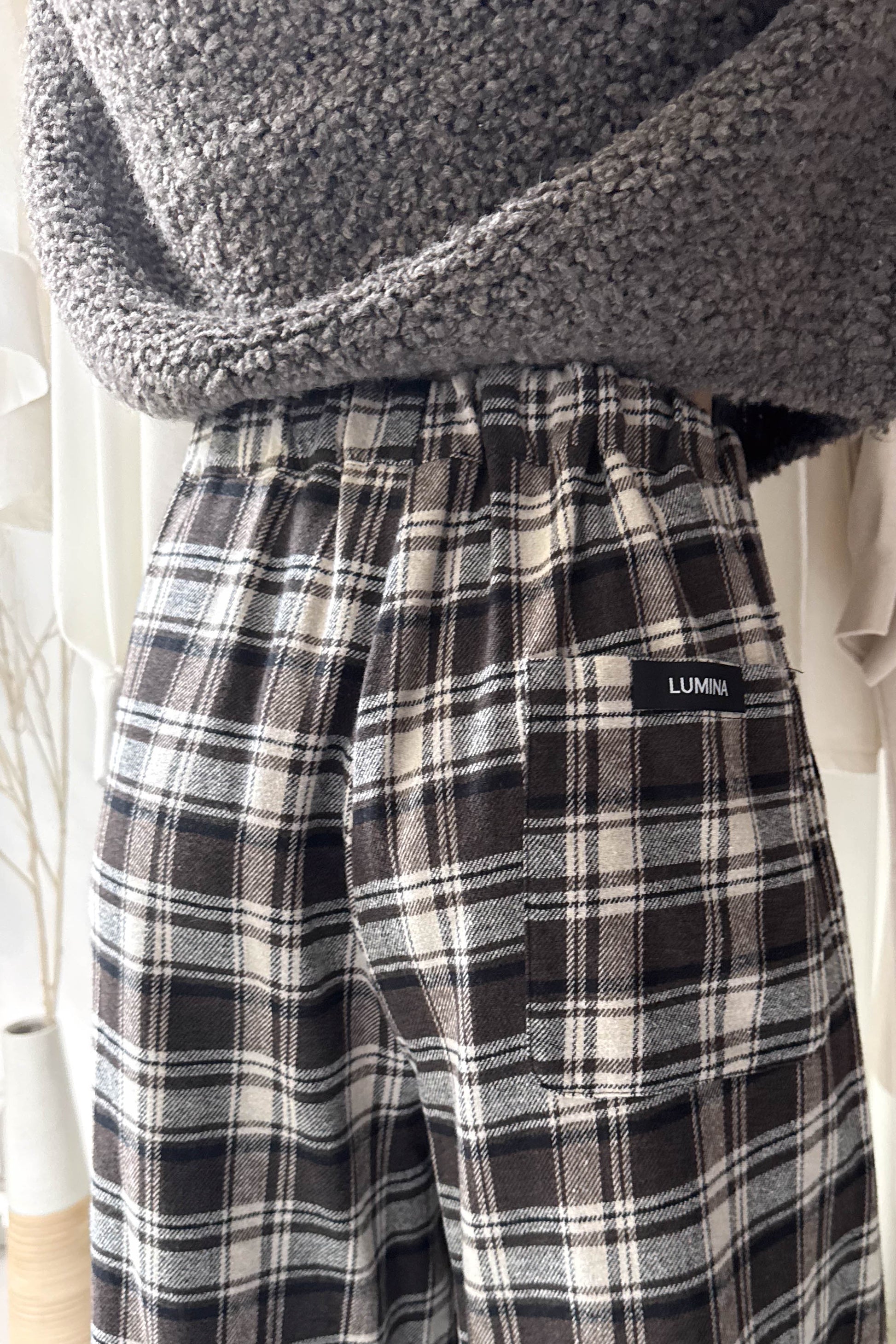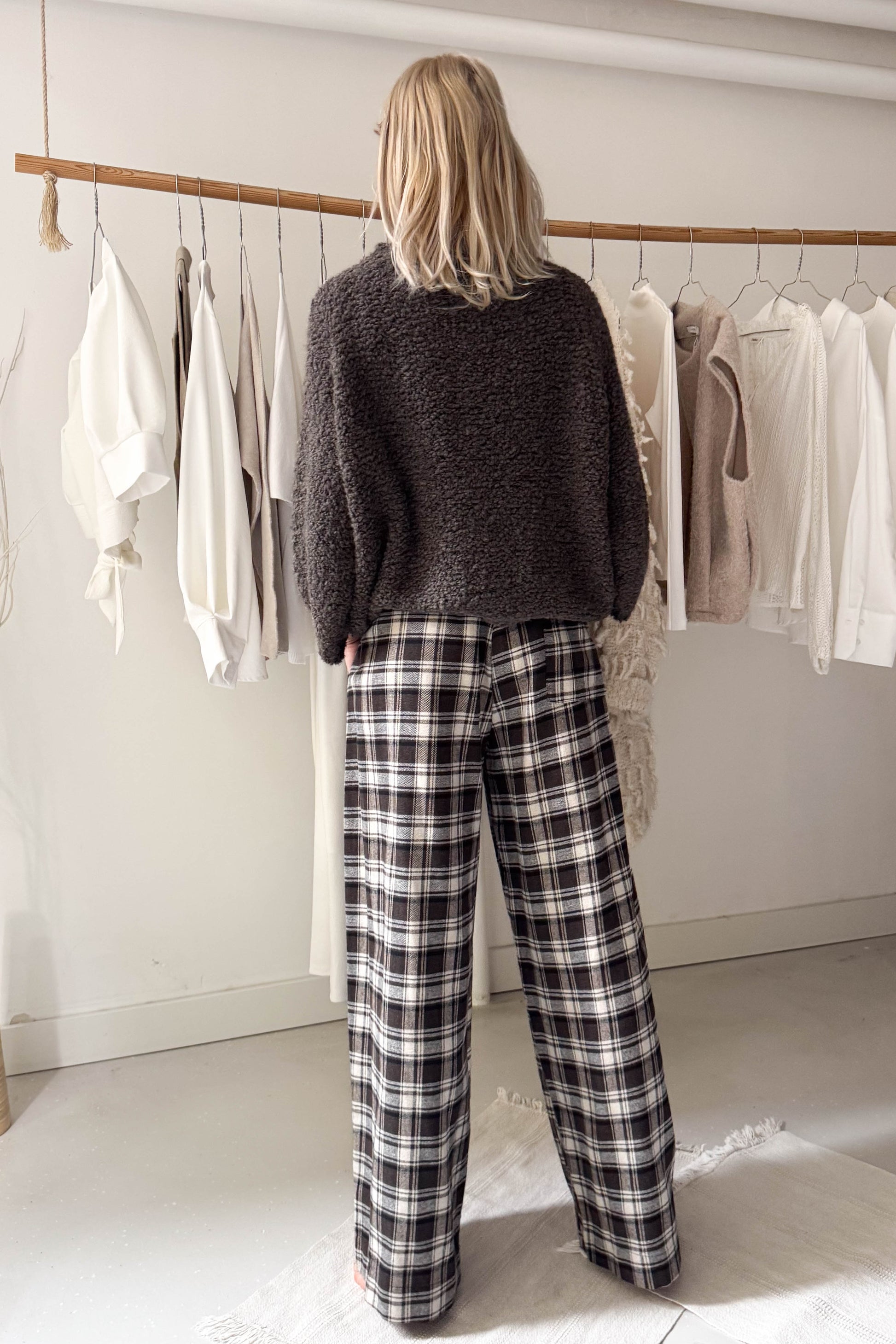 Egyenes szárú, gumírozott derekú nadrág. Derékrészen megkötős, zsebes fazon.