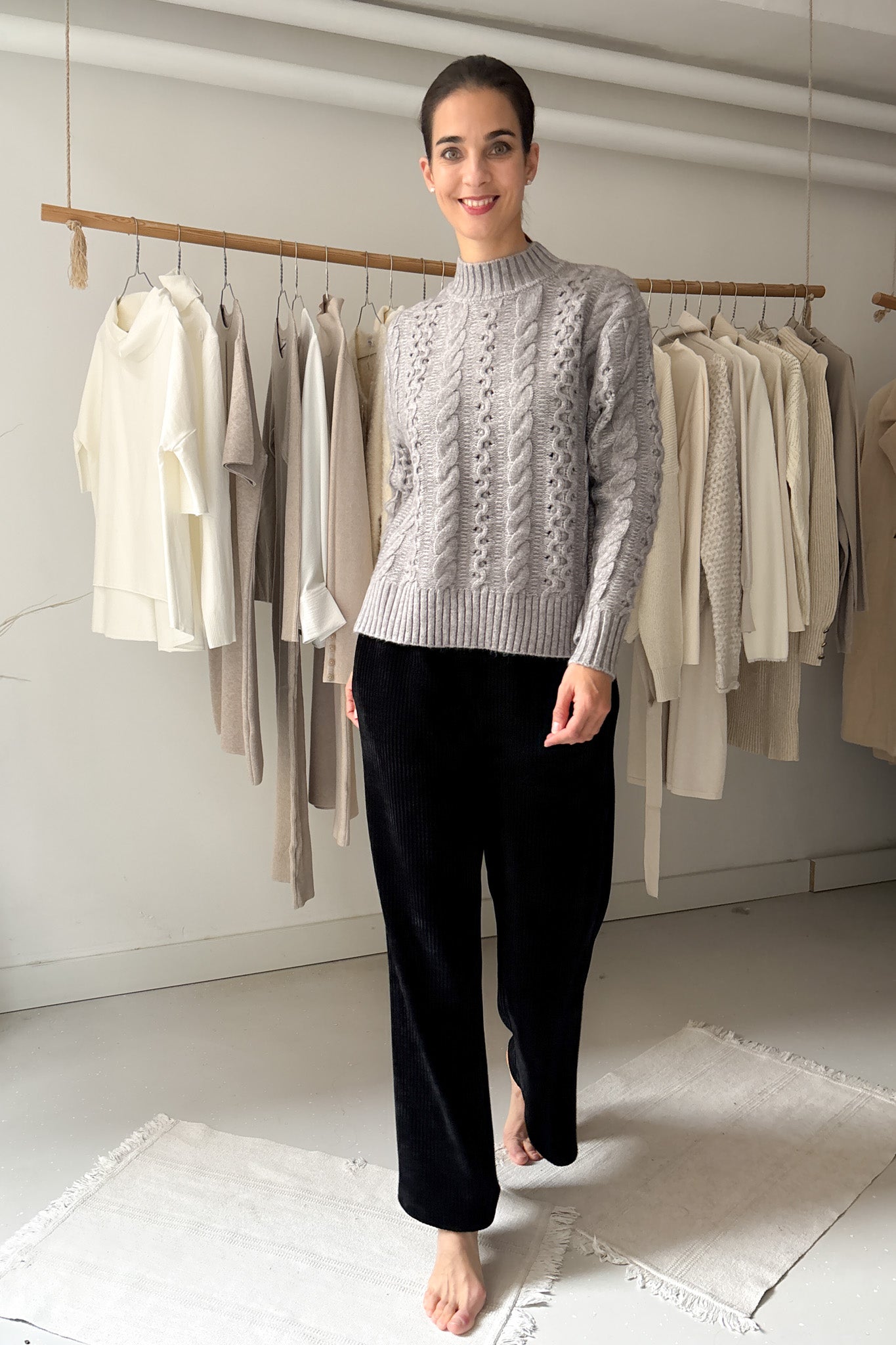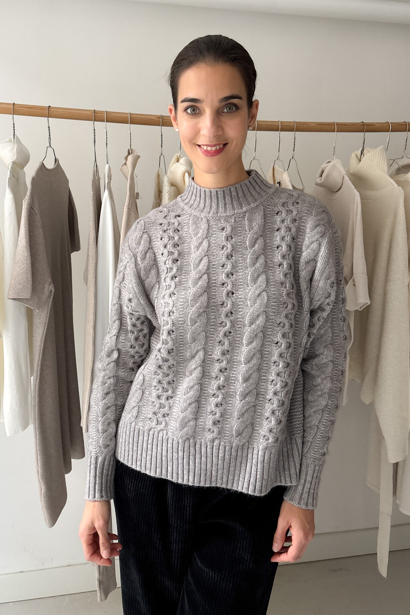 Puha anyagú, kötött pulóver szürke színben. Ujjai passzosak, nyaka enyhén magasított. Textúrált fazon.