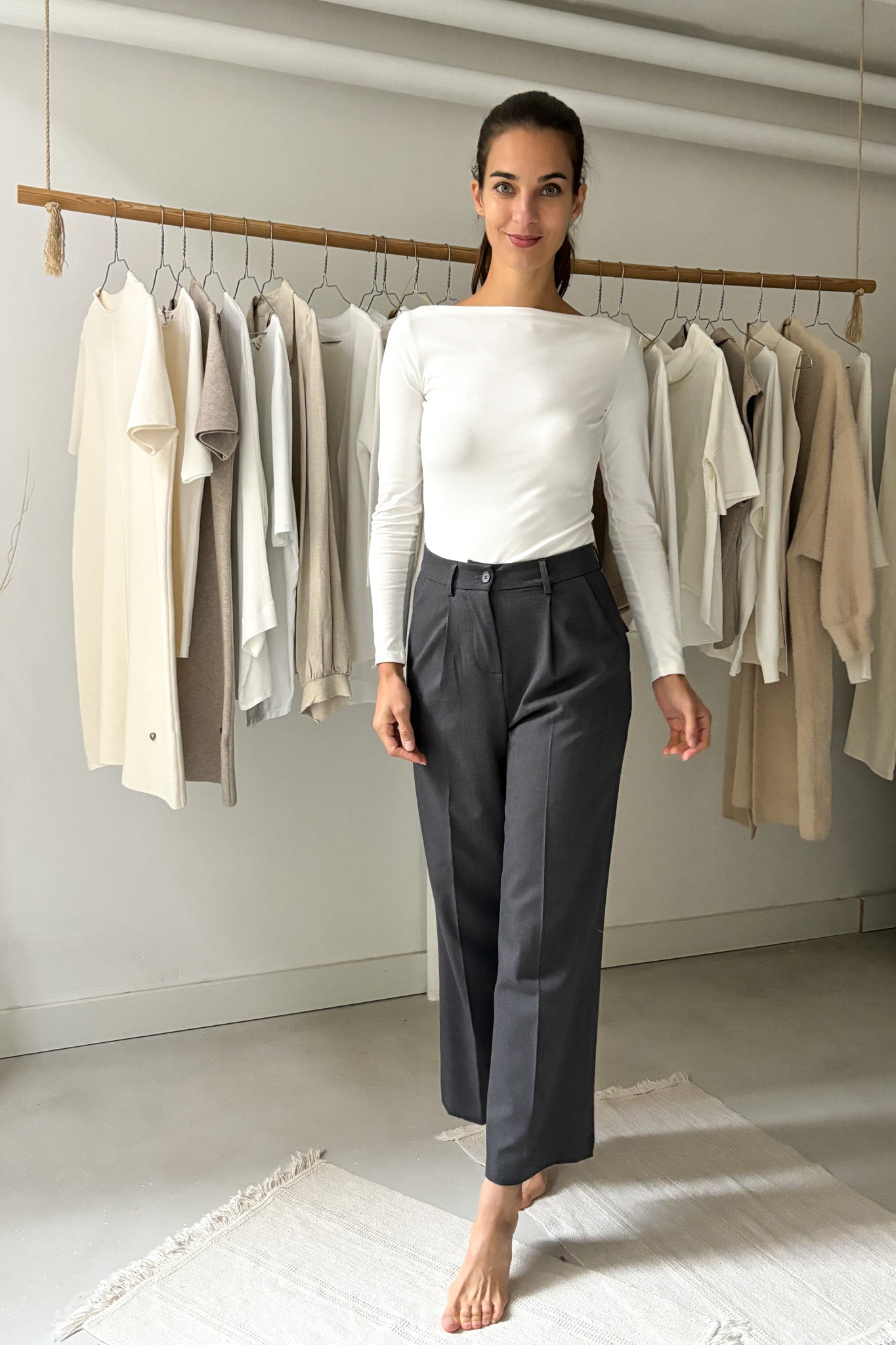 Elegáns, szürke, vasalt nadrág. Középen gombbal és cipzárral összefogható. Hátul díszzsebekkel ellátott.