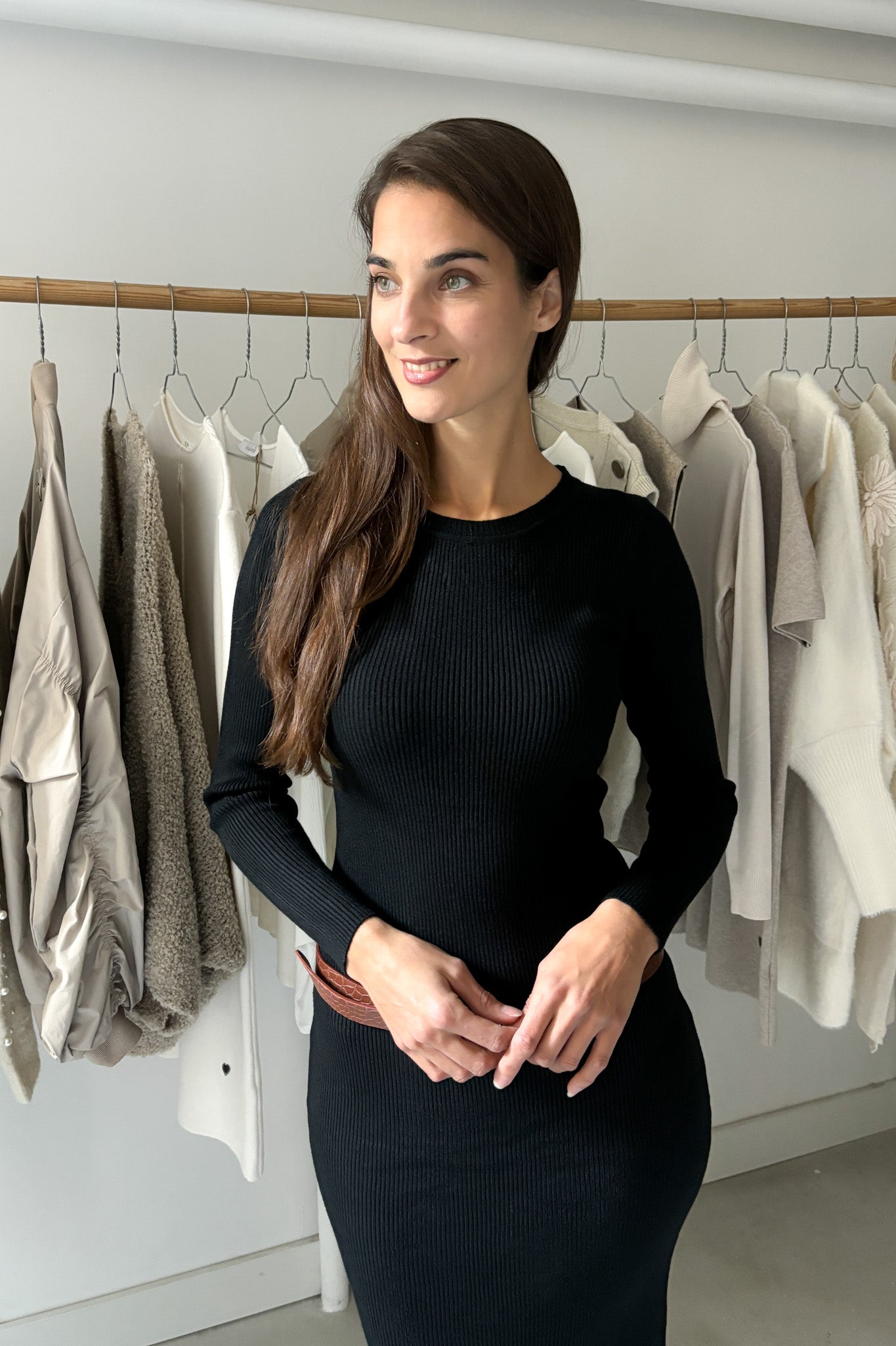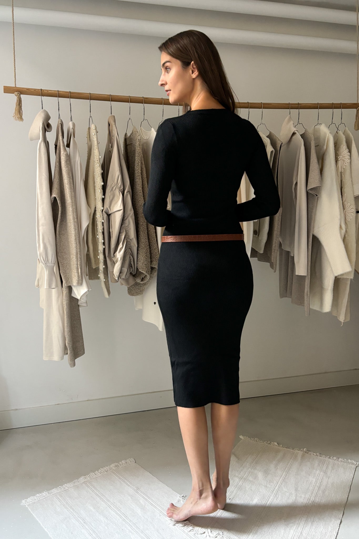 Bordázott, testhezálló ruha fekete színben. Környakkal ellátott fazon. Az öv nem a ruha része!
