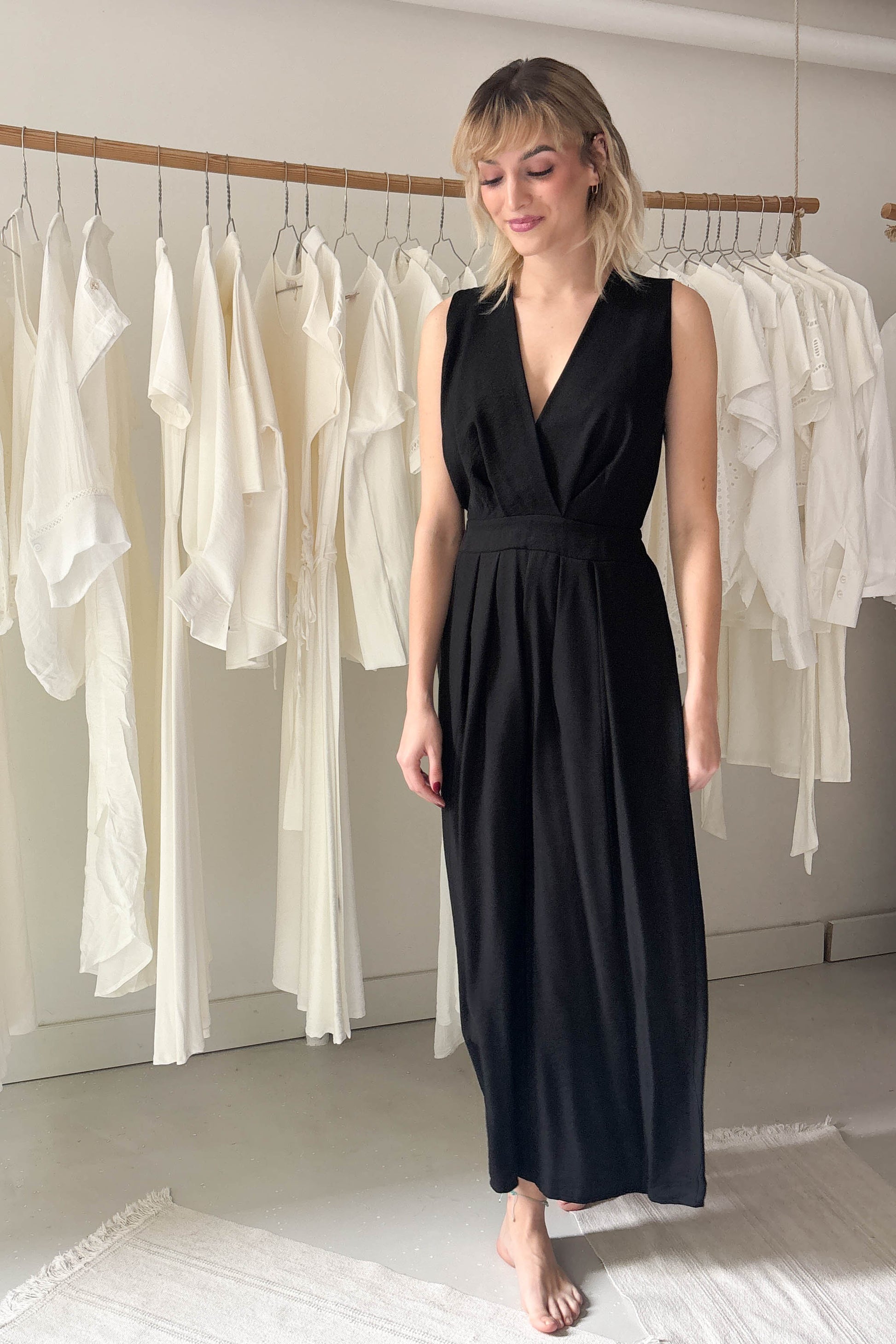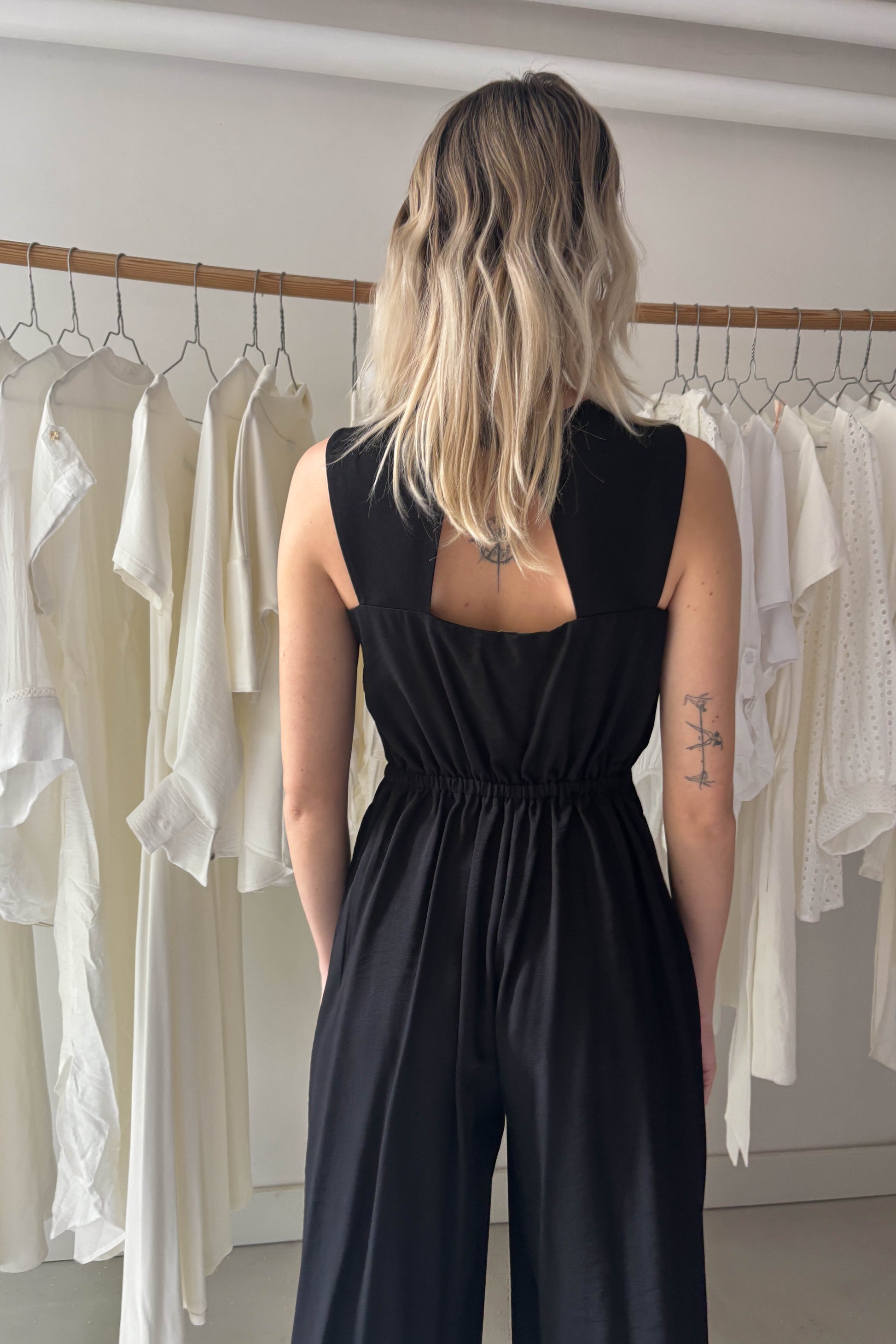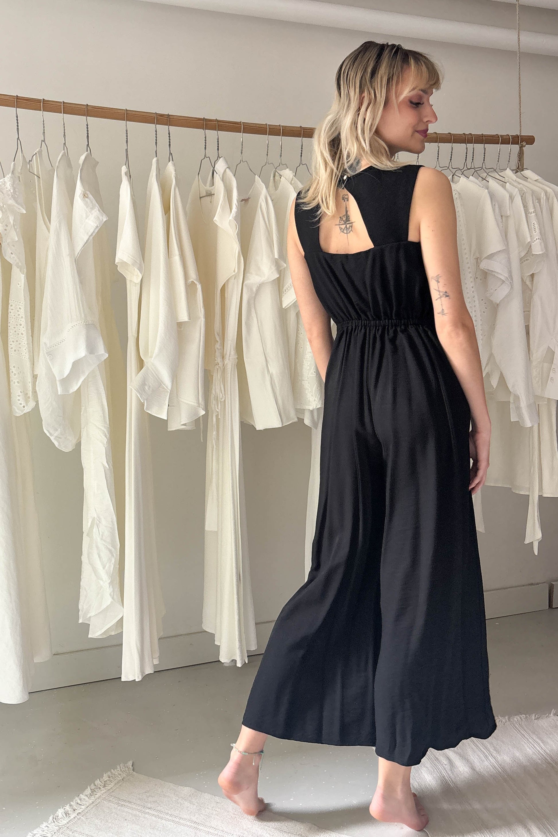Enyhén gyűrt hatású elegáns overál. Lenge fazon, mell alatt hajtással, hátul kivágott és gumírozott .