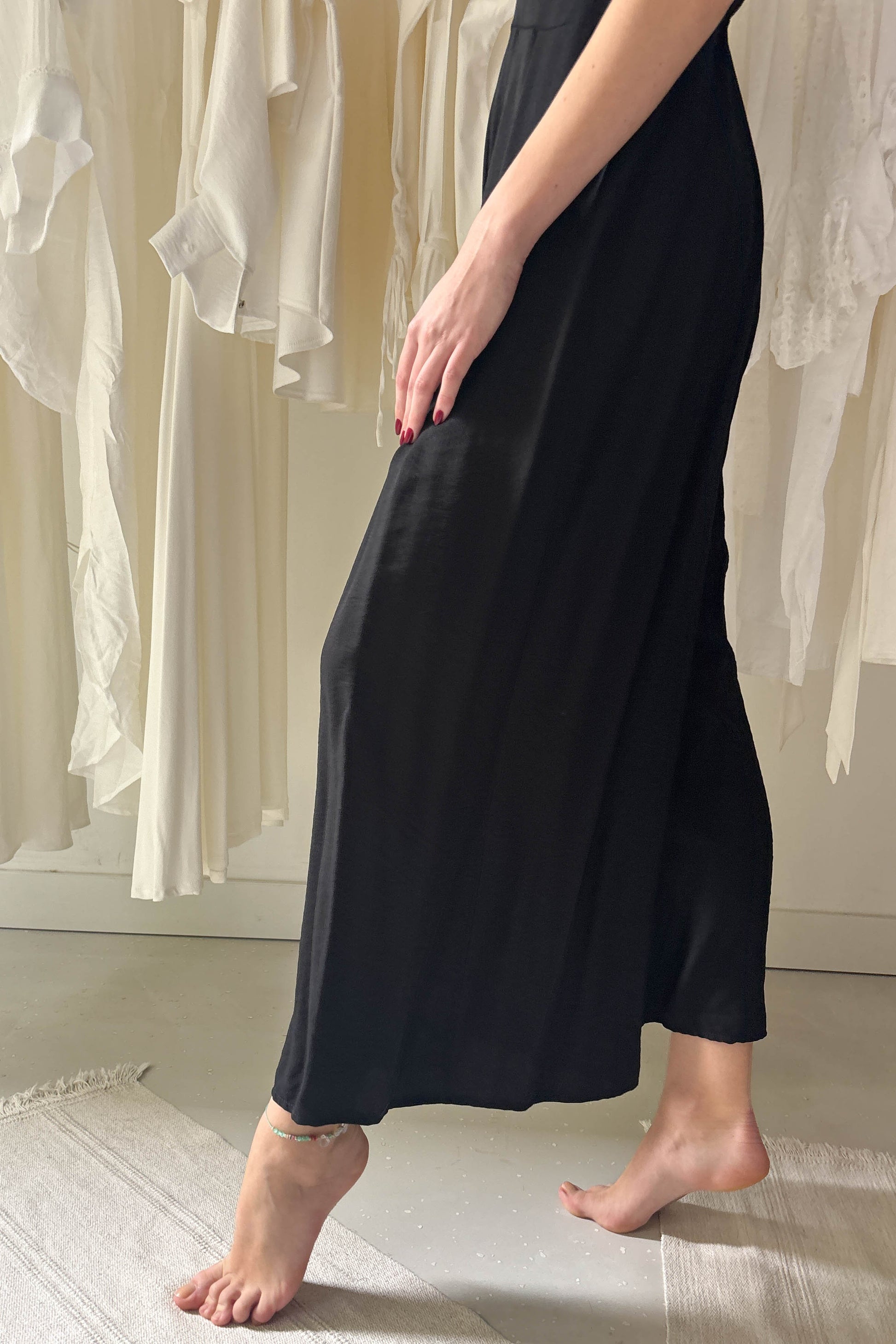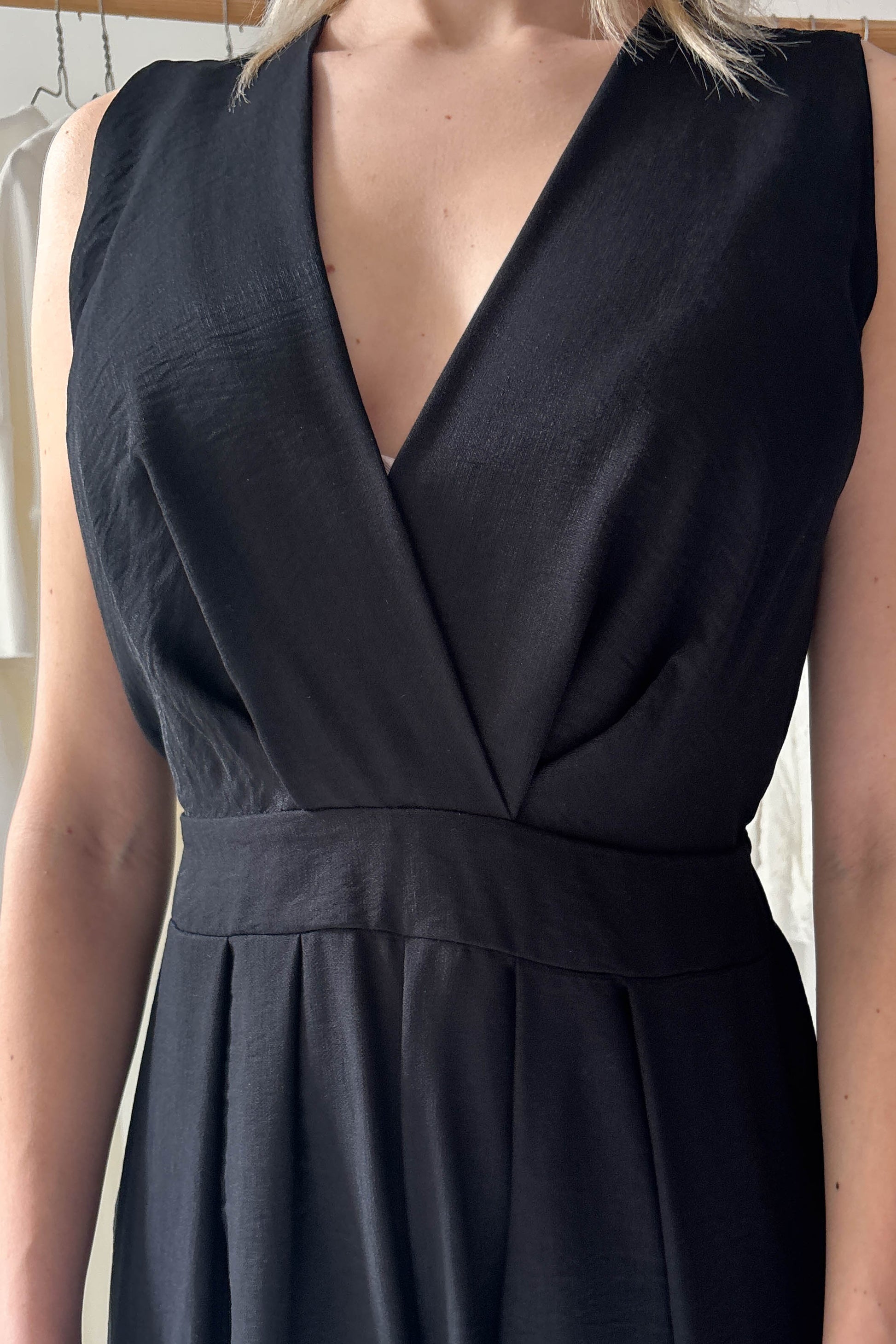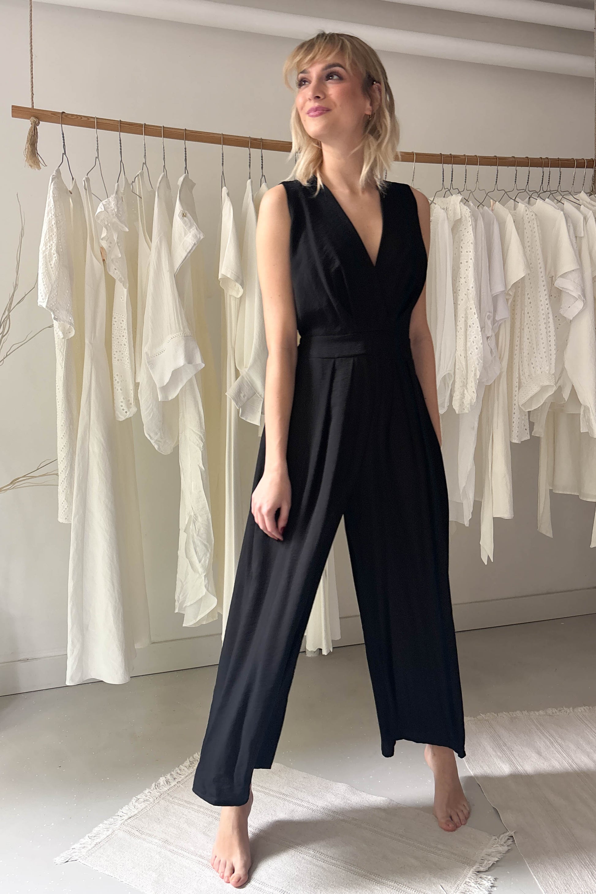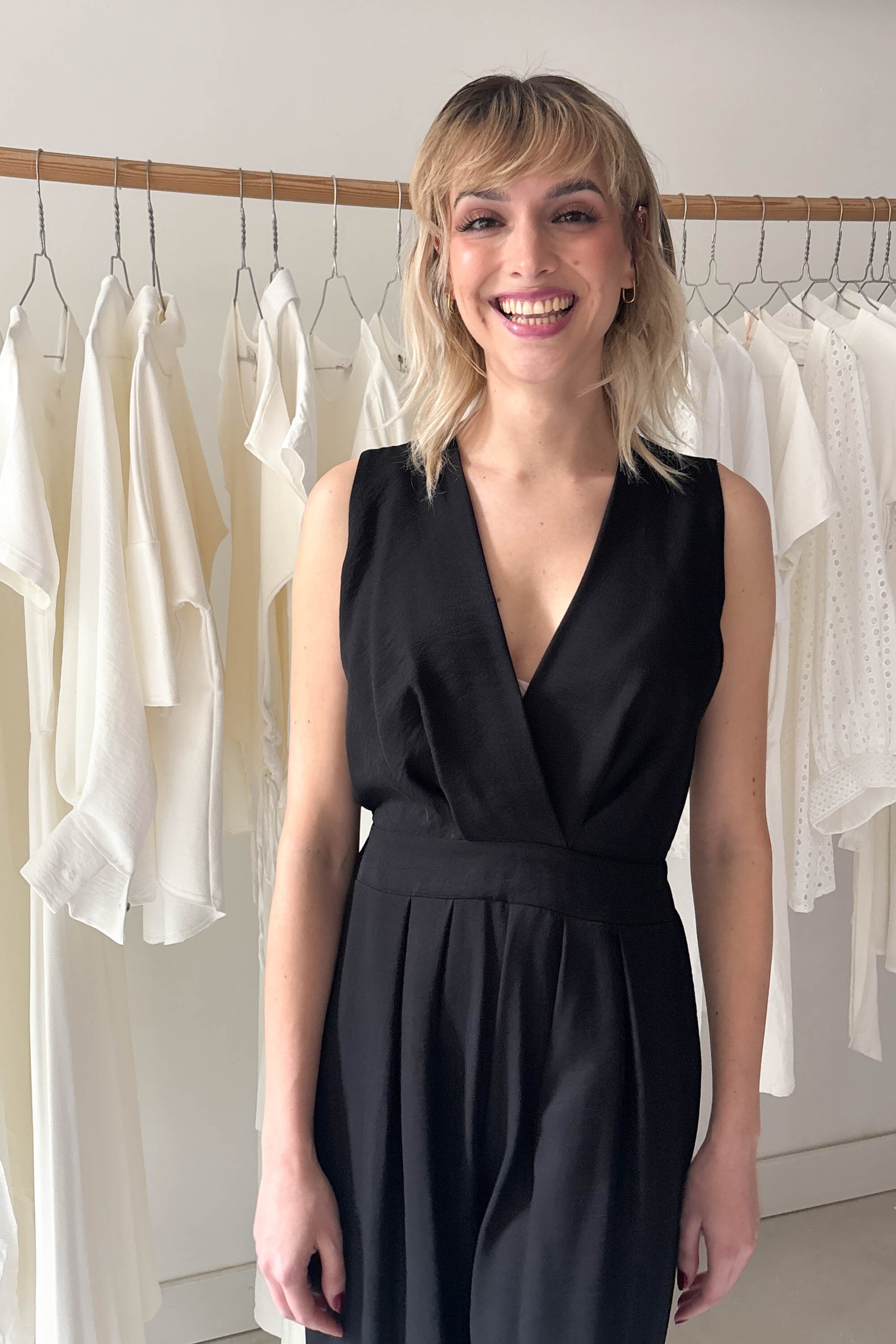 Enyhén gyűrt hatású elegáns overál. Lenge fazon, mell alatt hajtással, hátul kivágott és gumírozott .