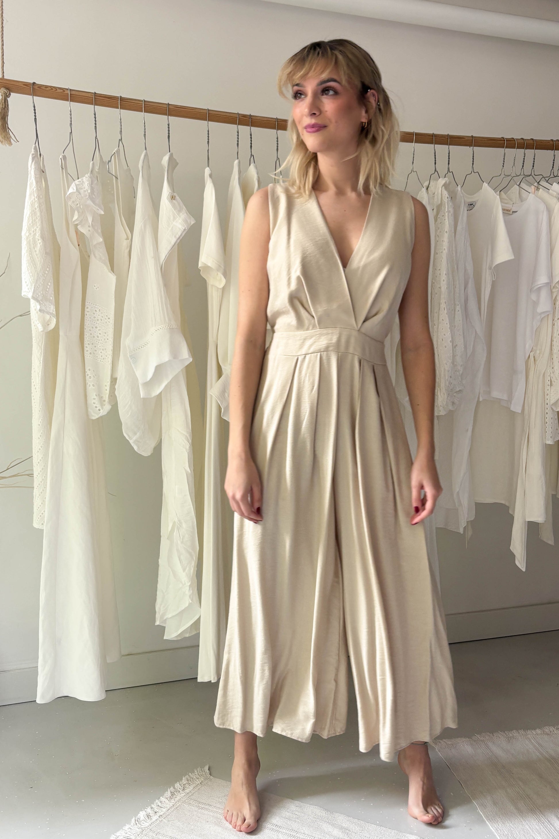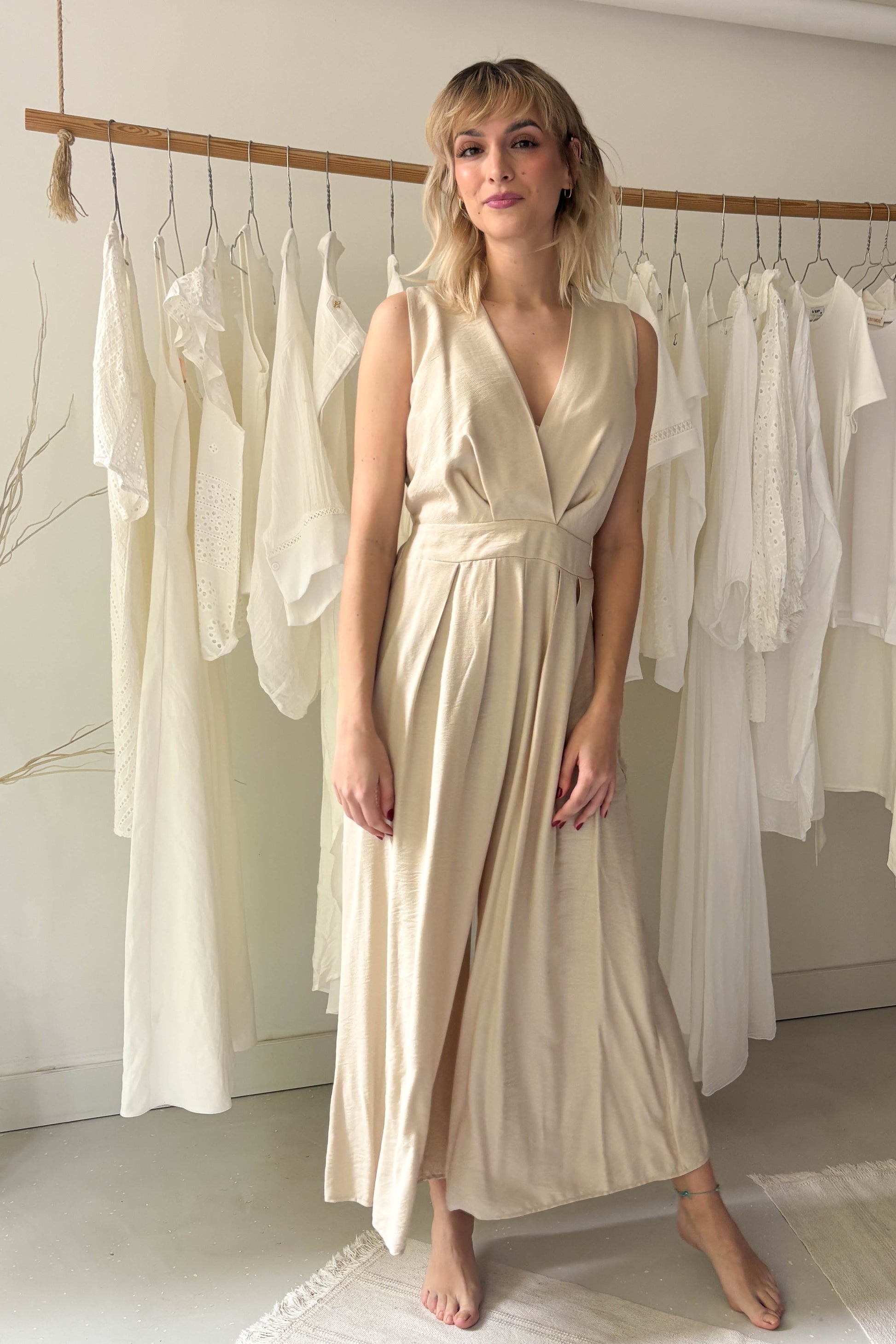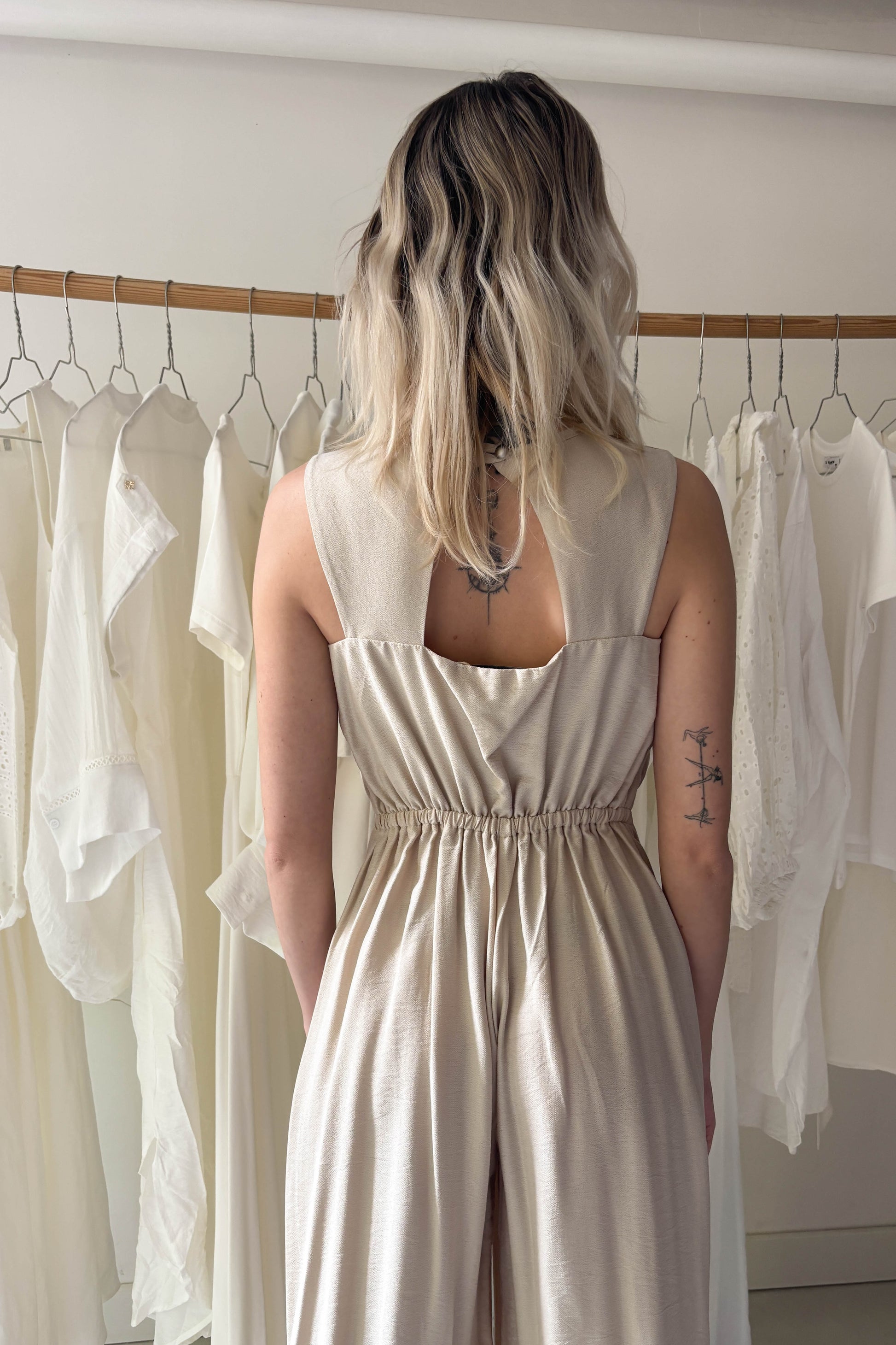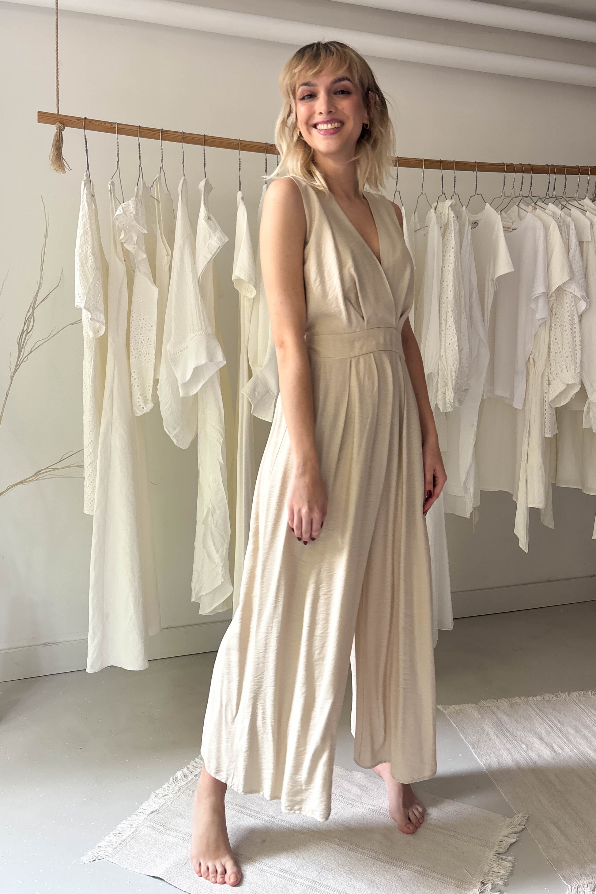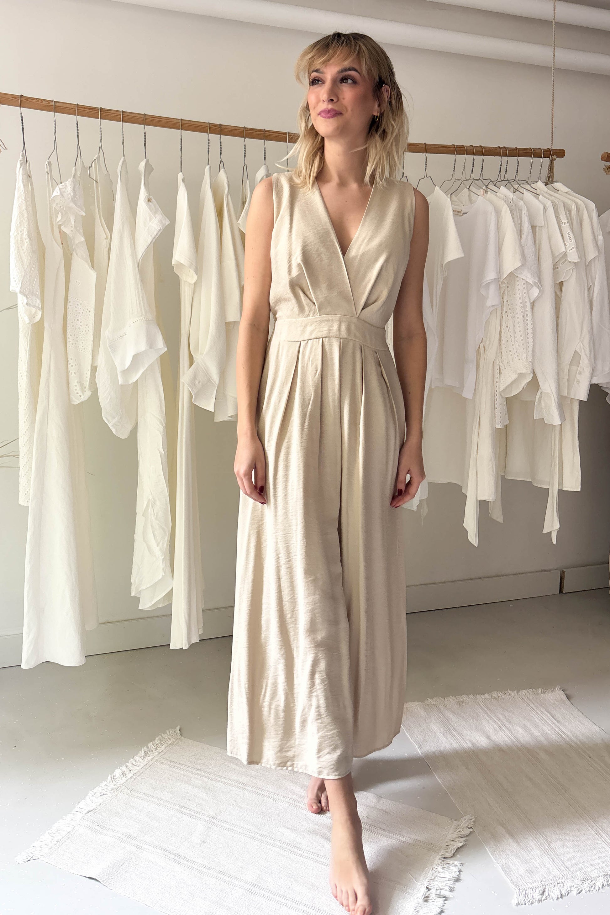Enyhén gyűrt hatású elegáns overál. Lenge fazon, mell alatt hajtással, hátul kivágott és gumírozott .