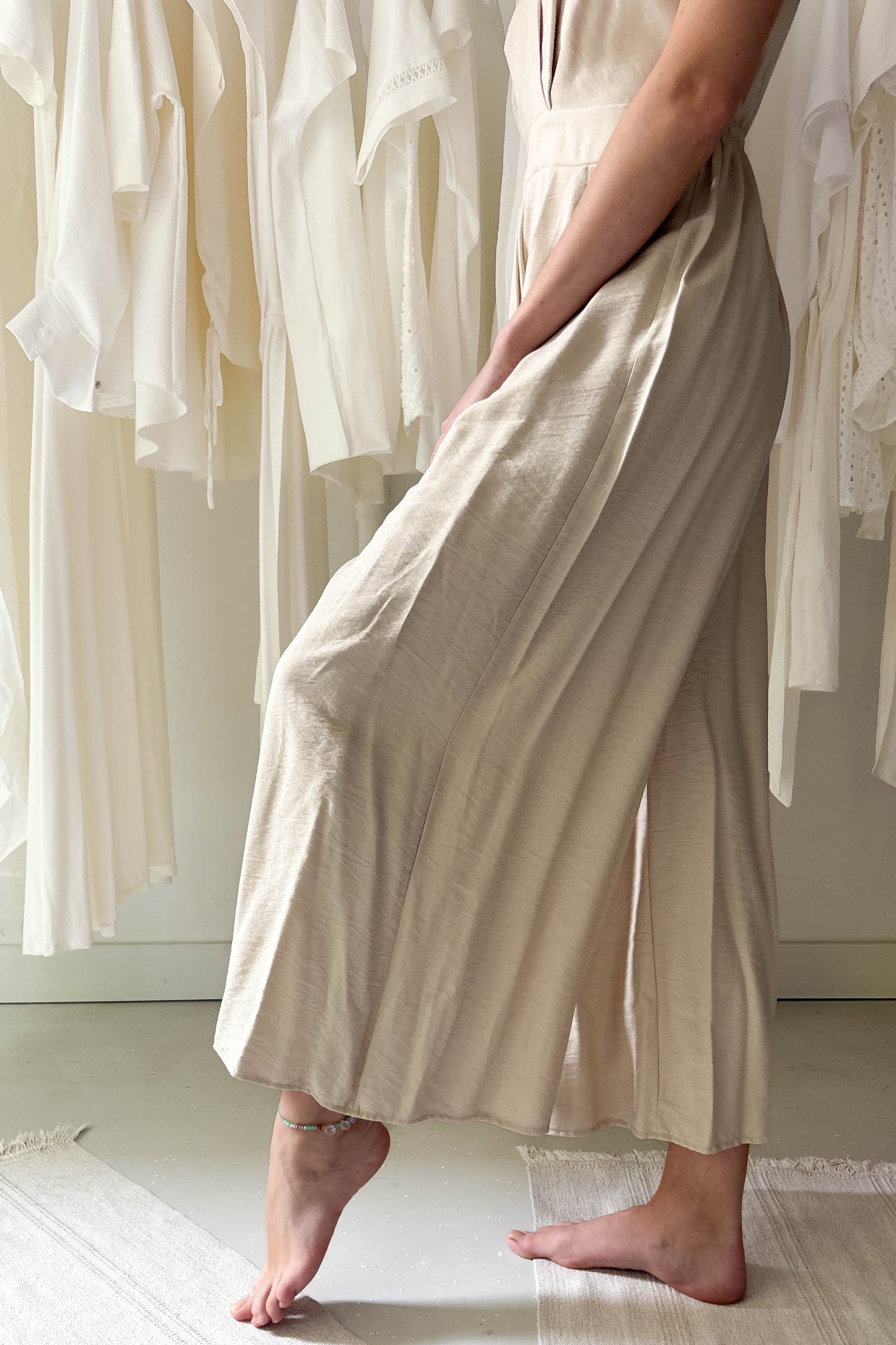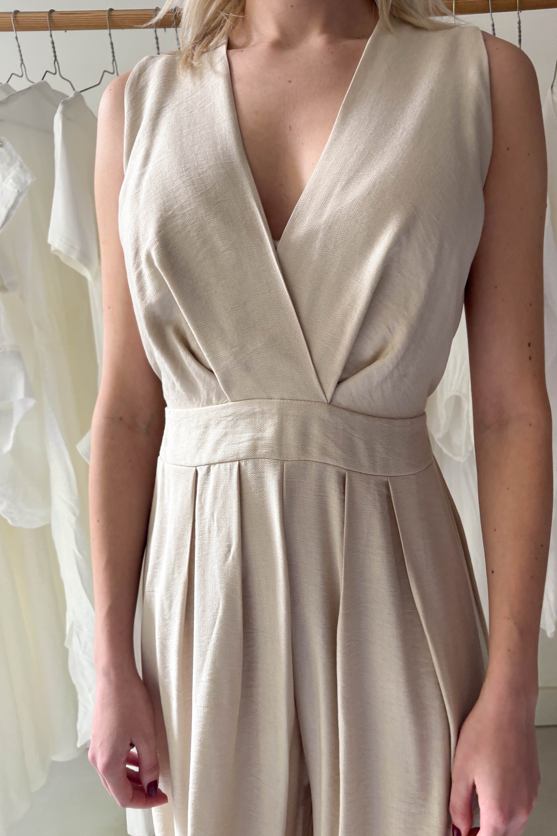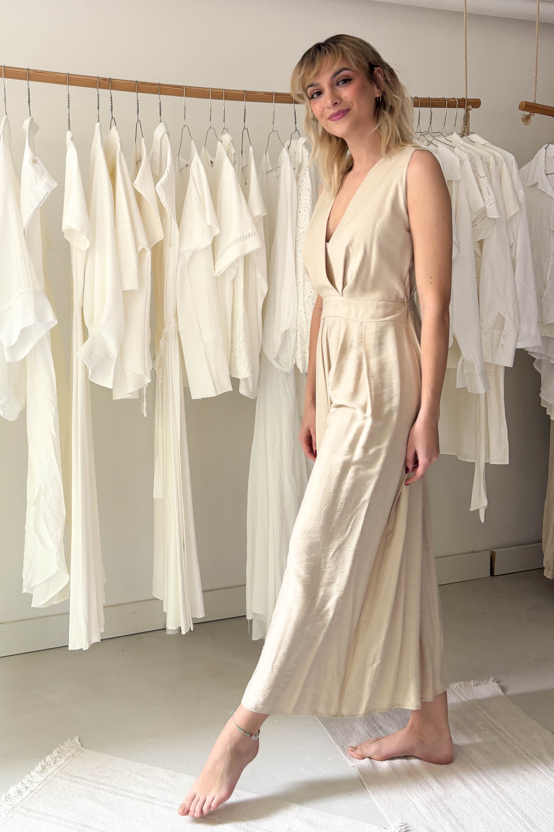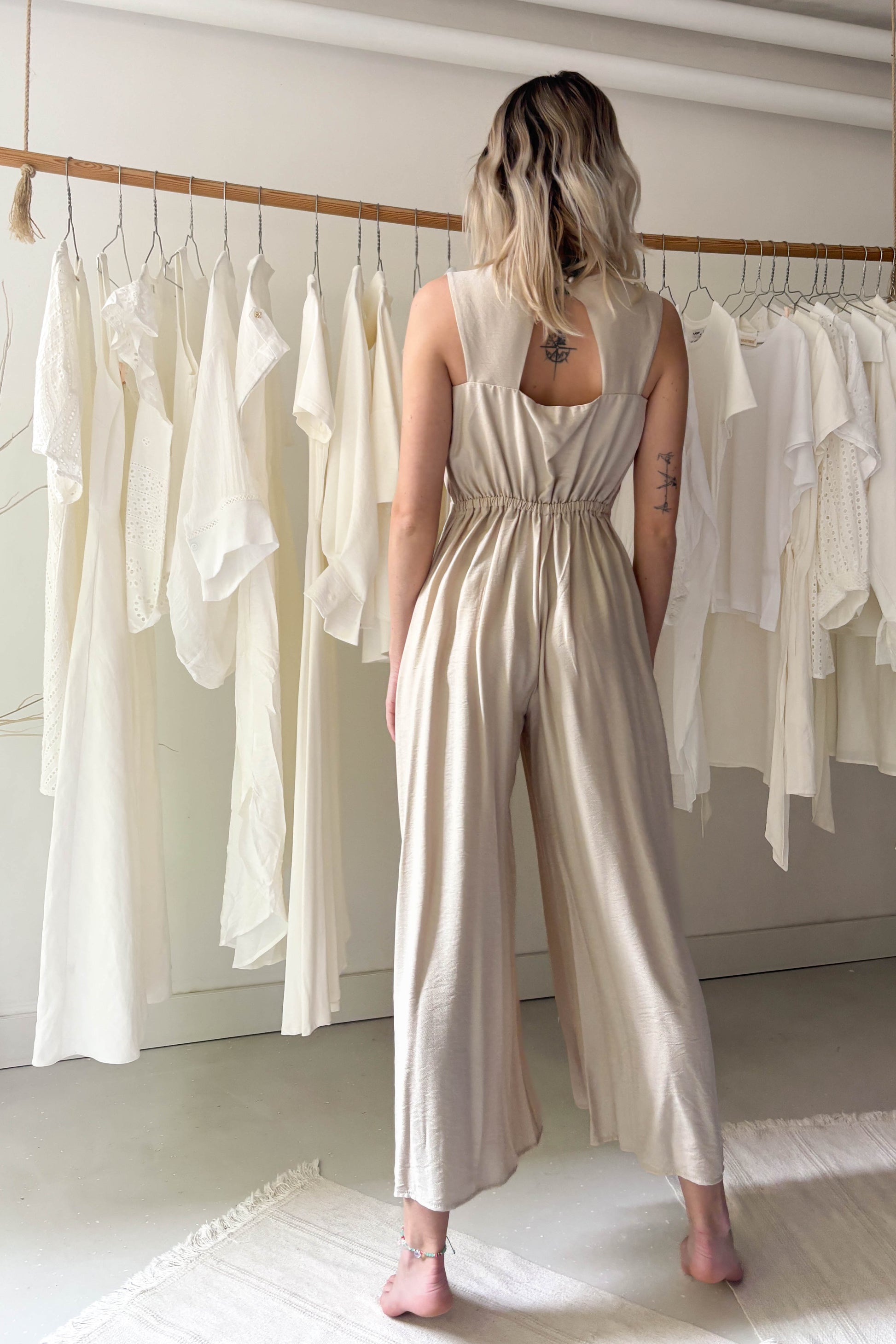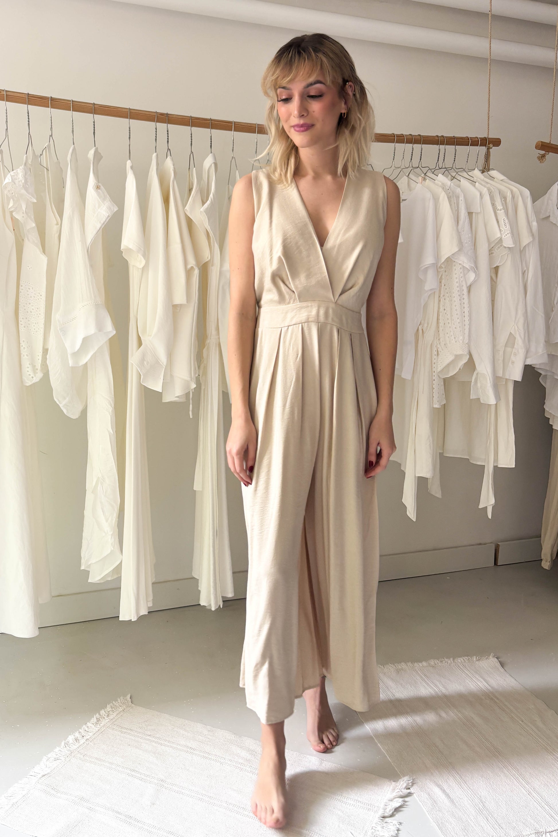 Enyhén gyűrt hatású elegáns overál. Lenge fazon, mell alatt hajtással, hátul kivágott és gumírozott .