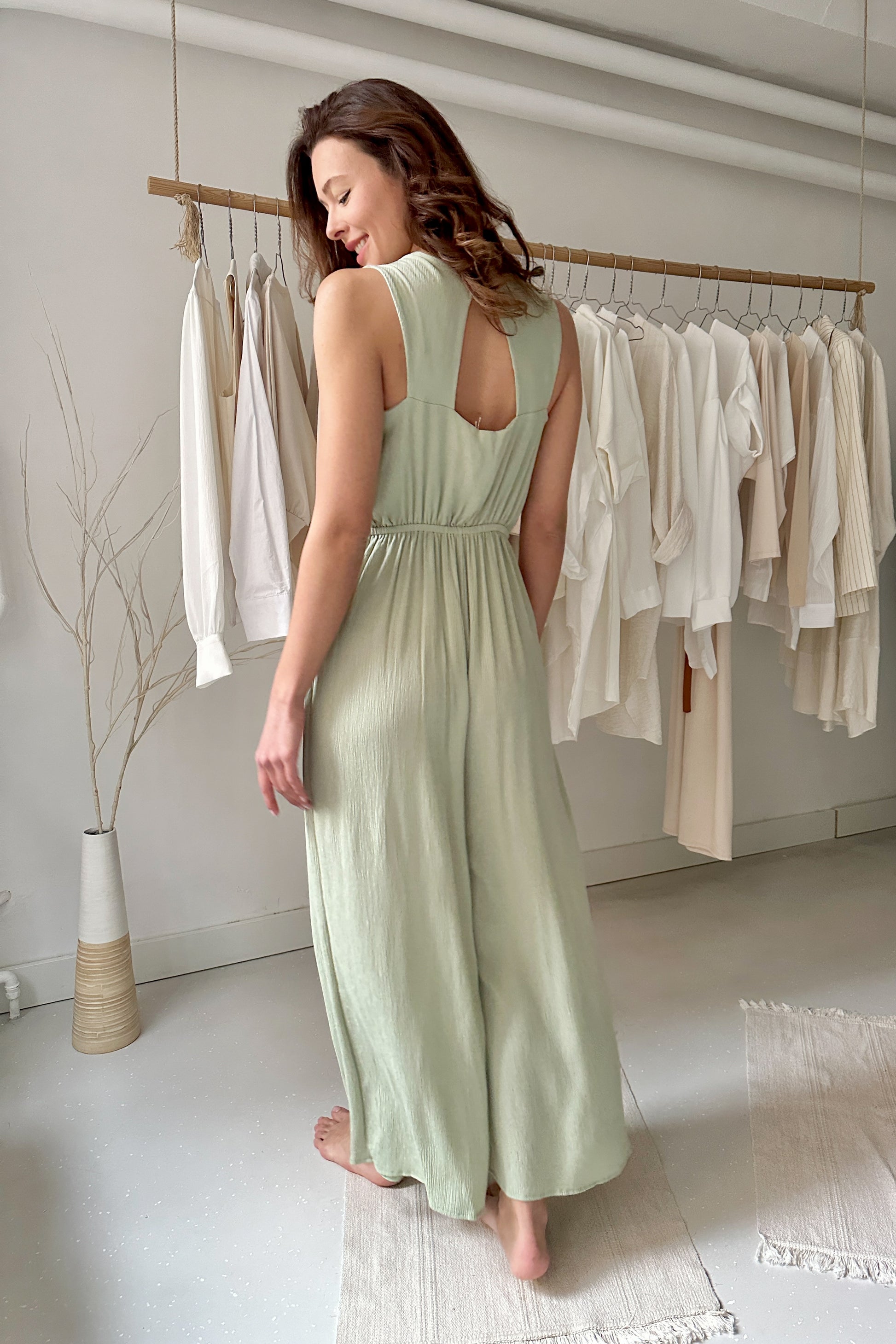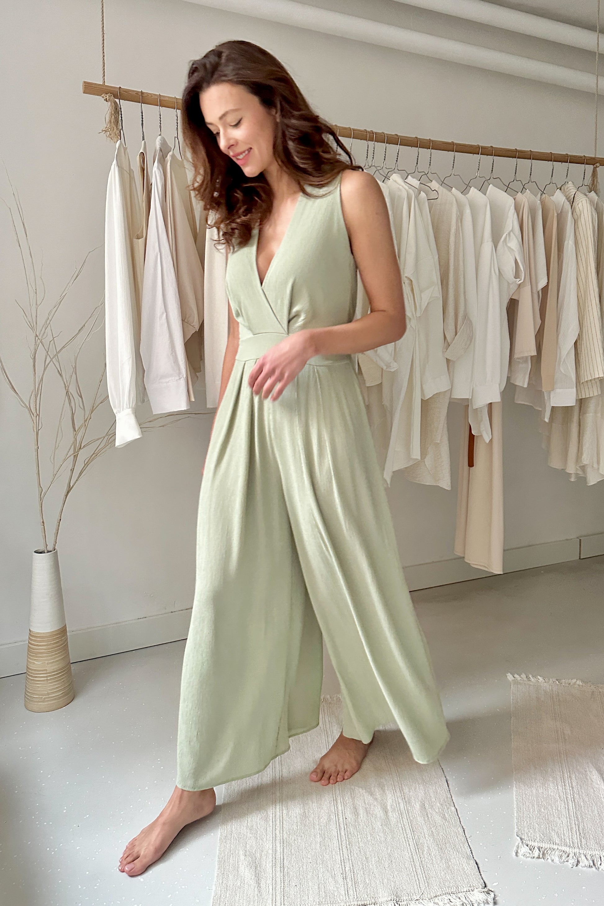 Enyhén gyűrt hatású, 100% viszkóz anyagból készült egyméretes overál. Lenge, elegáns fazon, mell alatt hajtással, hátul gumírozással. 34-38-as konfekcióméretig ajánljuk. Csak kézi mosással mosható.