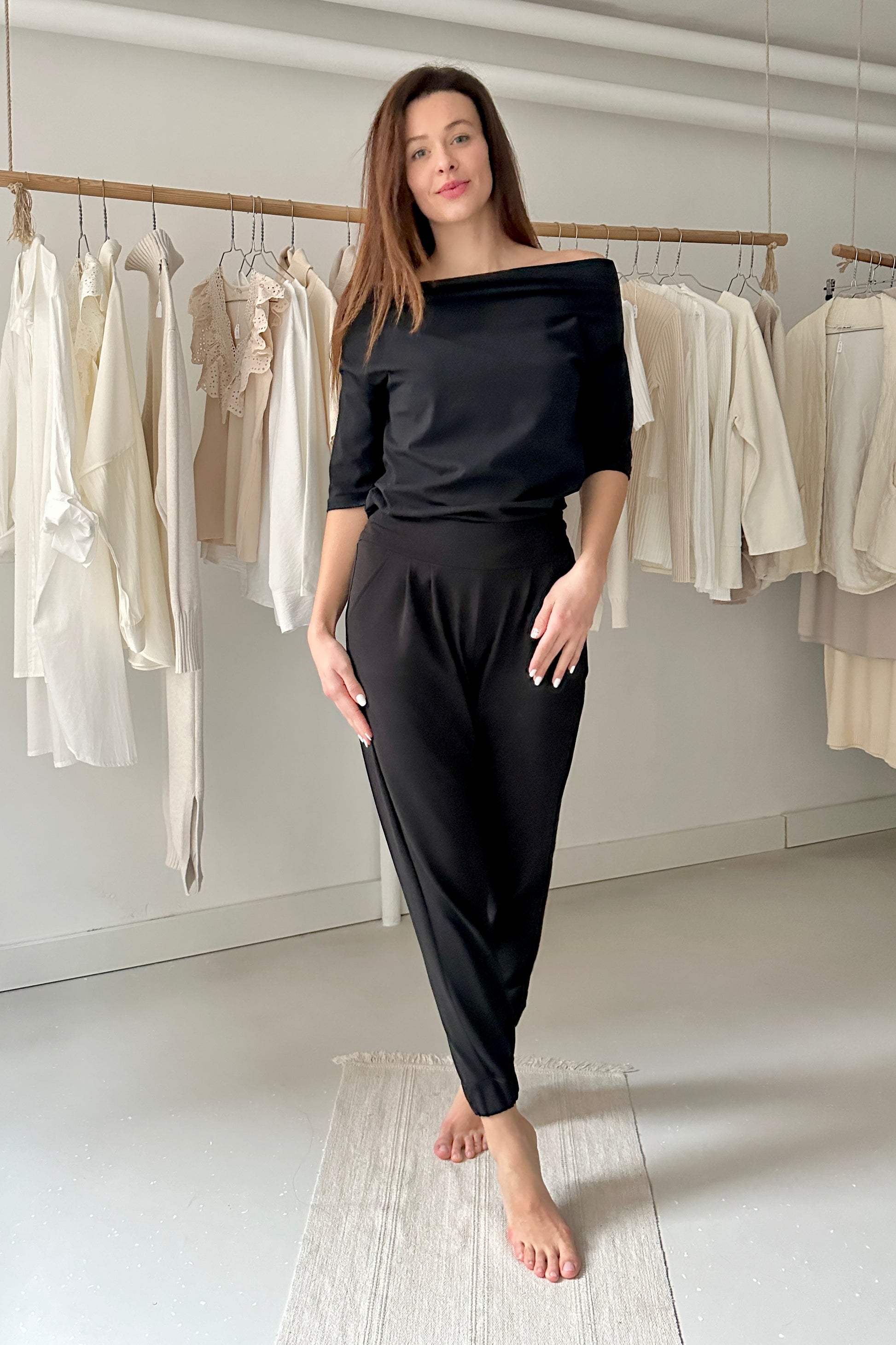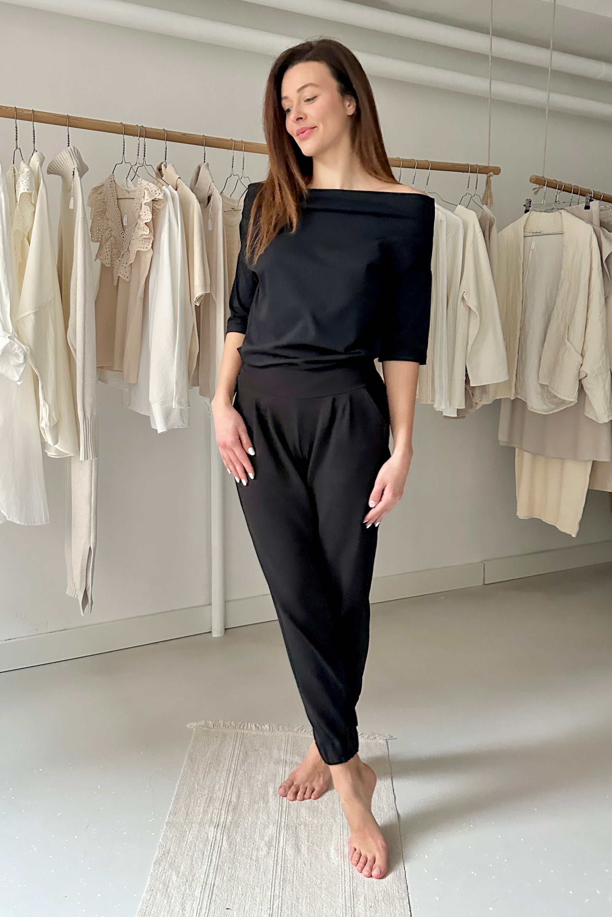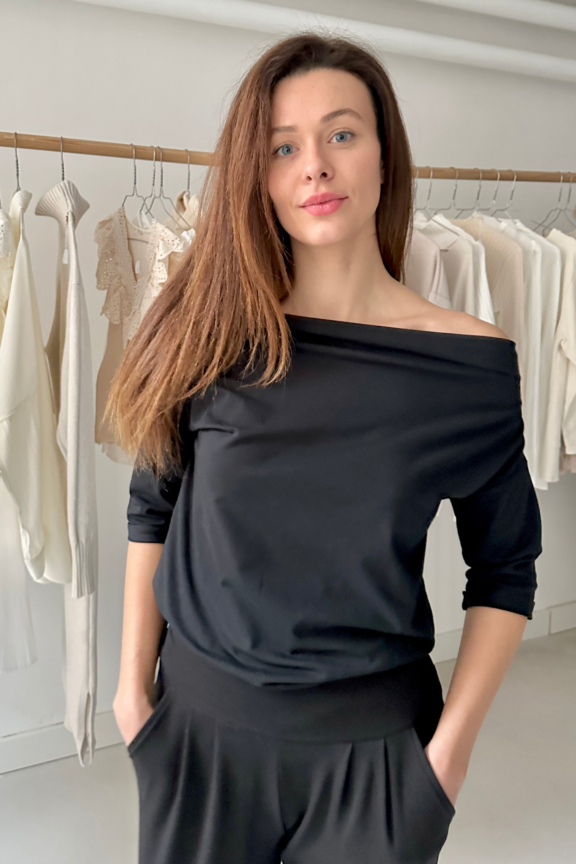 Puha, pamutban gazdag anyagból készült bő szabású felső széles csónaknyakkal, 3/4-es ujjhosszal. Kényelmes, laza viselet. Egyméretes
