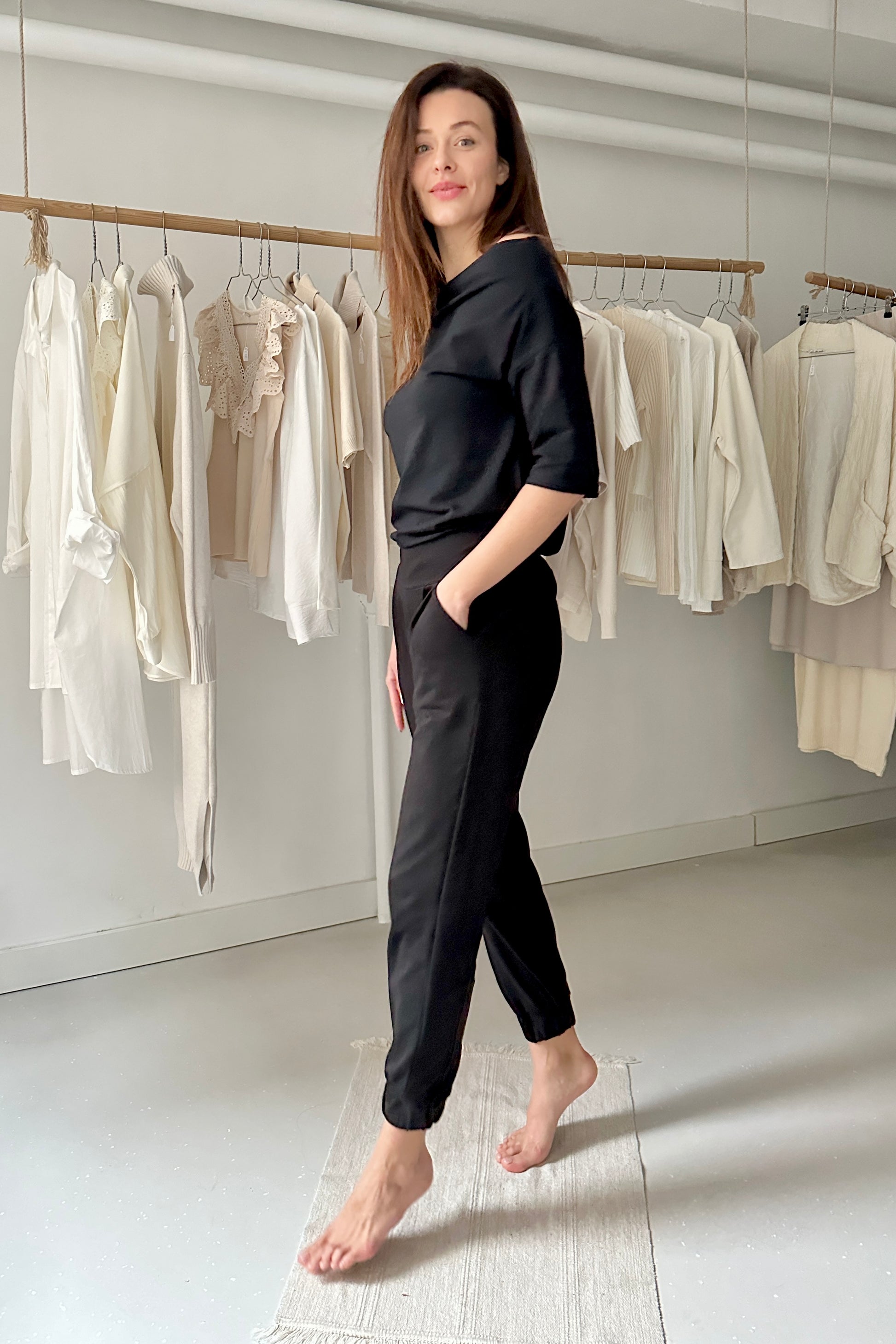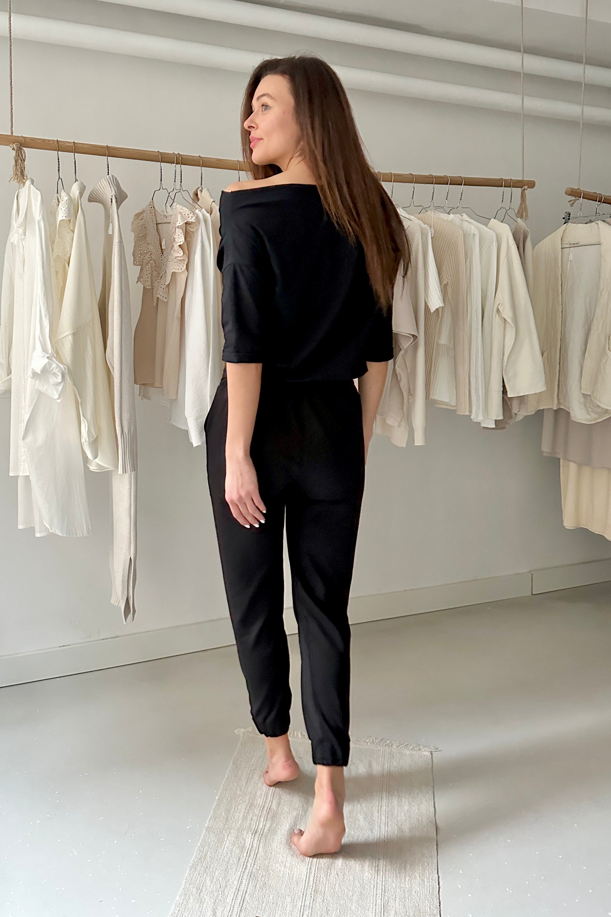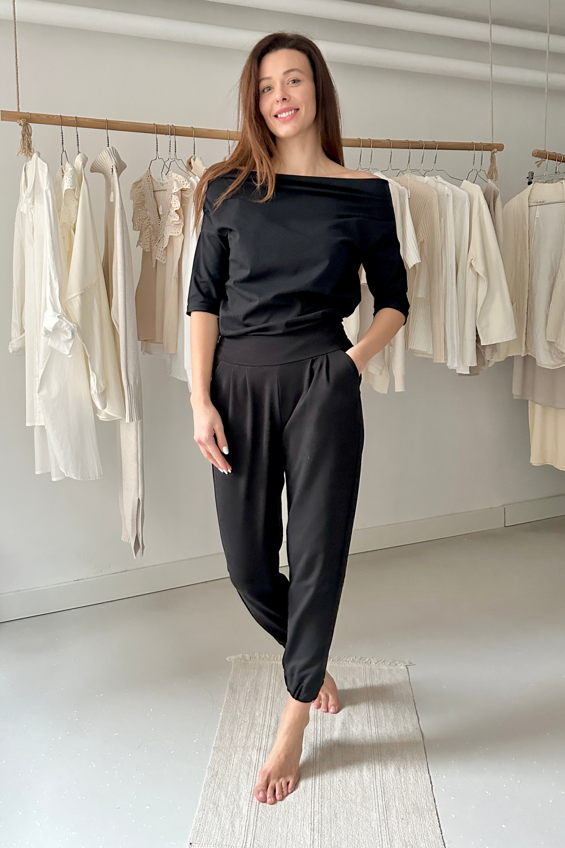 Puha, pamutban gazdag anyagból készült bő szabású felső széles csónaknyakkal, 3/4-es ujjhosszal. Kényelmes, laza viselet. Egyméretes