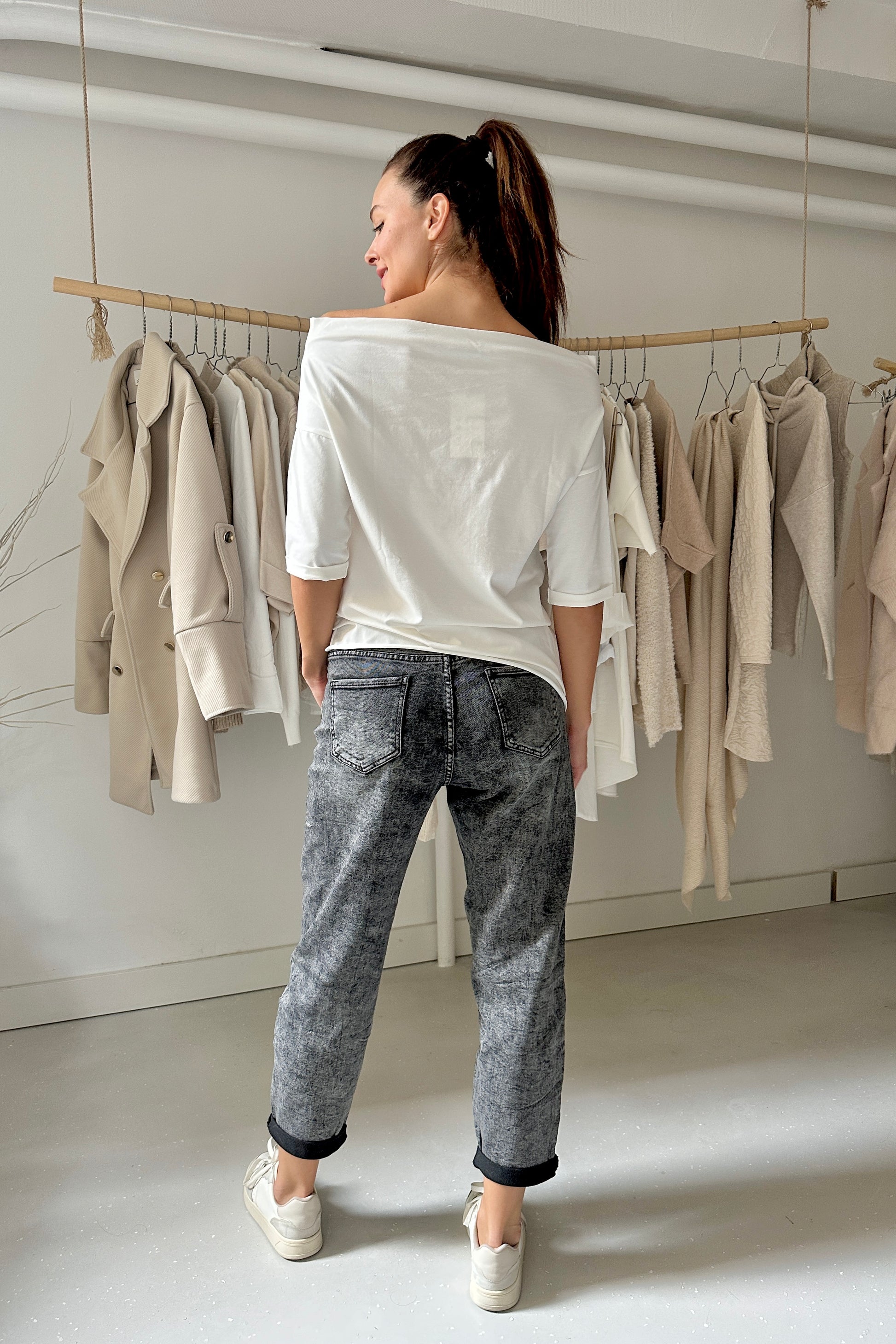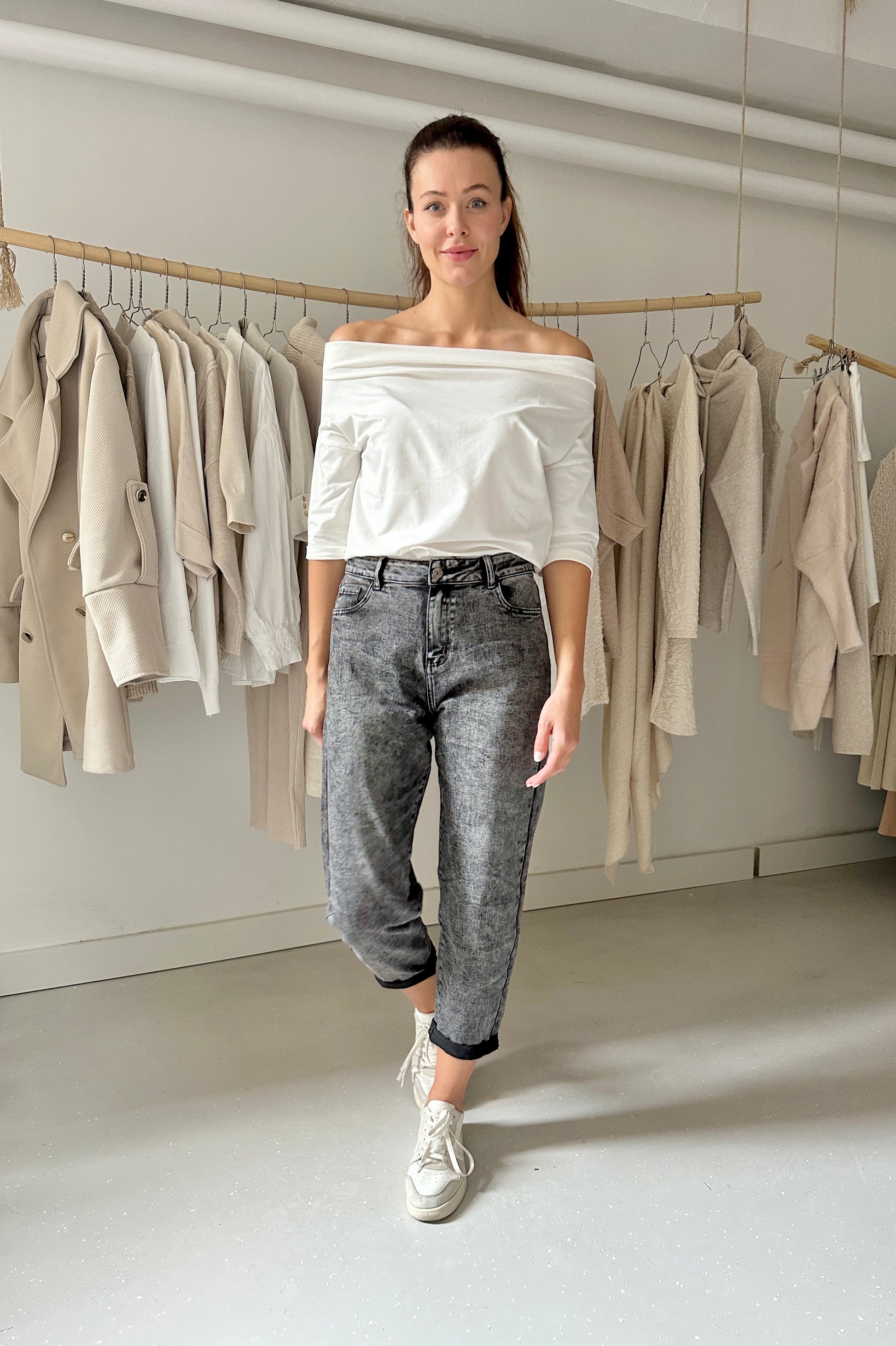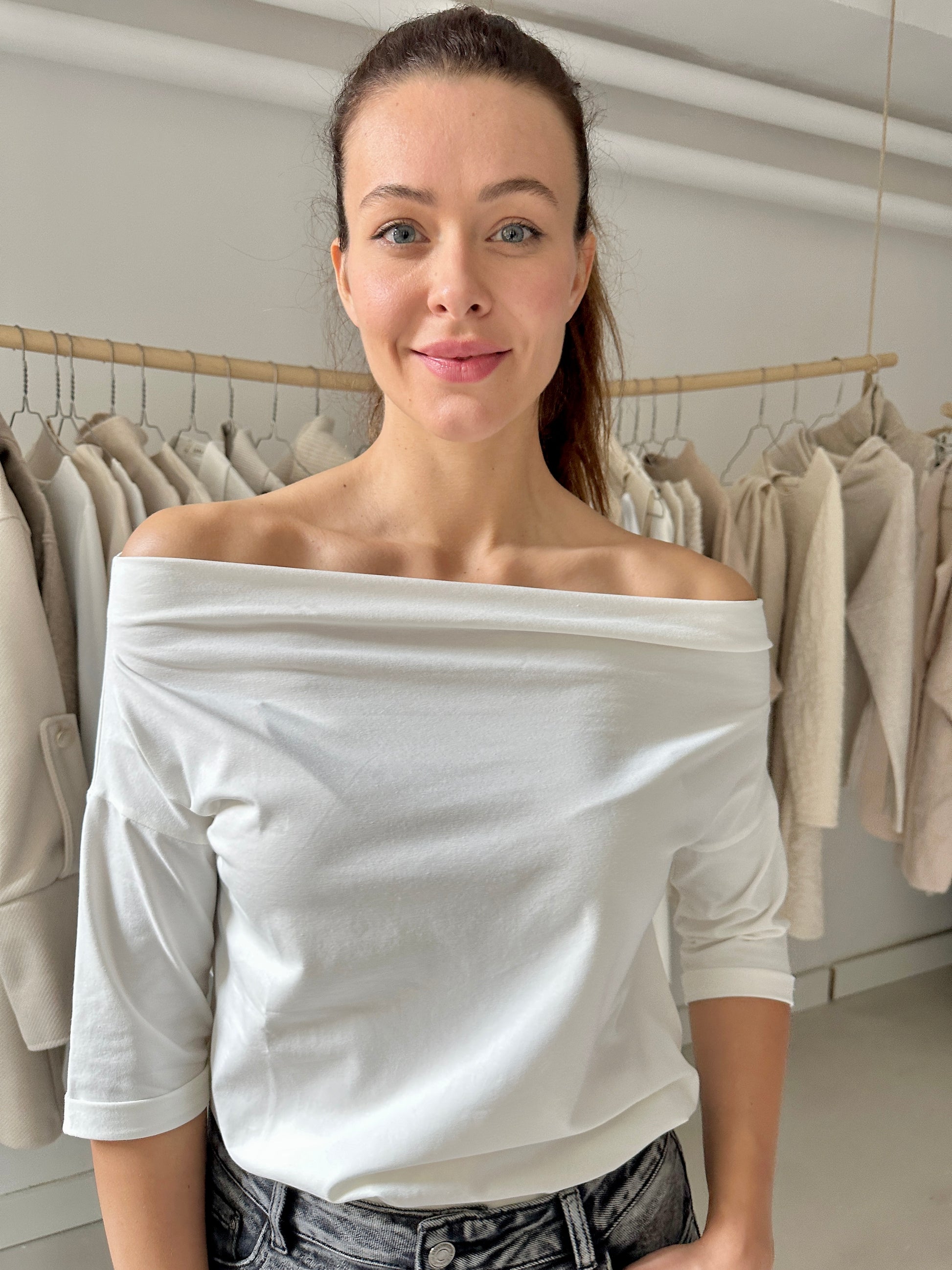 Puha, pamutban gazdag anyagból készült bő szabású felső széles csónaknyakkal, 3/4-es ujjhosszal. Kényelmes, laza viselet.  Egyméretes