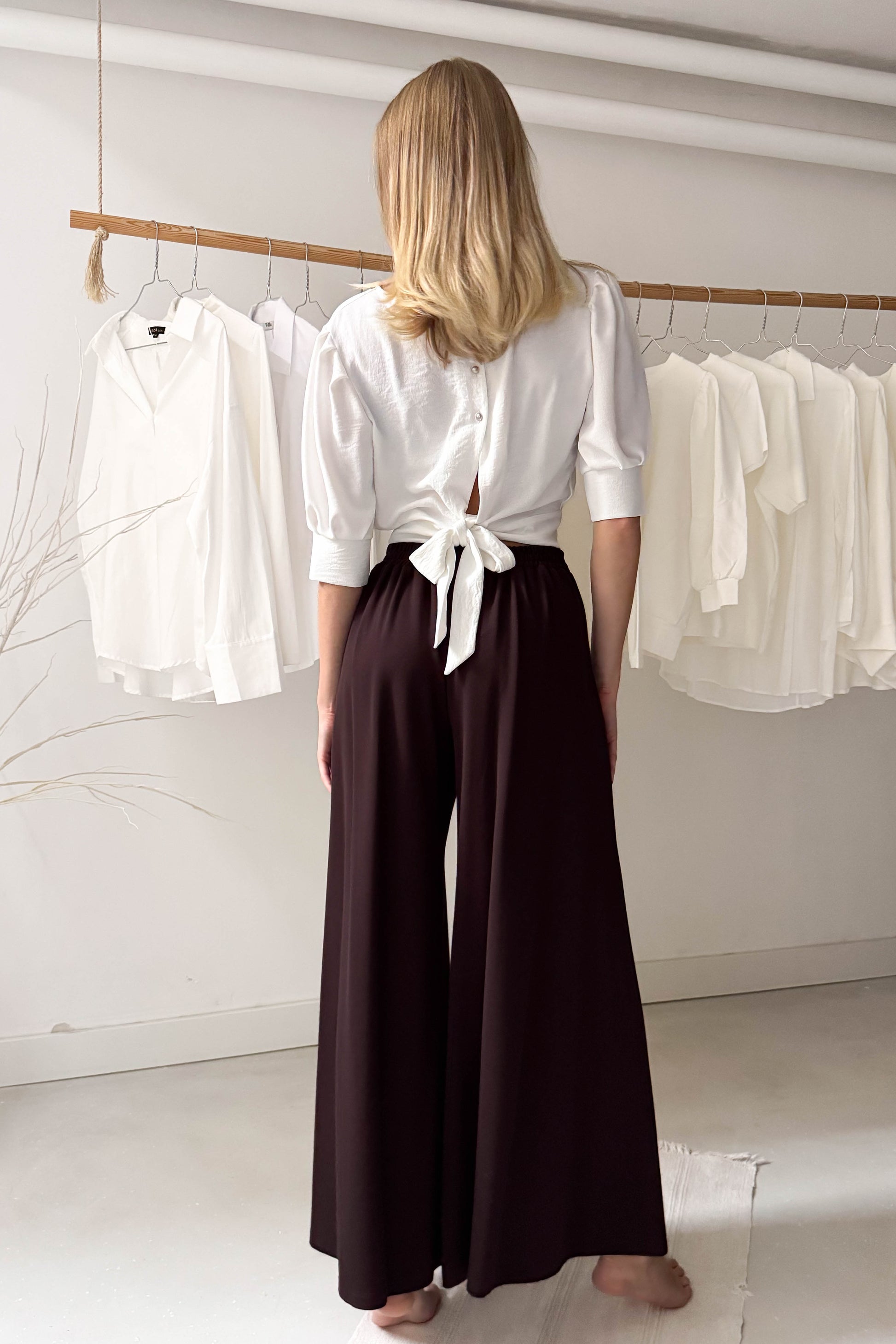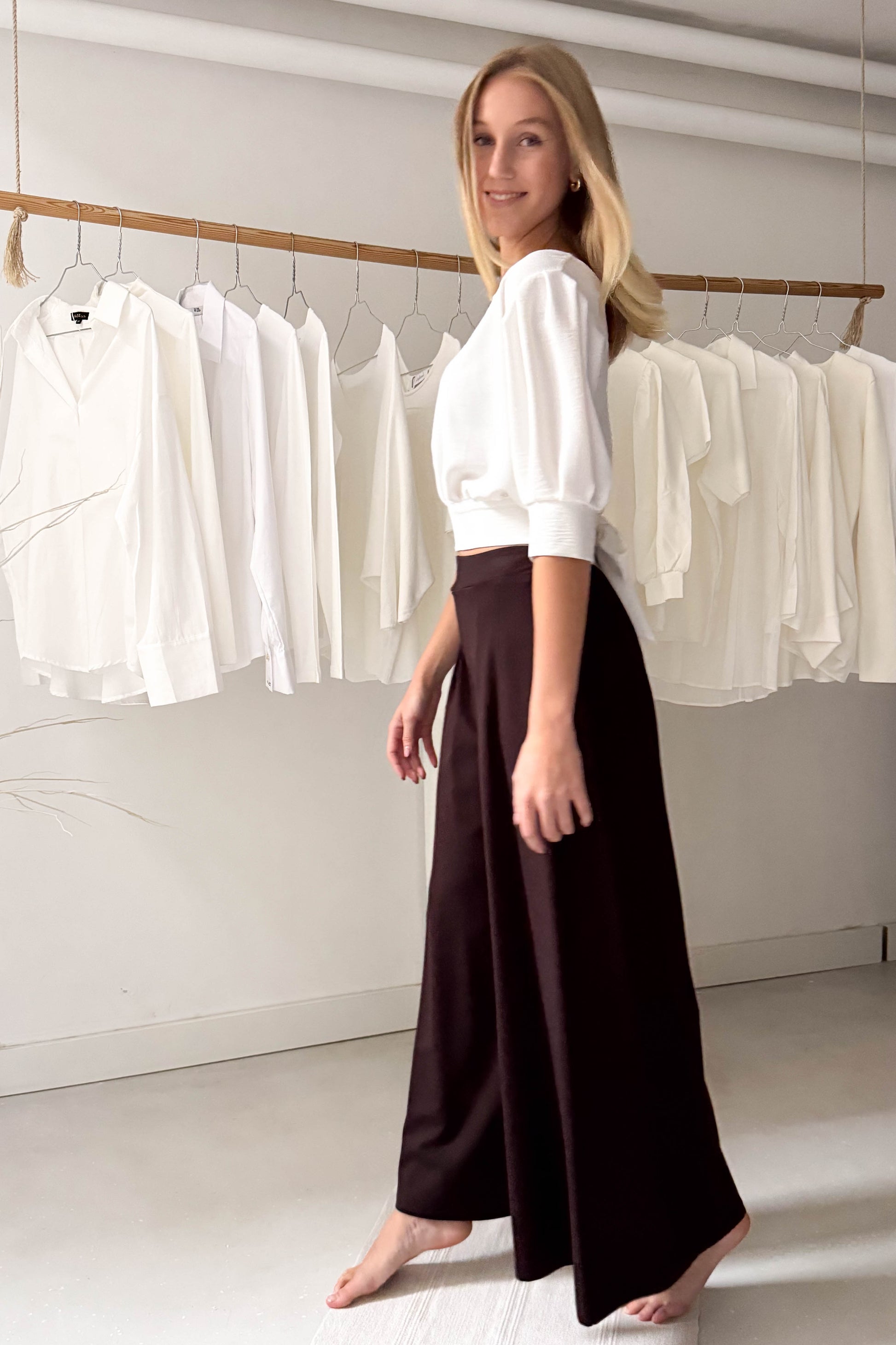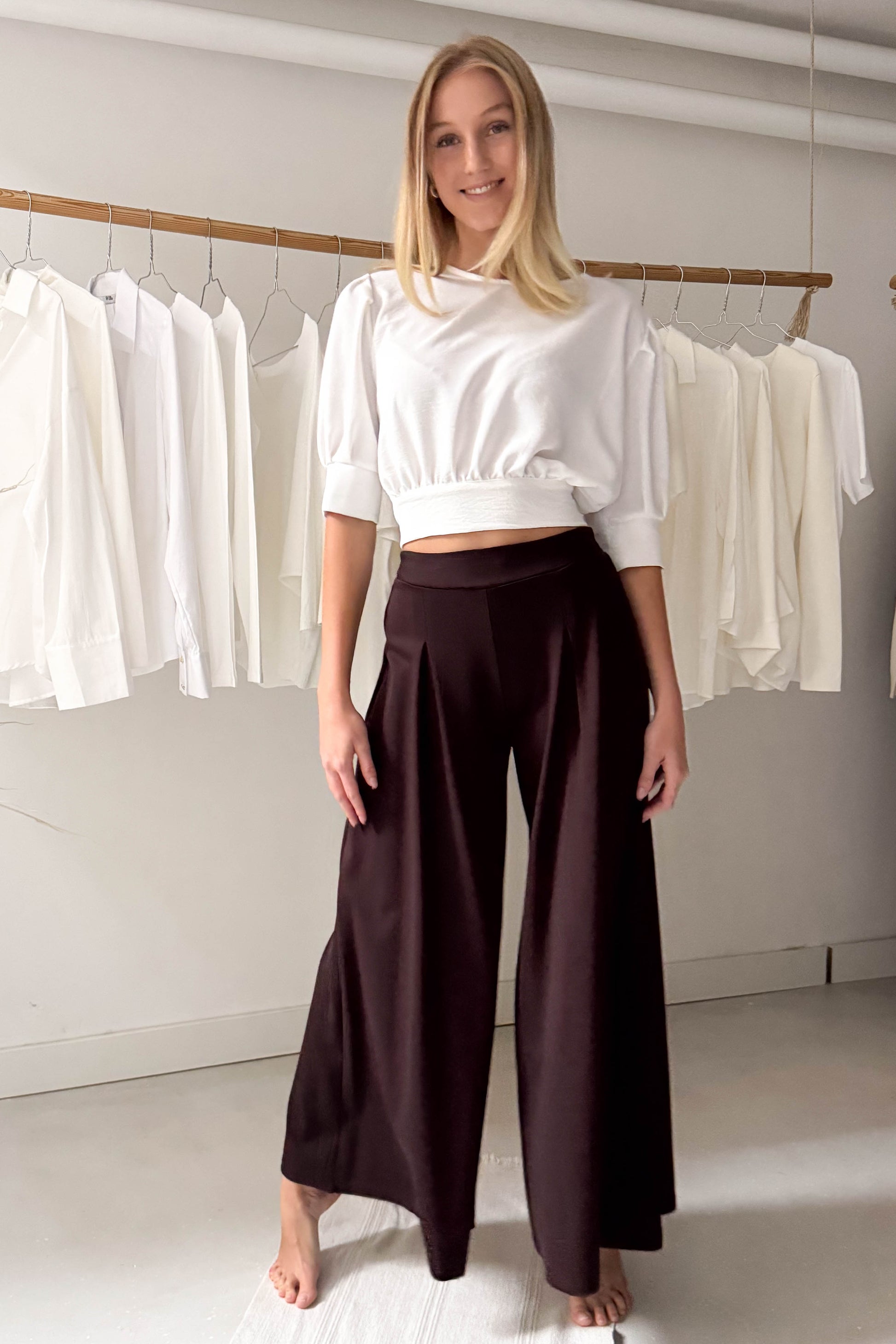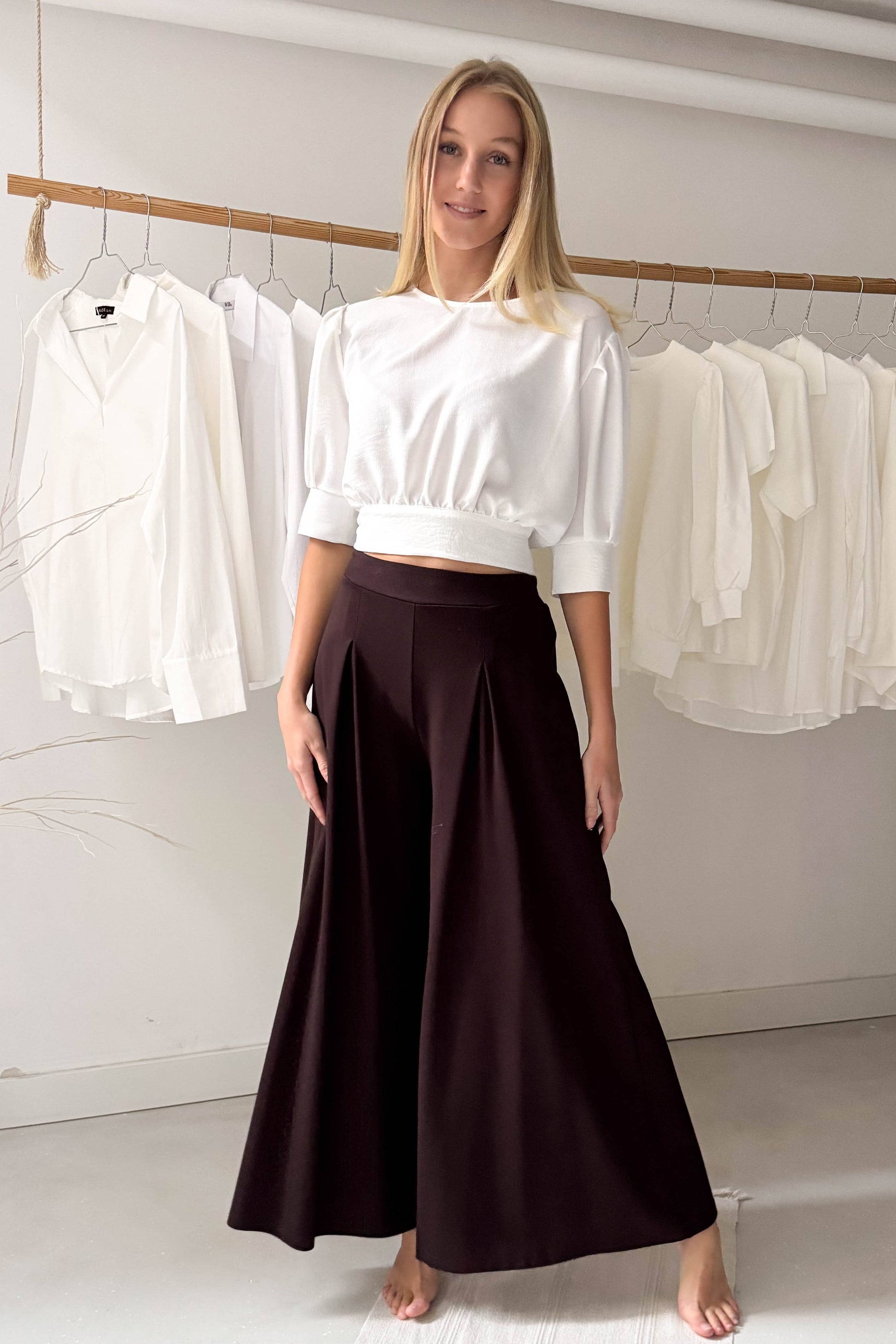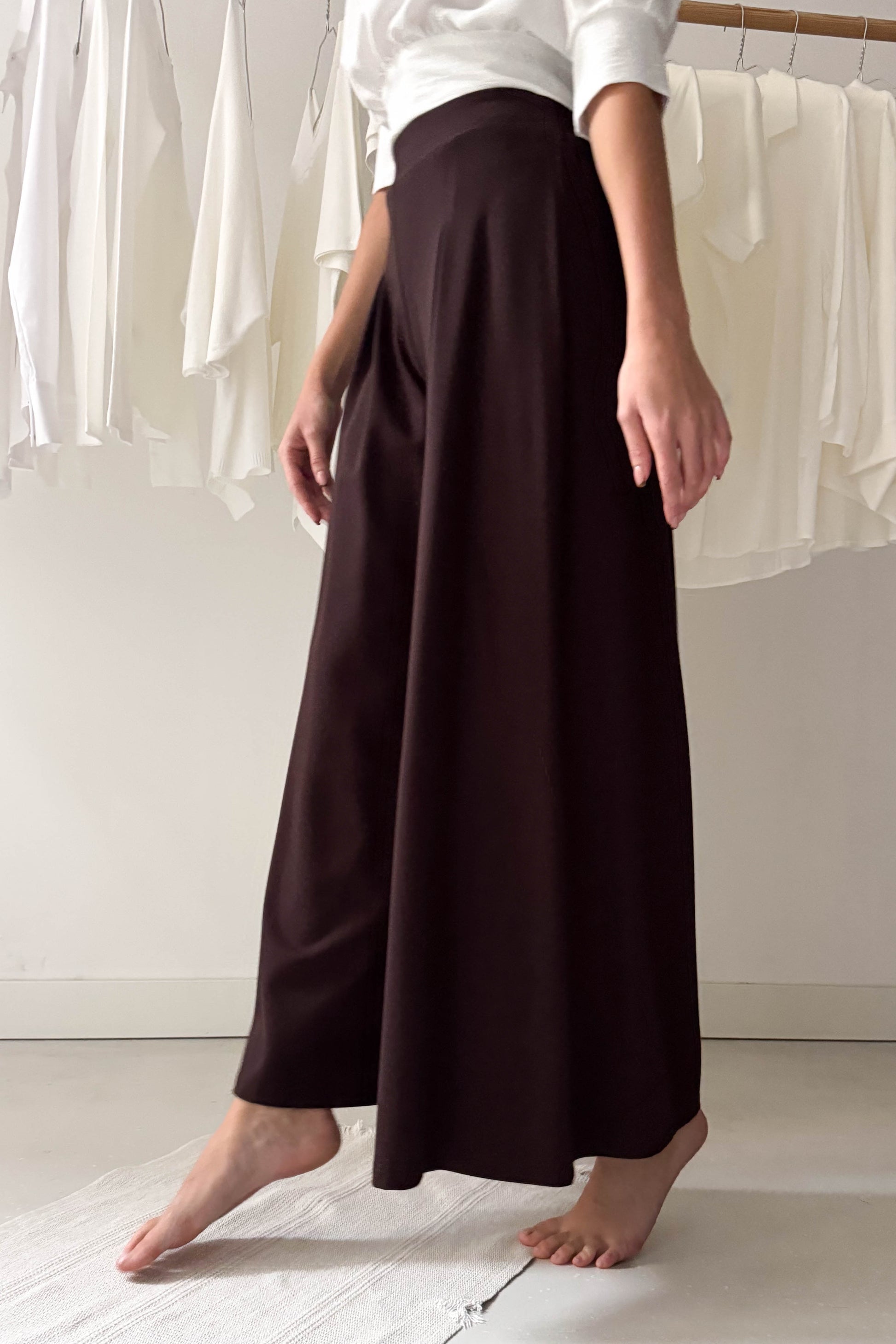 Vastagabb anyagból készült nadrág csokibarna színben. Derékrészen elöl hajtásos, hátul gumírozott. Bőszárú, lenge fazon.