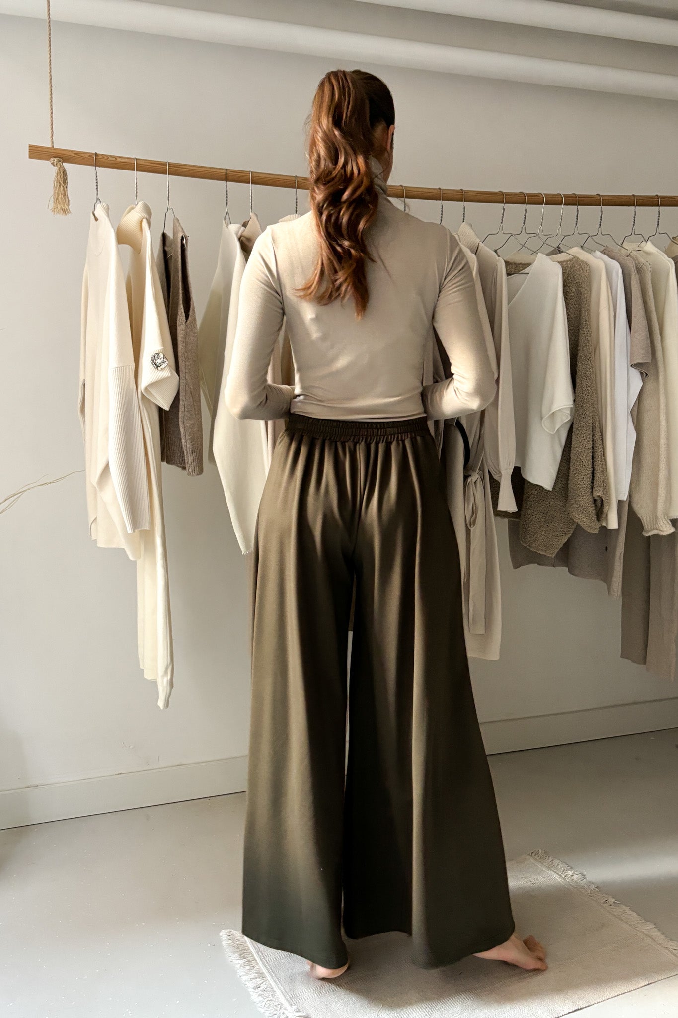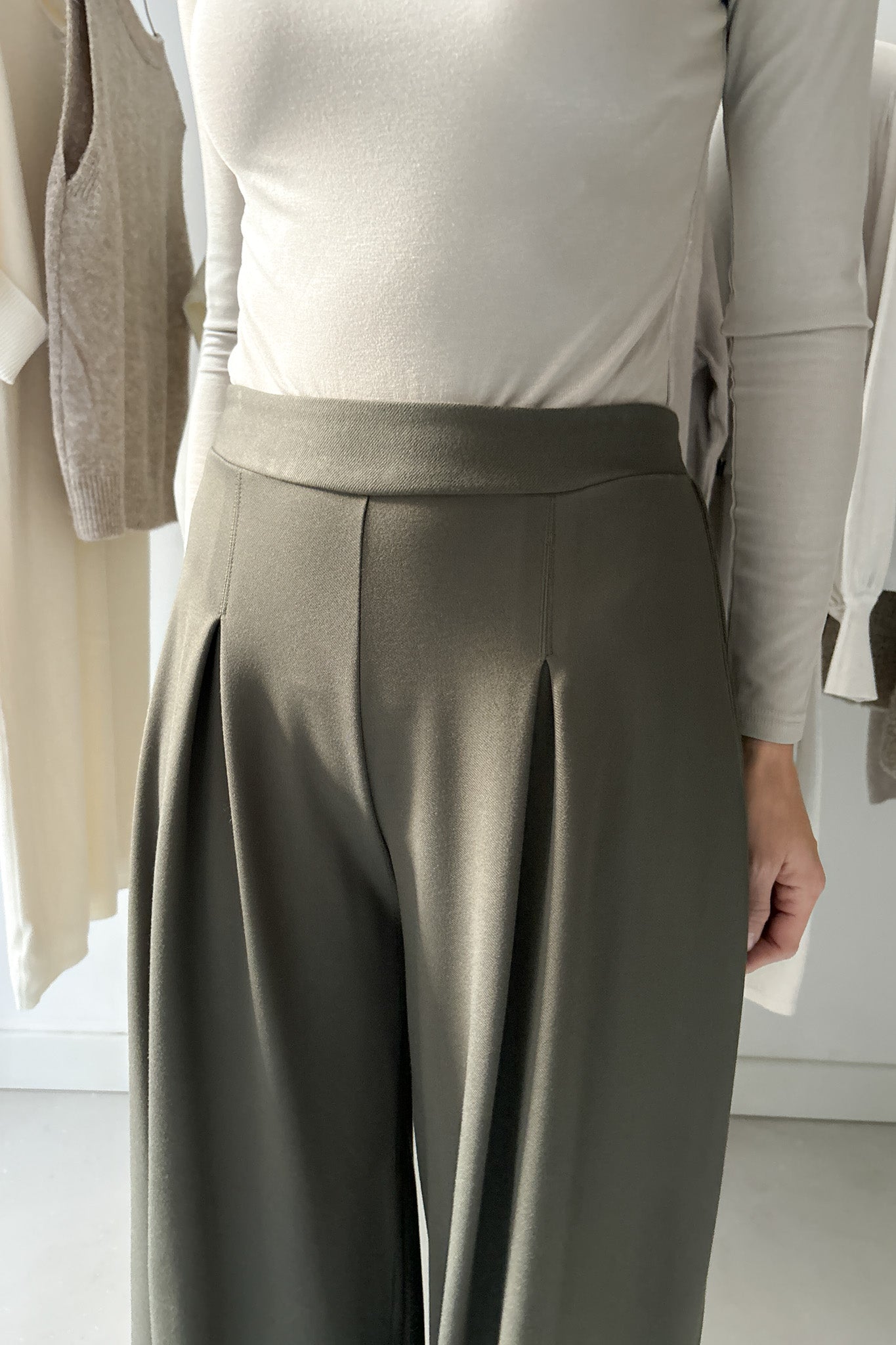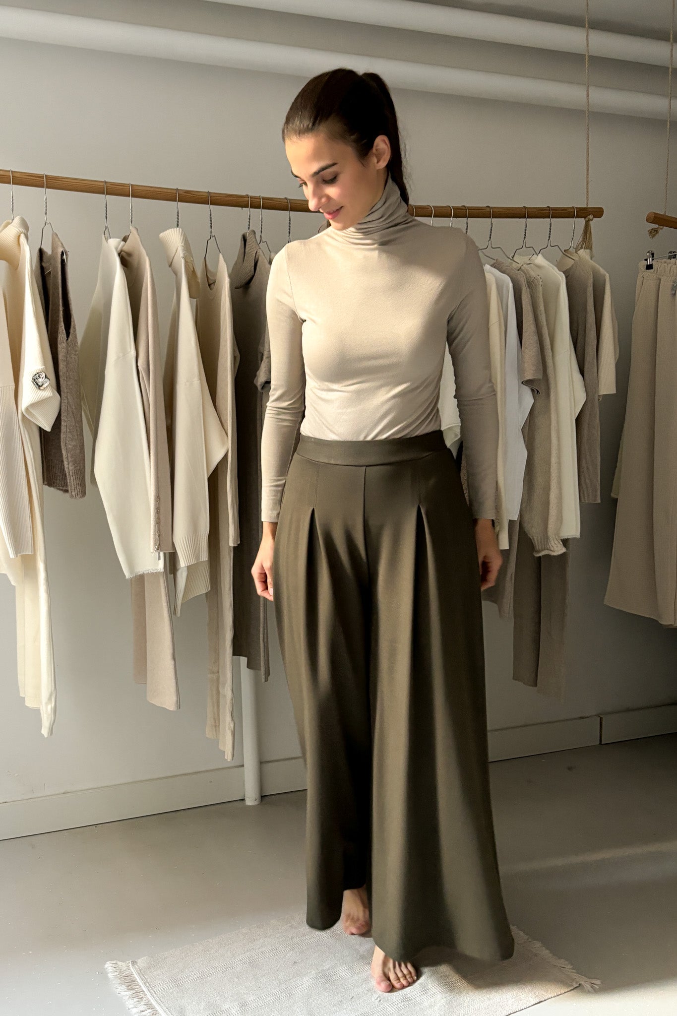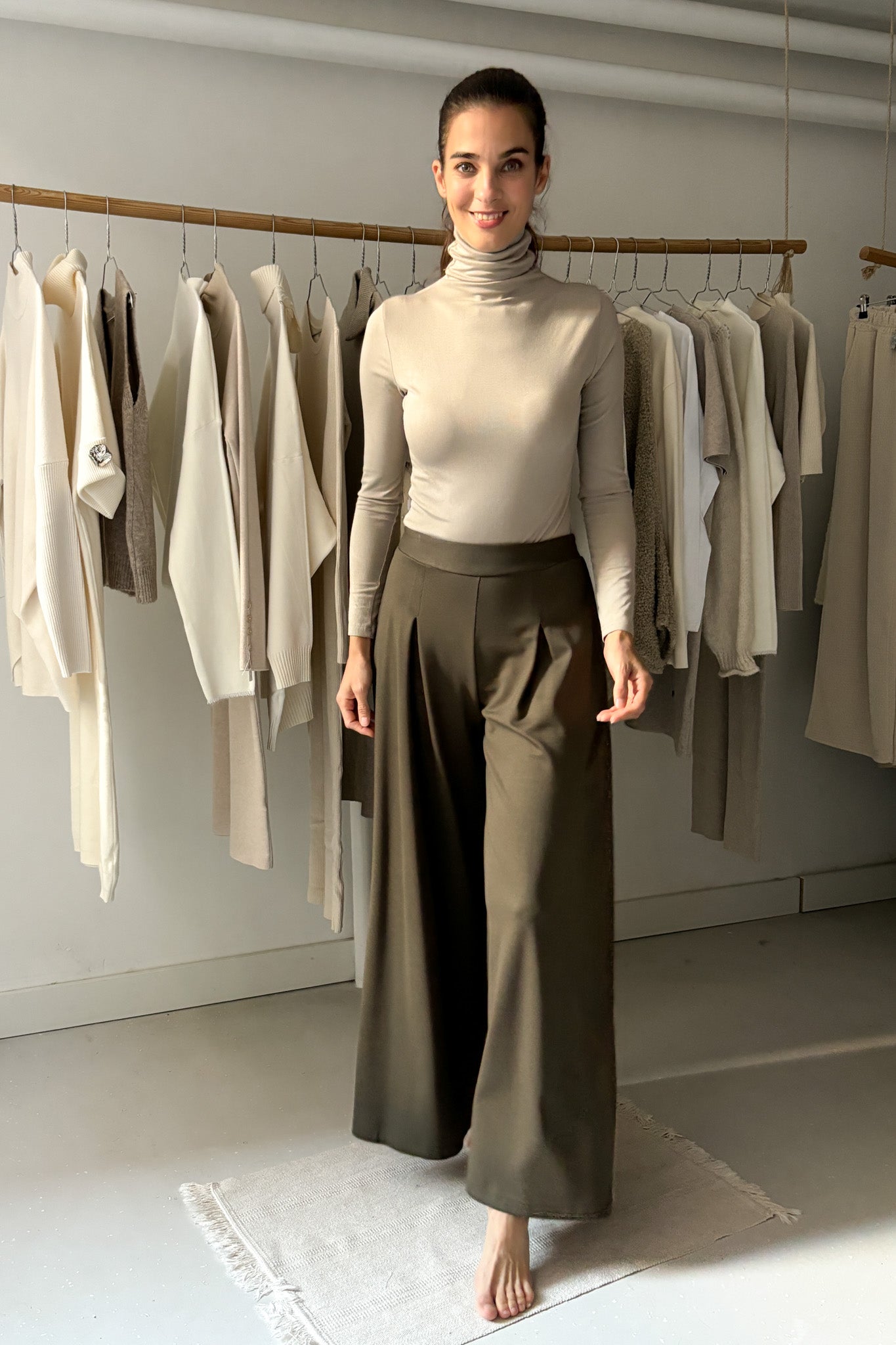 Vastagabb anyagból készült, viszkóz nadrág erdőzöld színben. Elölhajtásos, Hátul, derékrészen gumírozott. Bőszárú, lenge fazon.