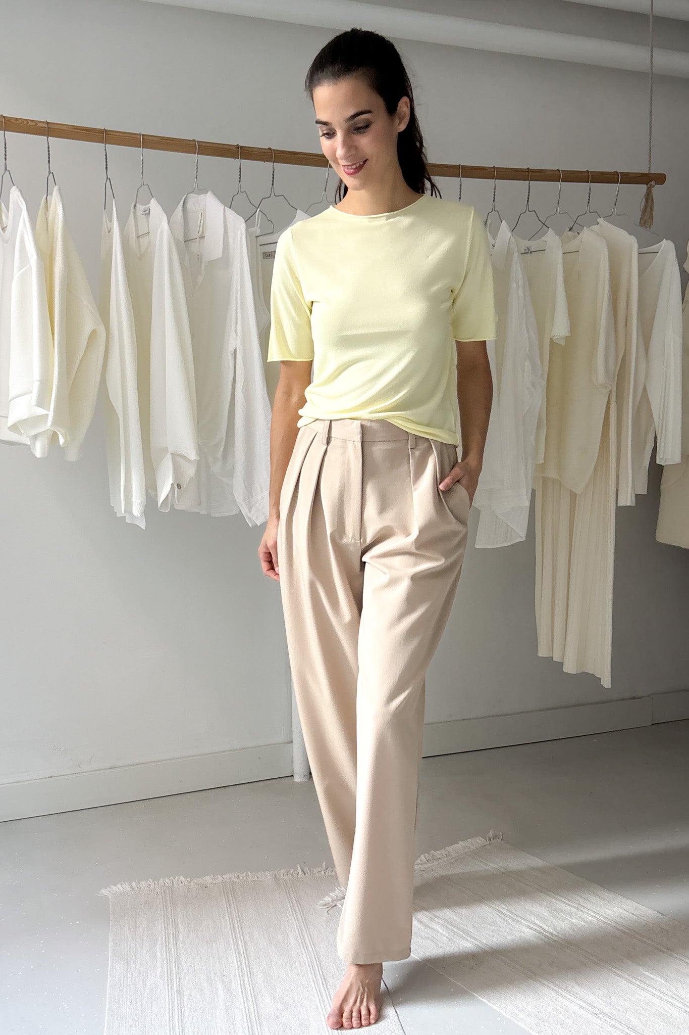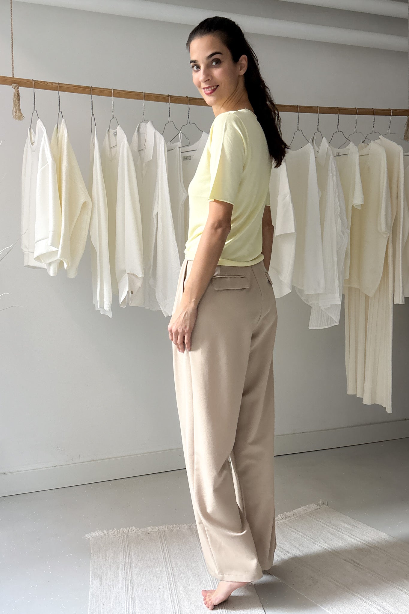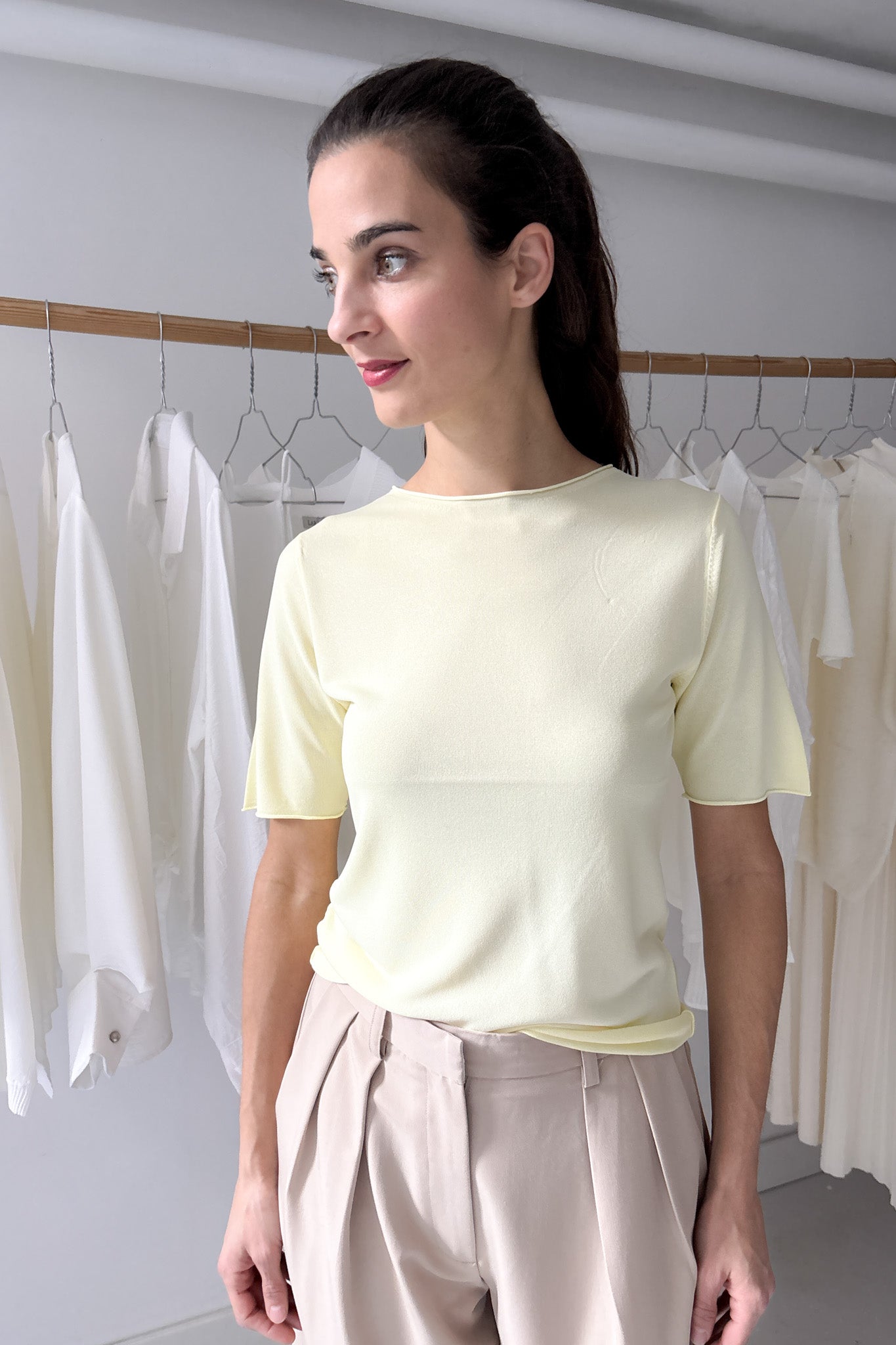 Vékony, finomkötött, rövidujjas felső sárga színben.