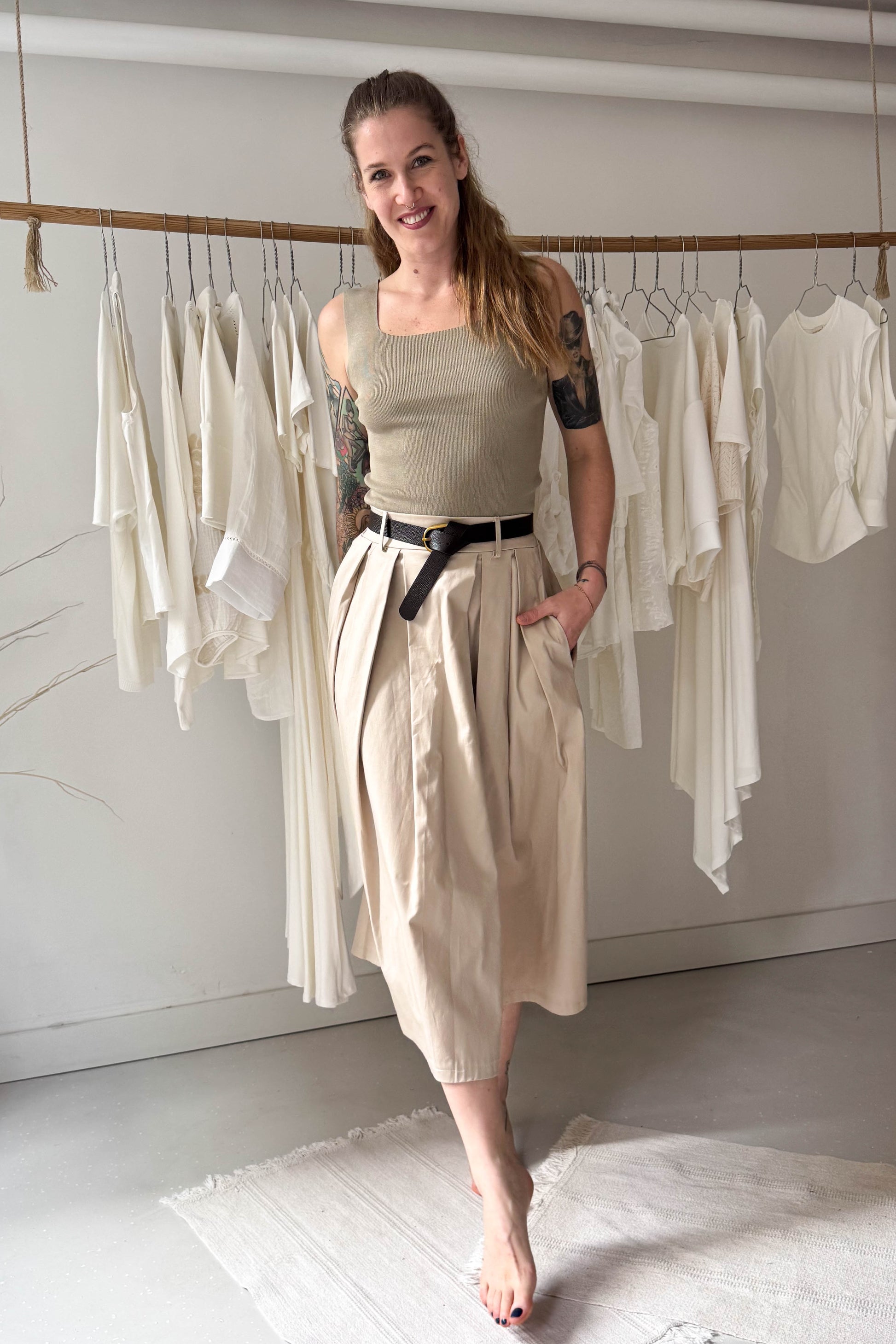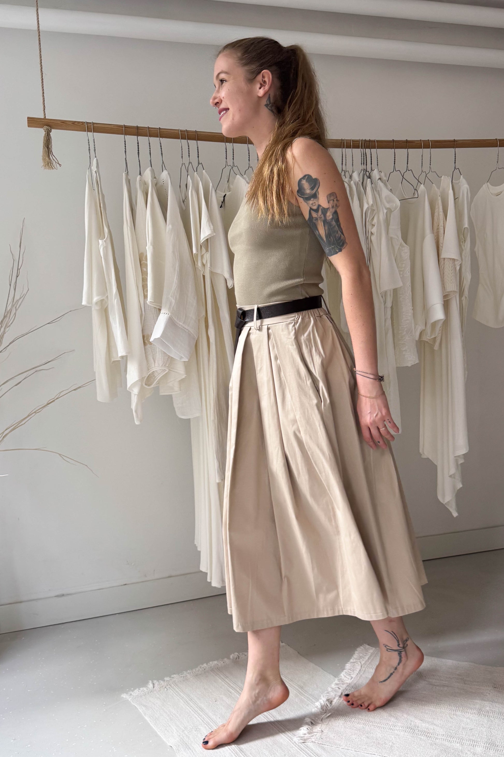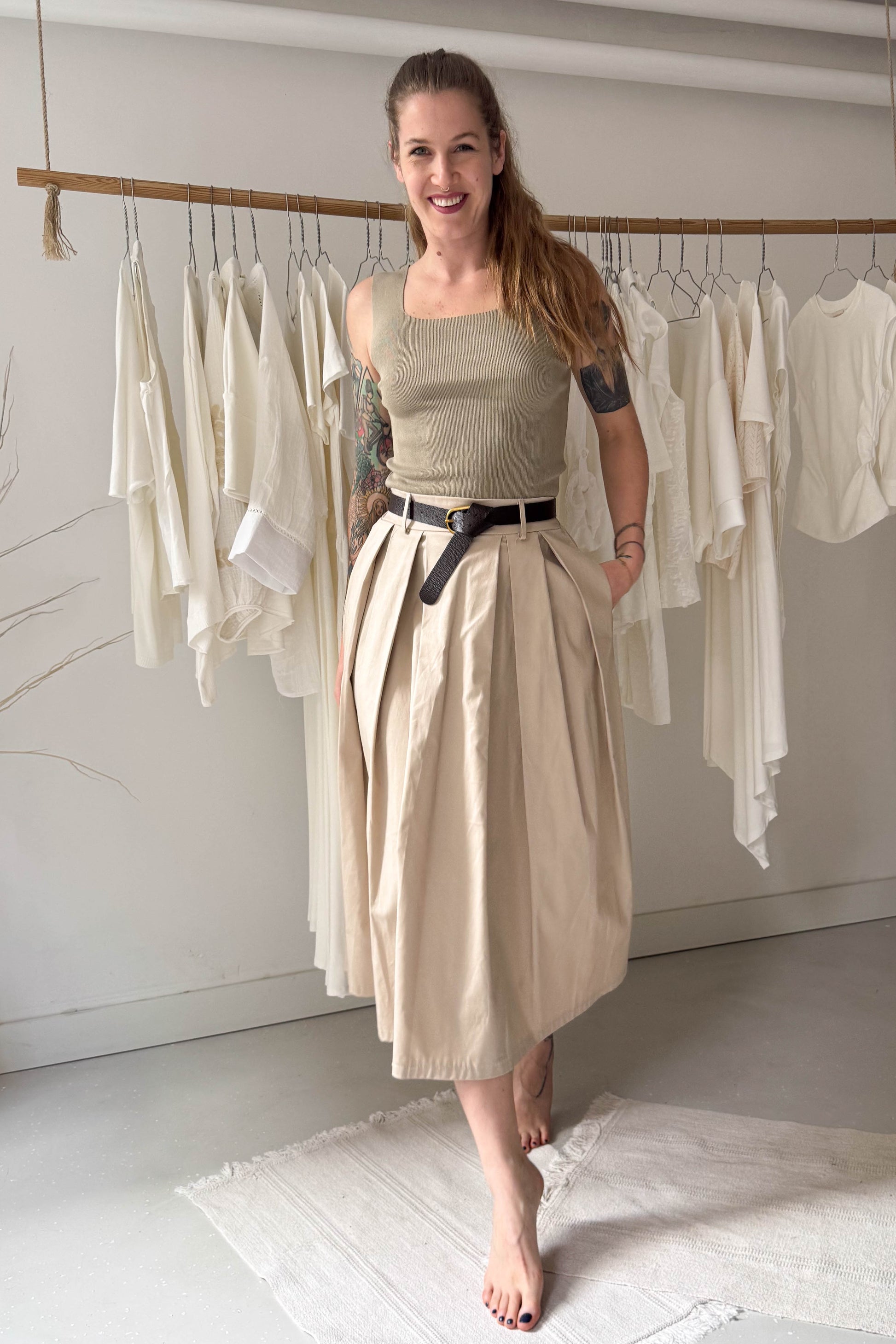 A-vonalú, derékon gumirozott szoknya. Zsebbel és övvel van ellátva.