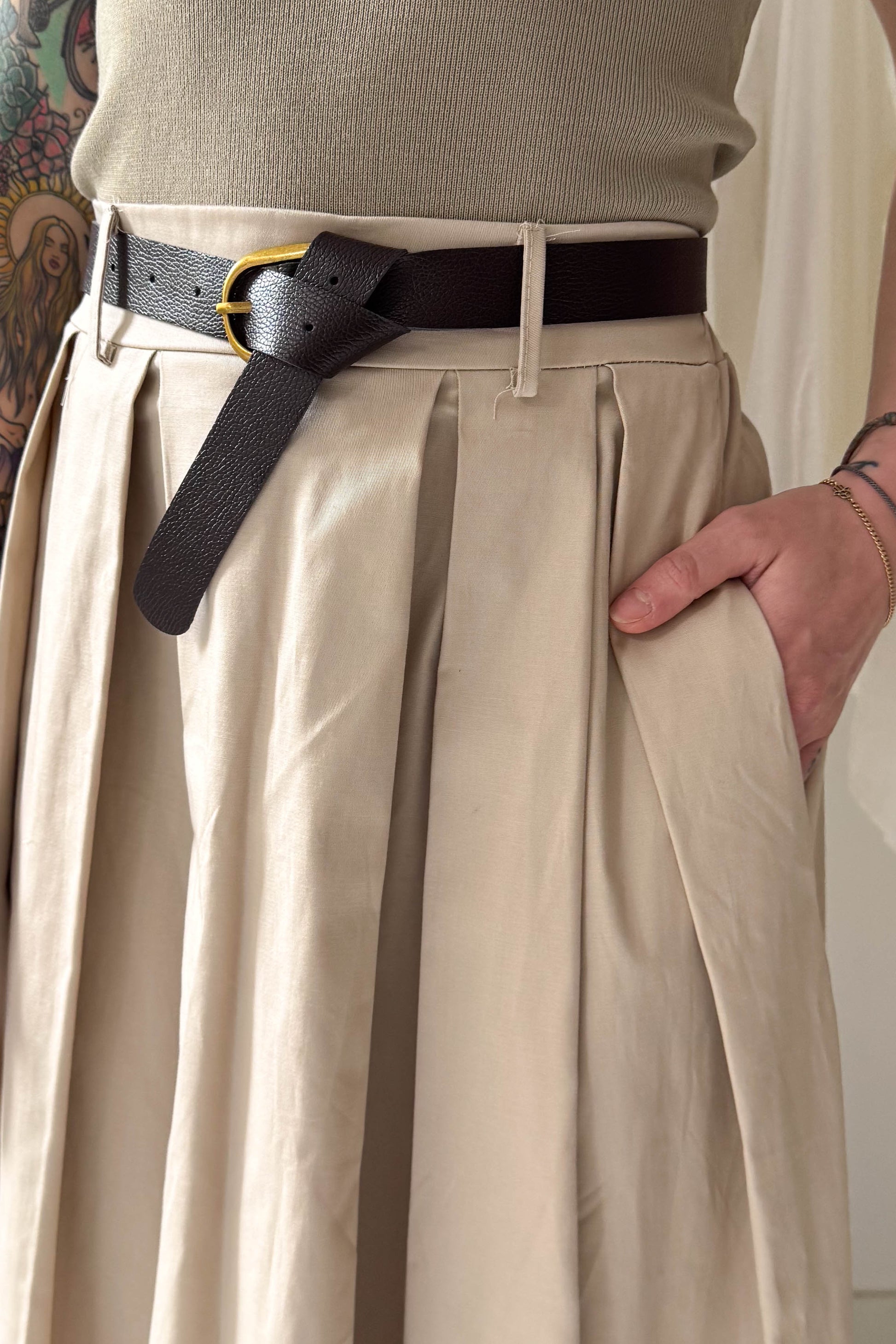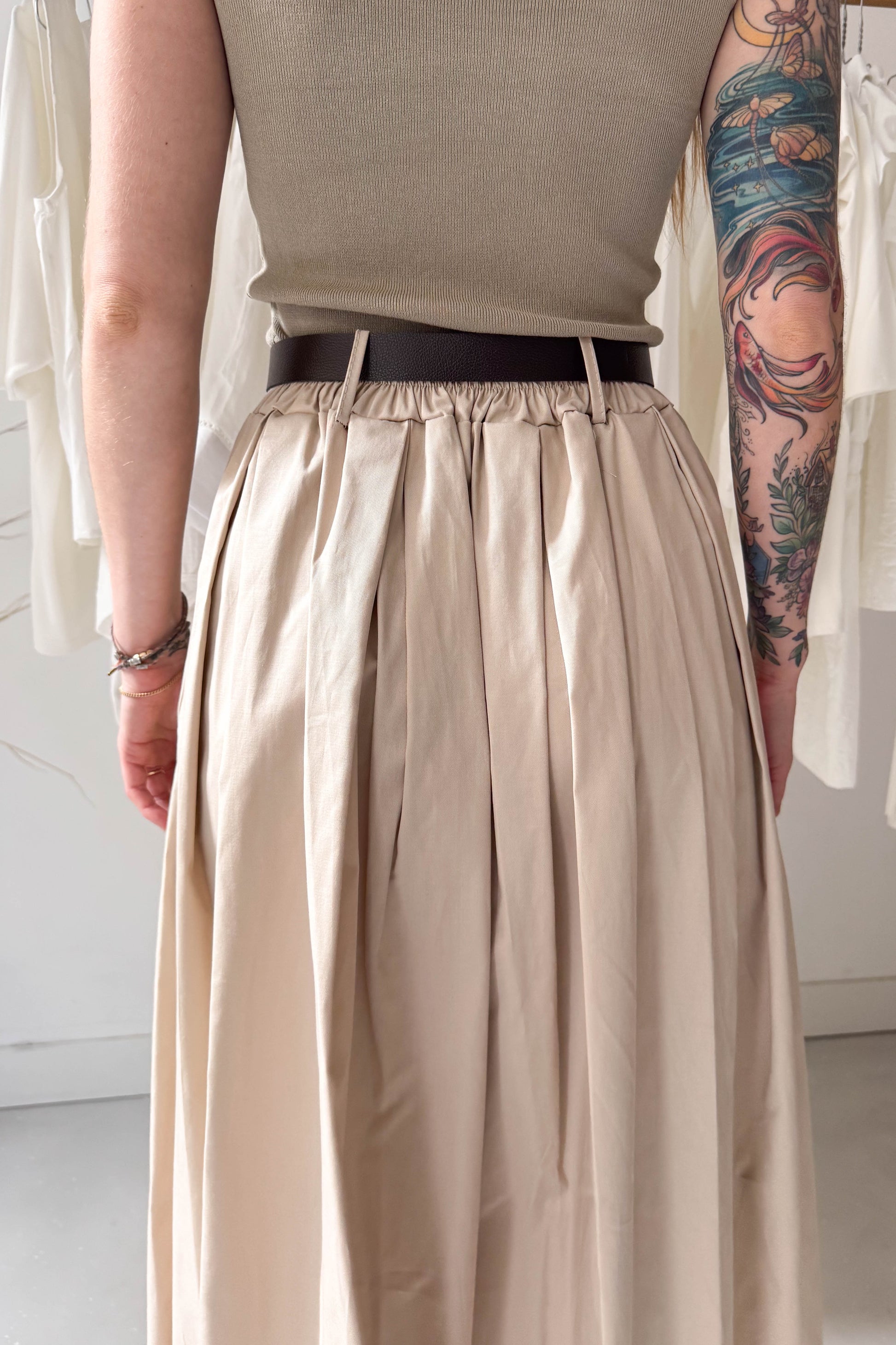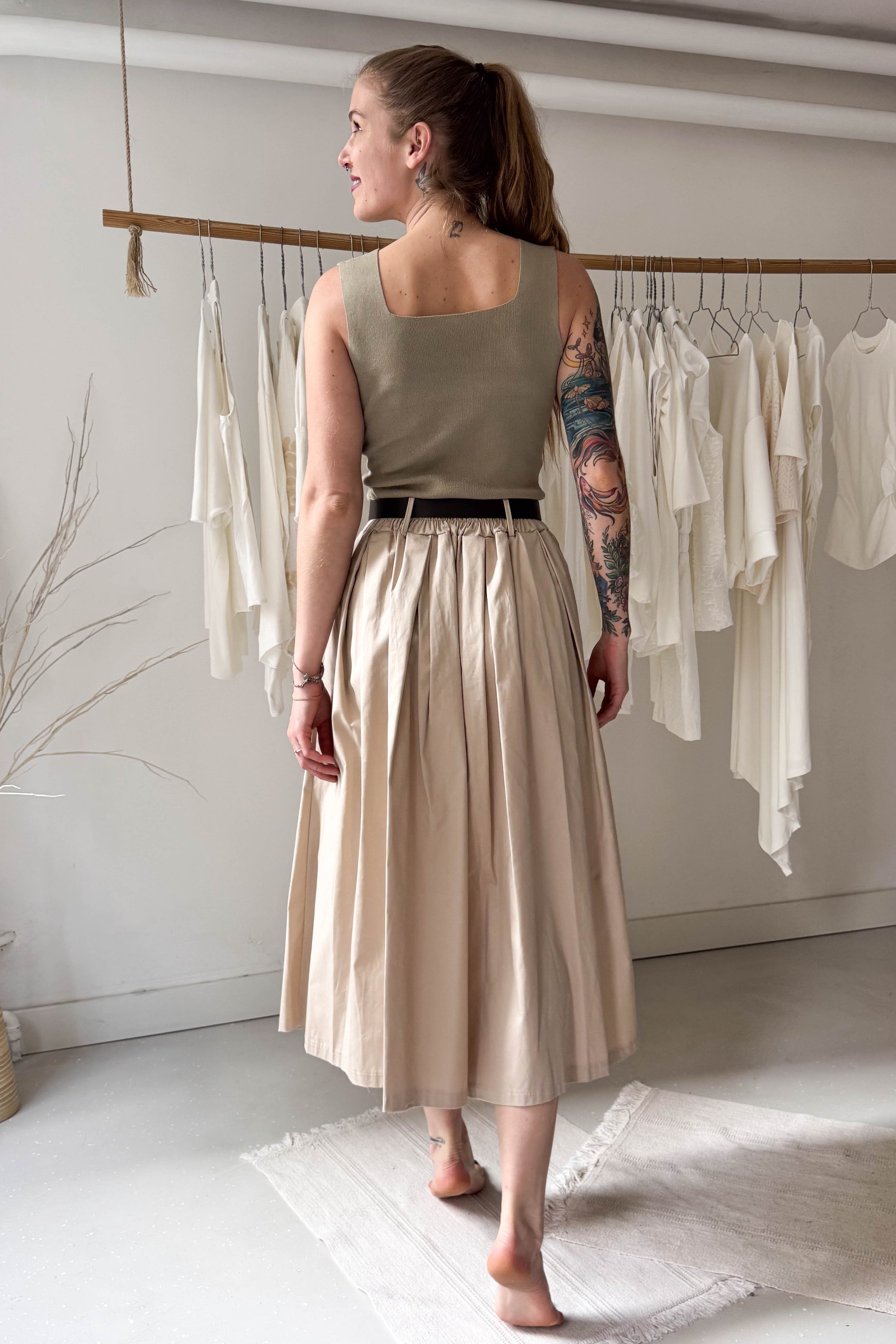 A-vonalú, derékon gumirozott szoknya. Zsebbel és övvel van ellátva.