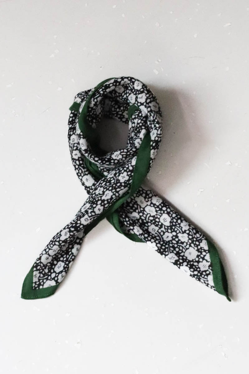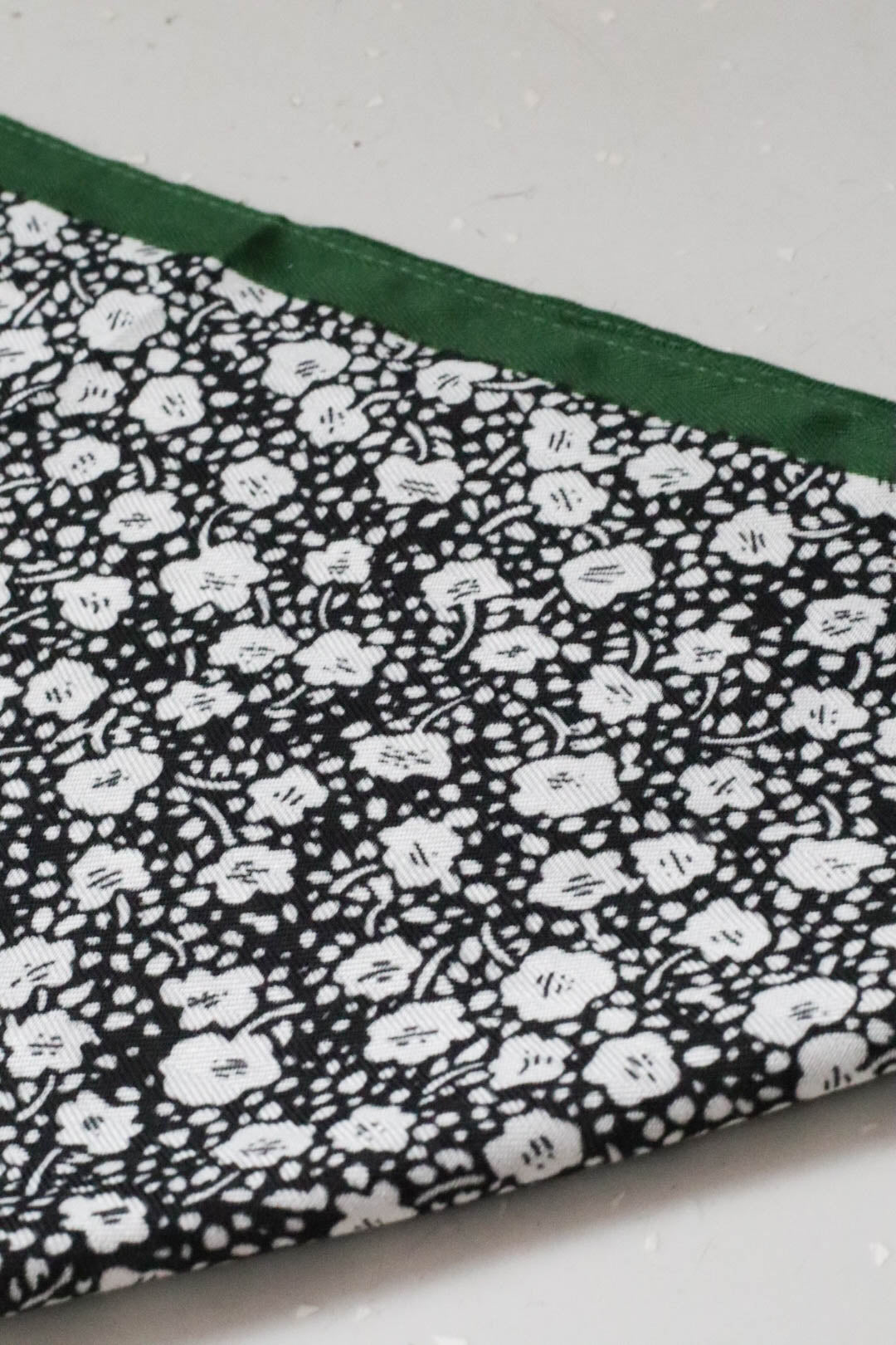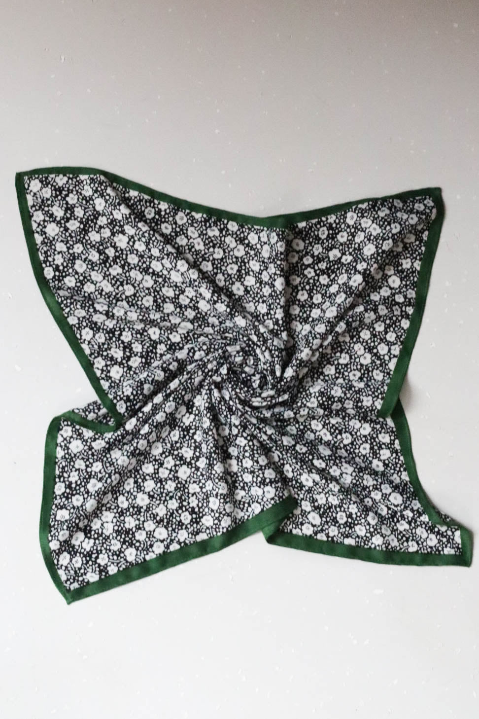 Fekete alapon fehér virágos sál, zöld széllel.