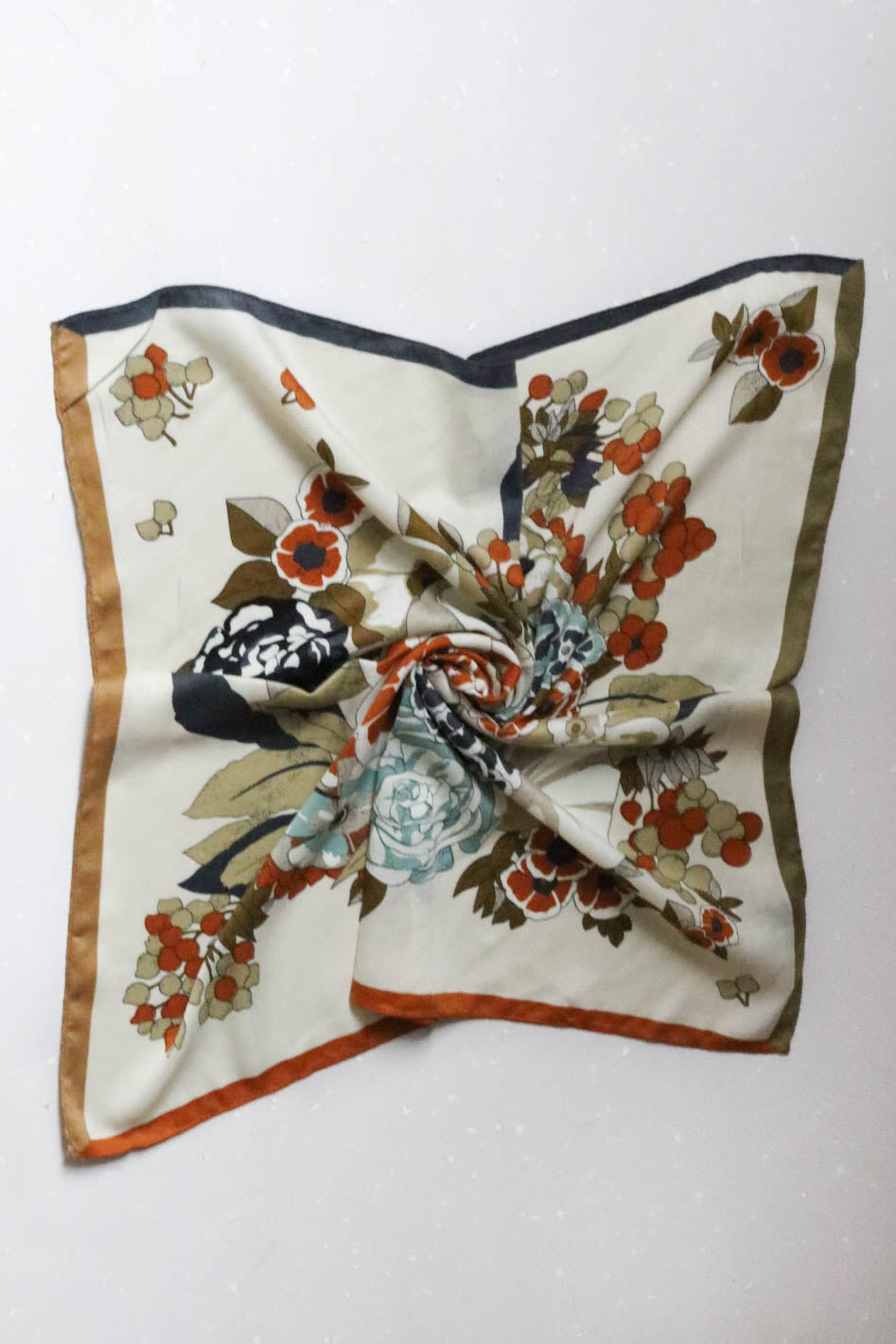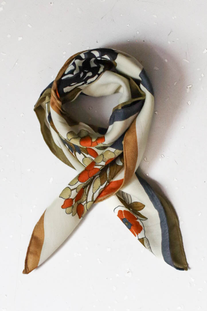 Bézs alapon kék, rozsdabarna, olivazöld virágos sál.
