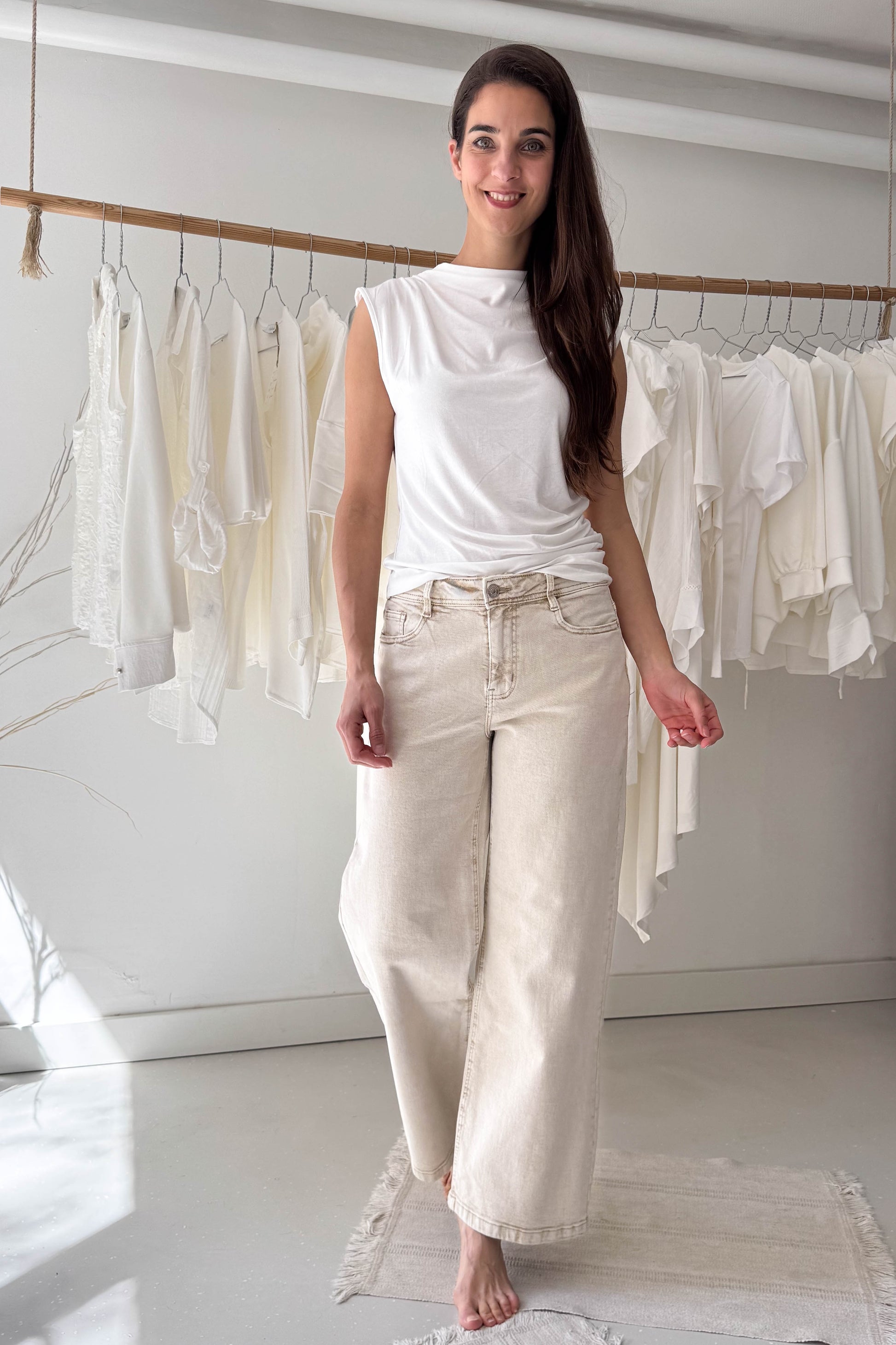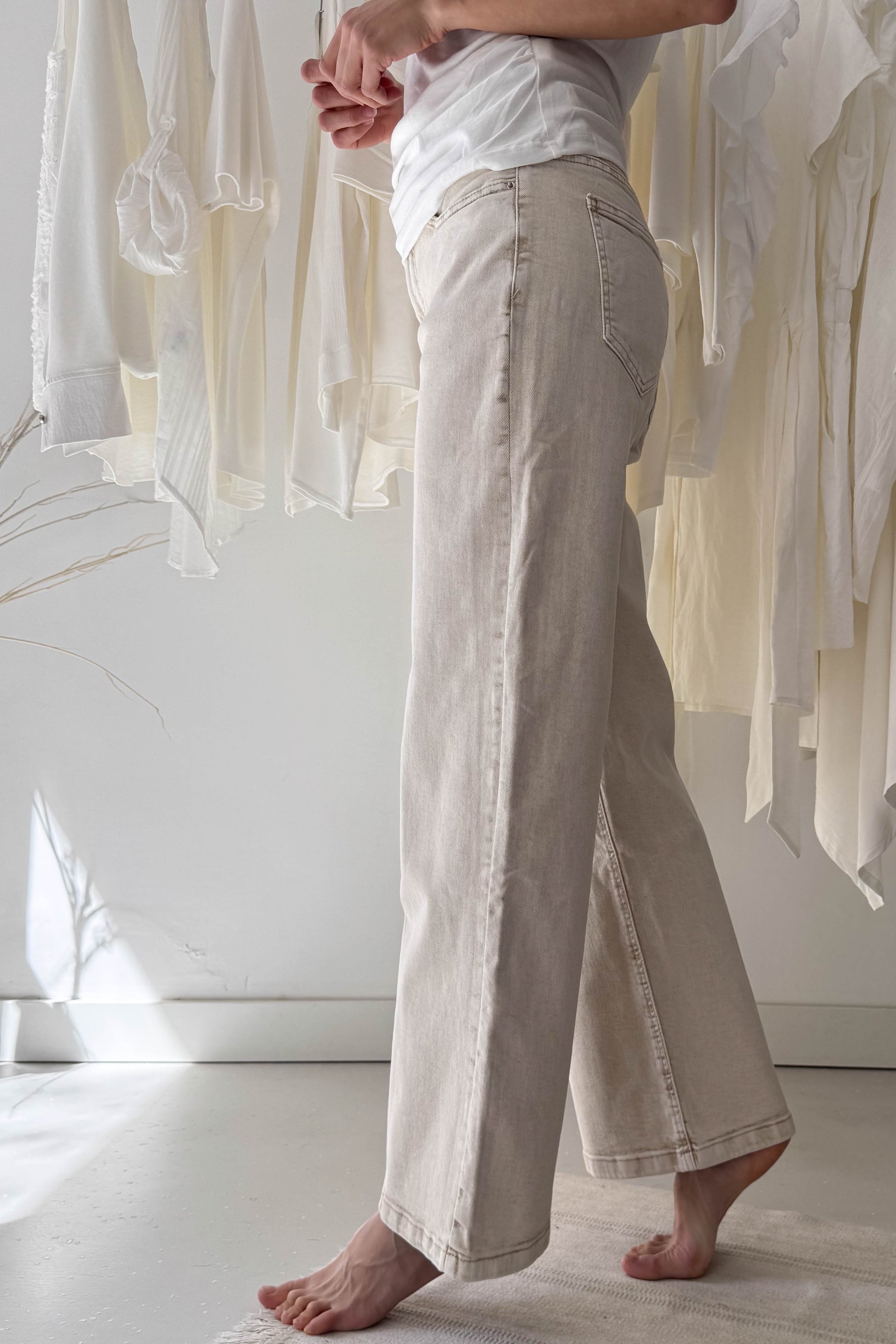 Wide leg fazonú farmer nadrág, bézs színben. Rugalmas anyagú, fokozatosan bővülő A-vonalú szabás.