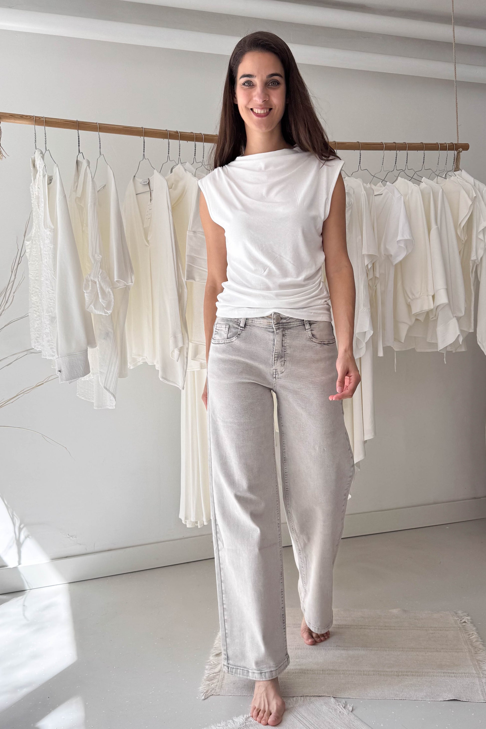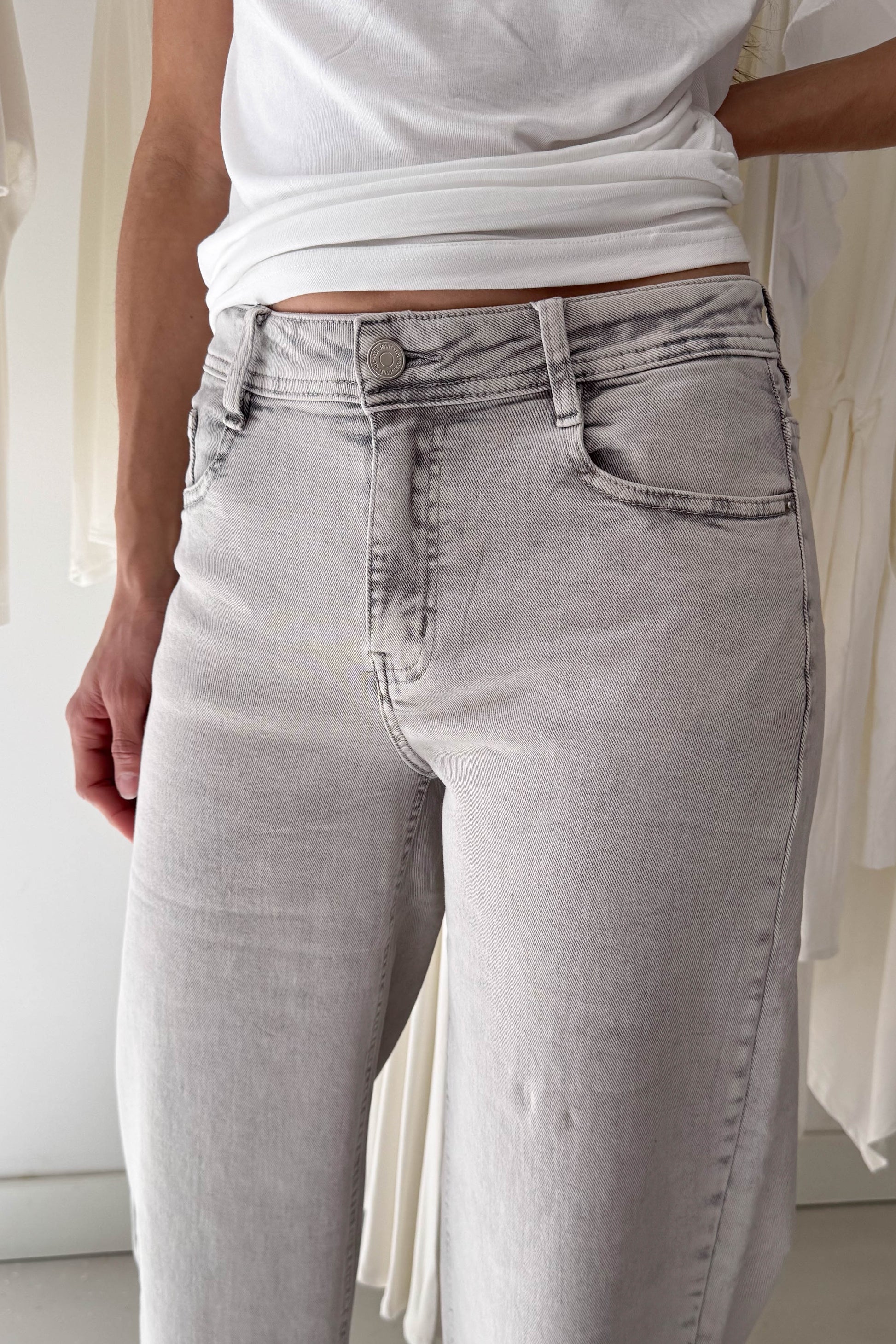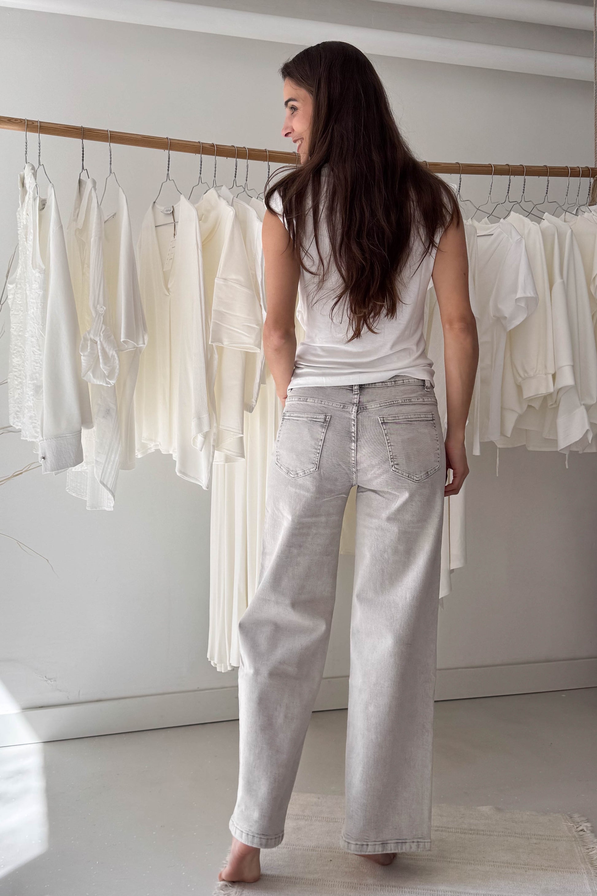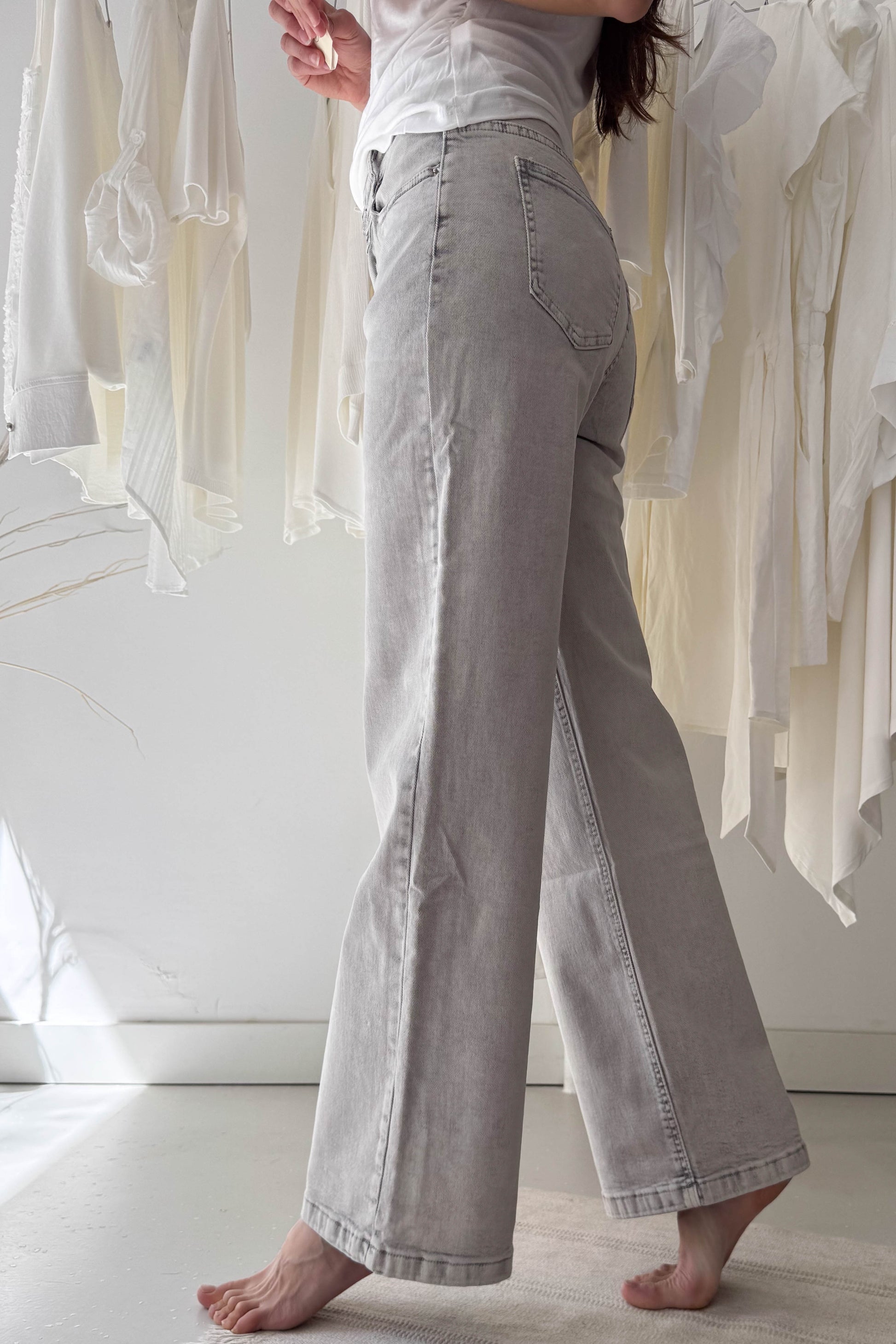 Szürke, wide leg fazonú farmer nadrág. Rugalmas anyagú, fokozatosan bővülő A-vonalú szabás.
